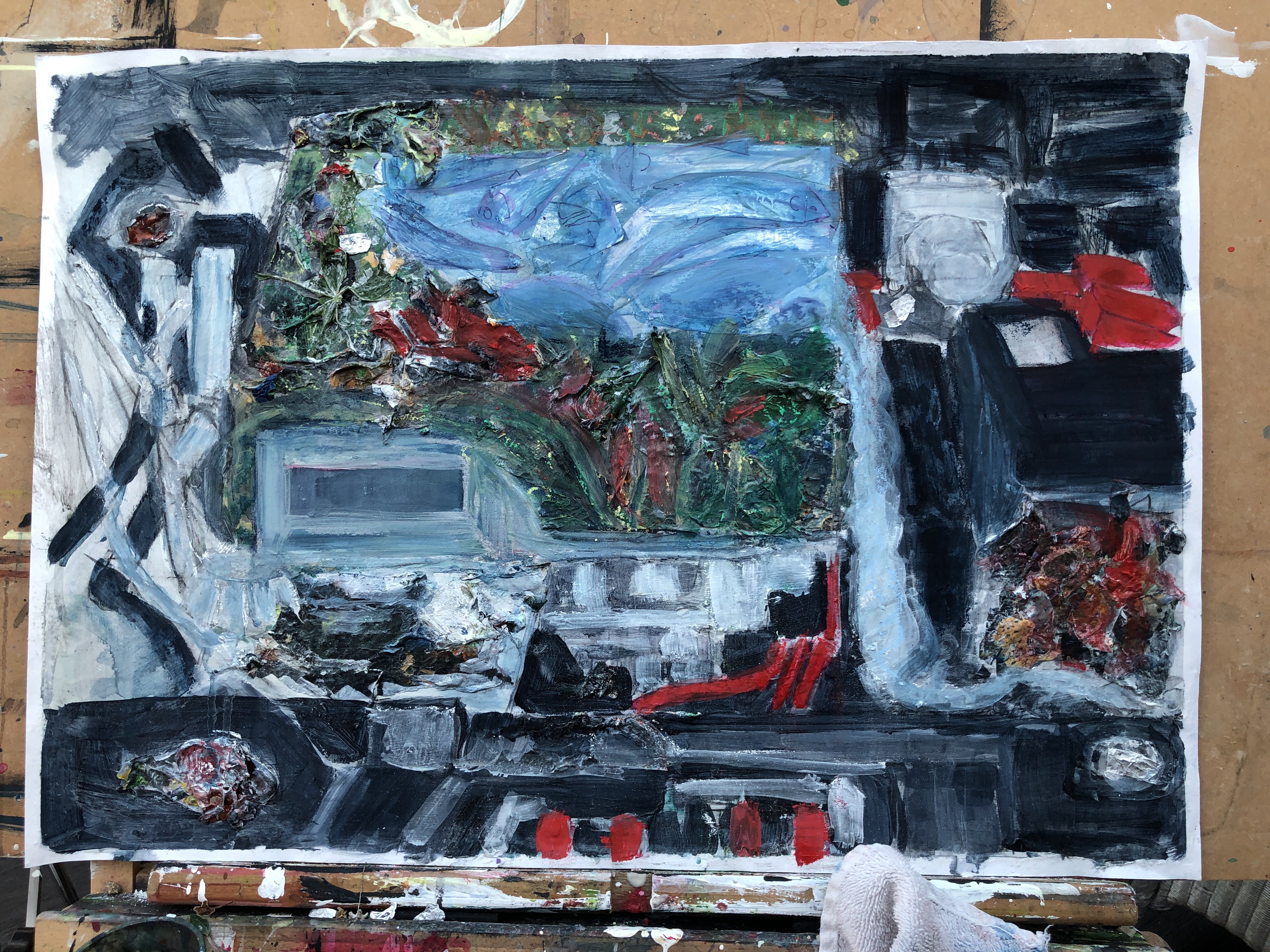 Today’s iteration (September 3rd, 2021) includes some deepening of the dark areas and highlighting with silver acrylic, some of the metallic parts. The mirror foil is becoming fish, as is a piece of solidified paint from my palette at bottom left. I’m reminded of Kandinsky’s fish which have a cartoonish look about them and I think I might riff on that theme. There’s a narrative building from this – a hybrid of fantasised life forms and structural engine parts, although to avoid enraging EV purists, I must point out that there is no actual engine. So far, I can see fish and worms, falling water and foliage, none of which, were it sentient, would be aware of the location of its world.