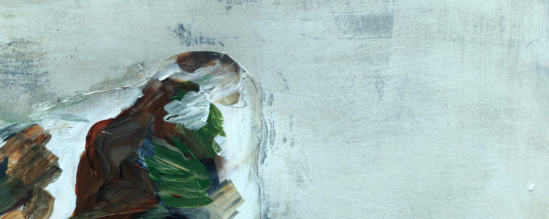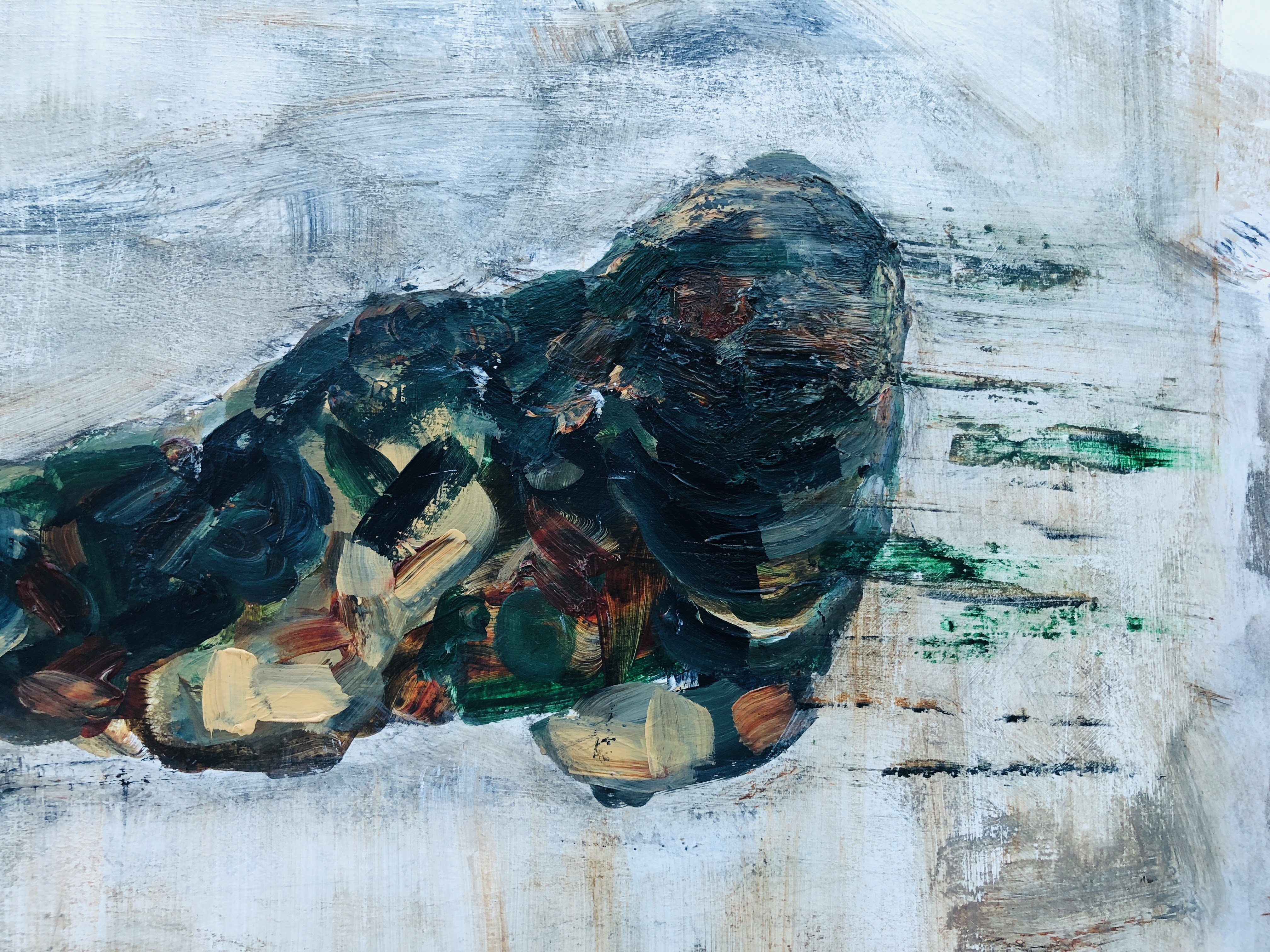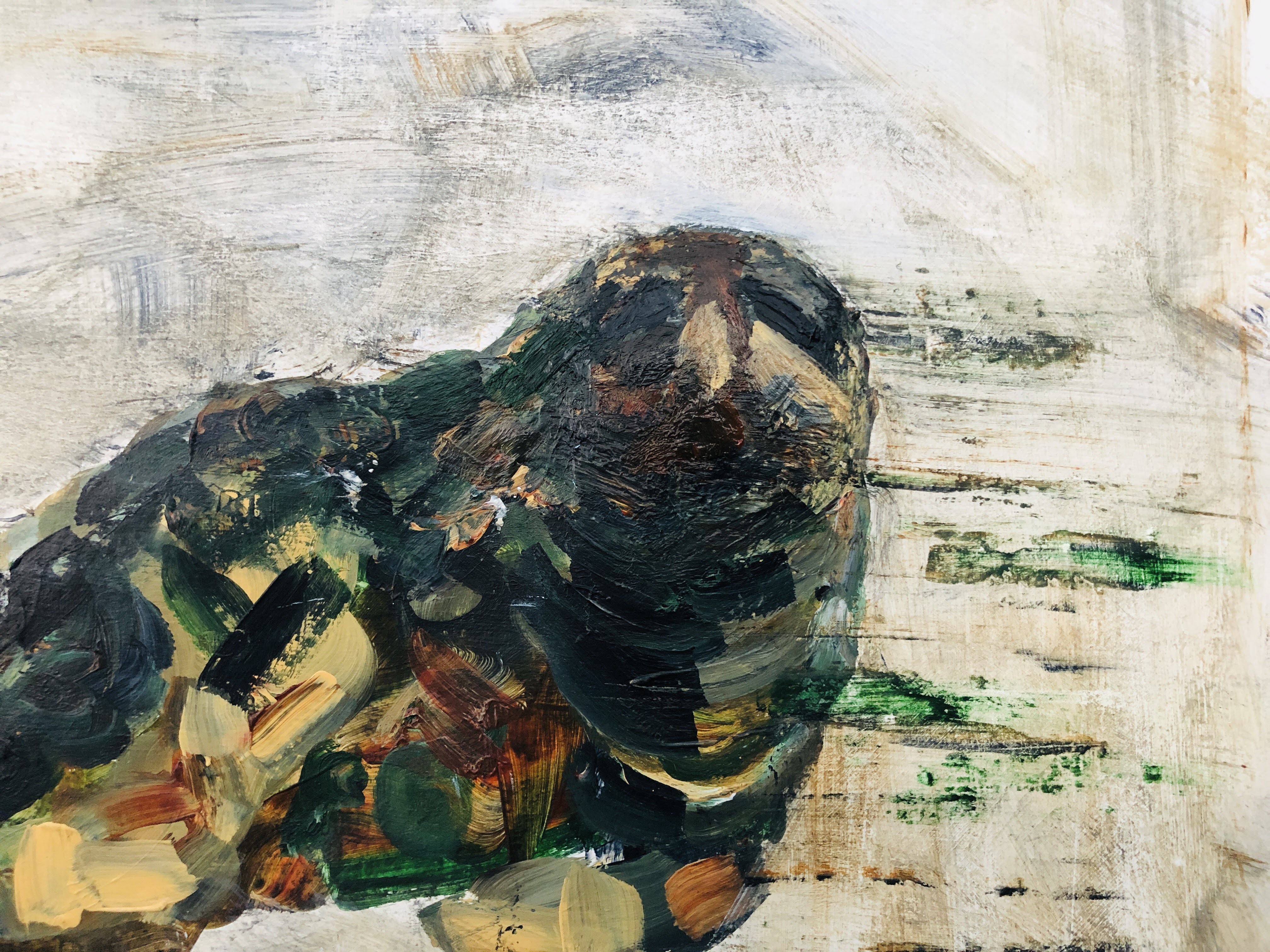 First pass. Following the lines of shadow on the seal rather than its features, I’ve blocked in patches of army camo colours and added a small area of platform for it to be sitting on. I’ve used the dry brush technique to make shapes by removing paint in small trails and twirls, and I was tempted to leave it here; simple and clean.