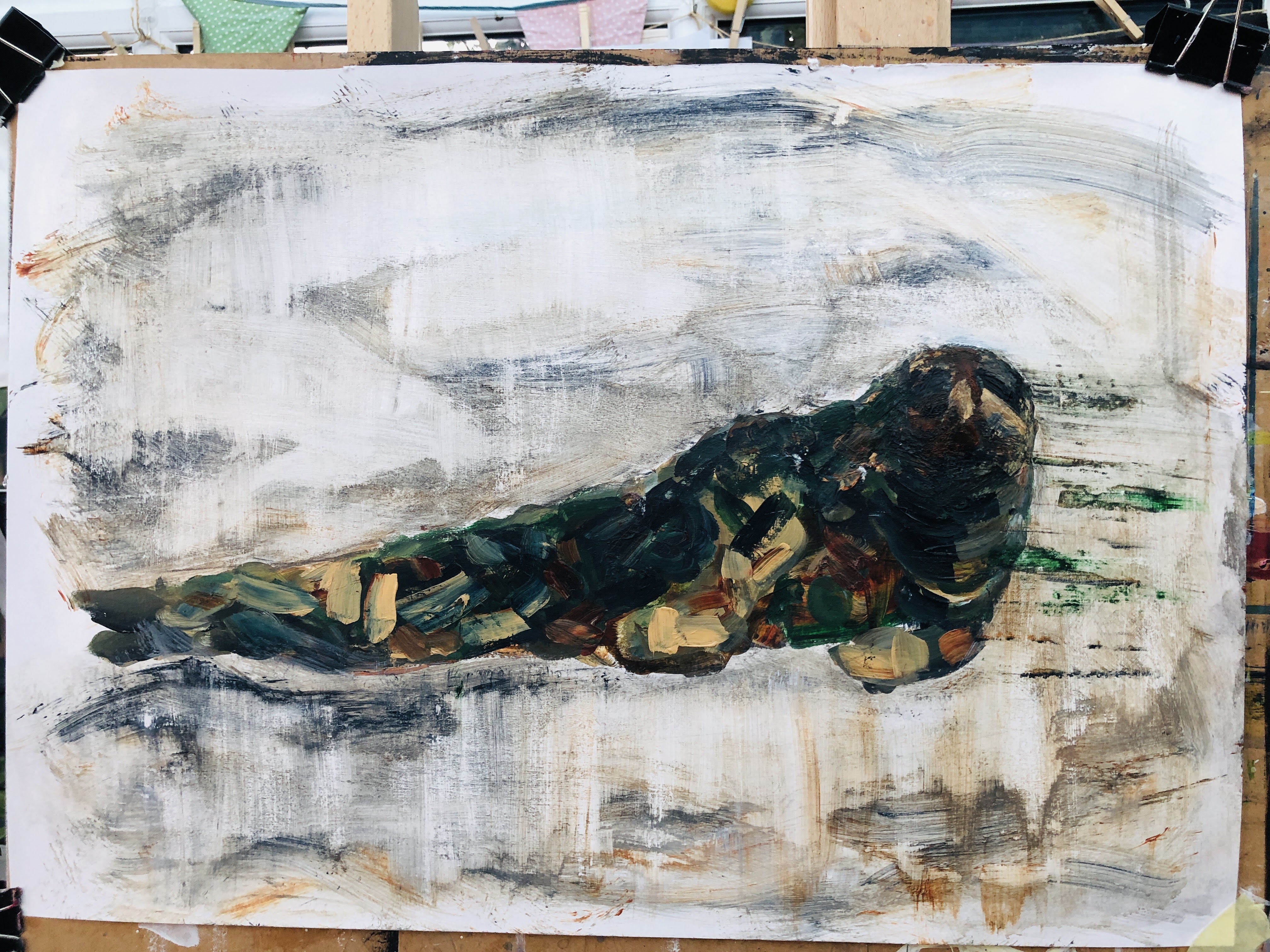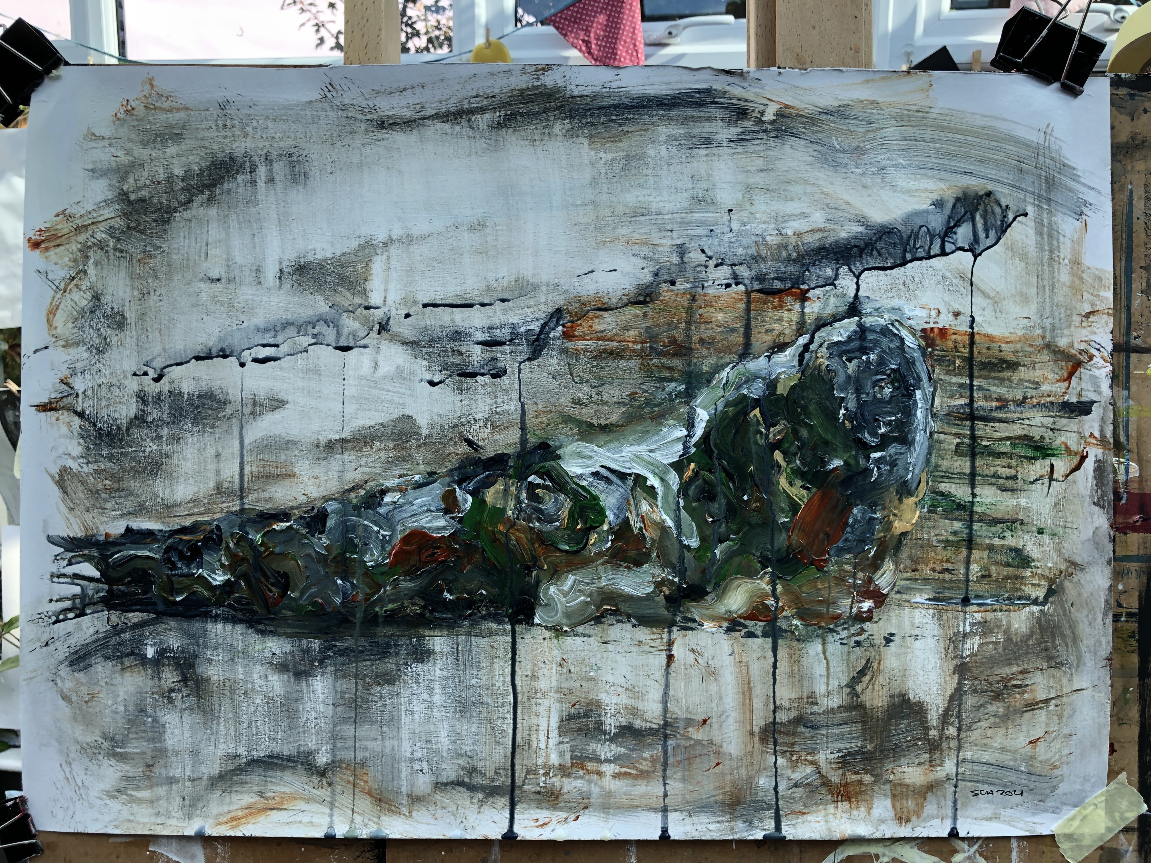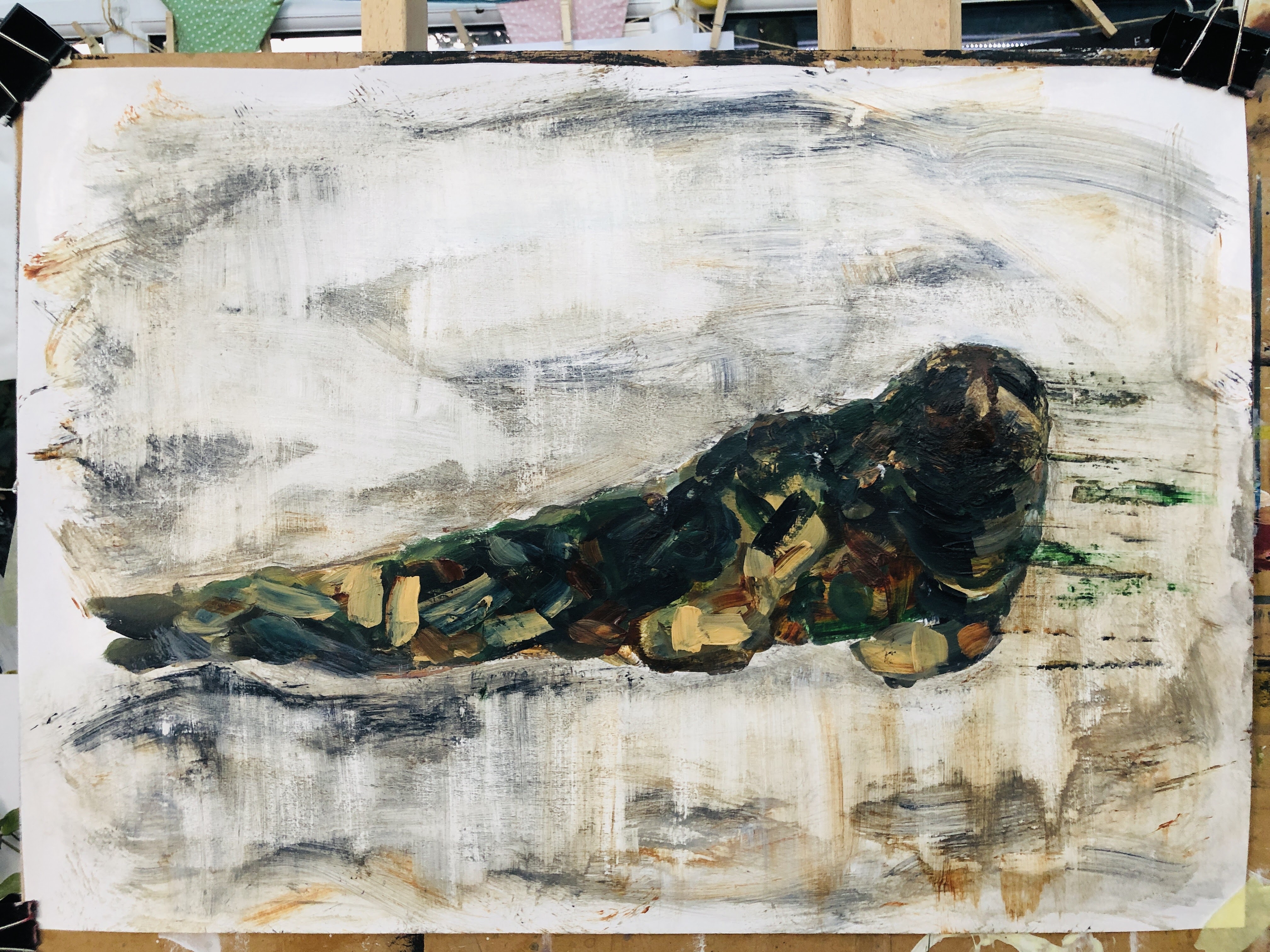 This morphed into drips and dribbles which needed some further scrubbing and paint application. I’m at risk of over-working it now and I need to leave it to dry so I can scrub some of this down to texture and intimation. I like the colours, and I like the military reference. Seals are ideally suited to water and muddy places so often very difficult to spot, which of course is exactly the purpose of military fatigues. The drips recall the shadow/shape baffling webbing placed over tents and tanks and, below, I’ve also broken up the image with horizontal lines then pulled wet paint down in some of the rectangles. This recalls pixilation, another disrupter of shape and features.