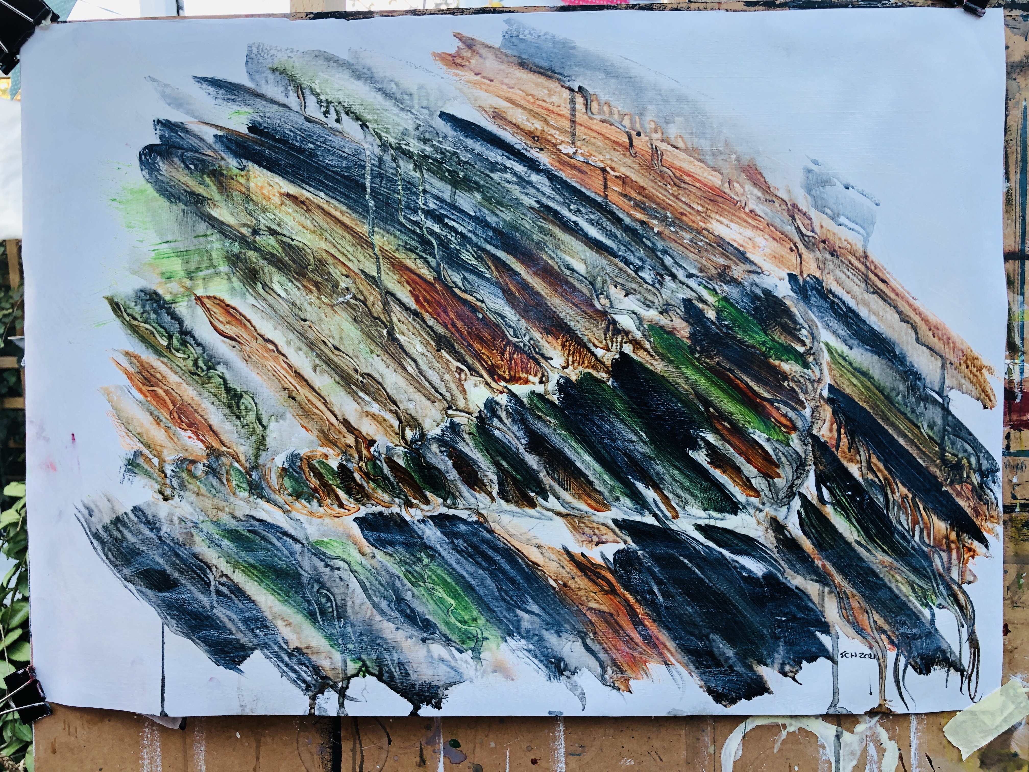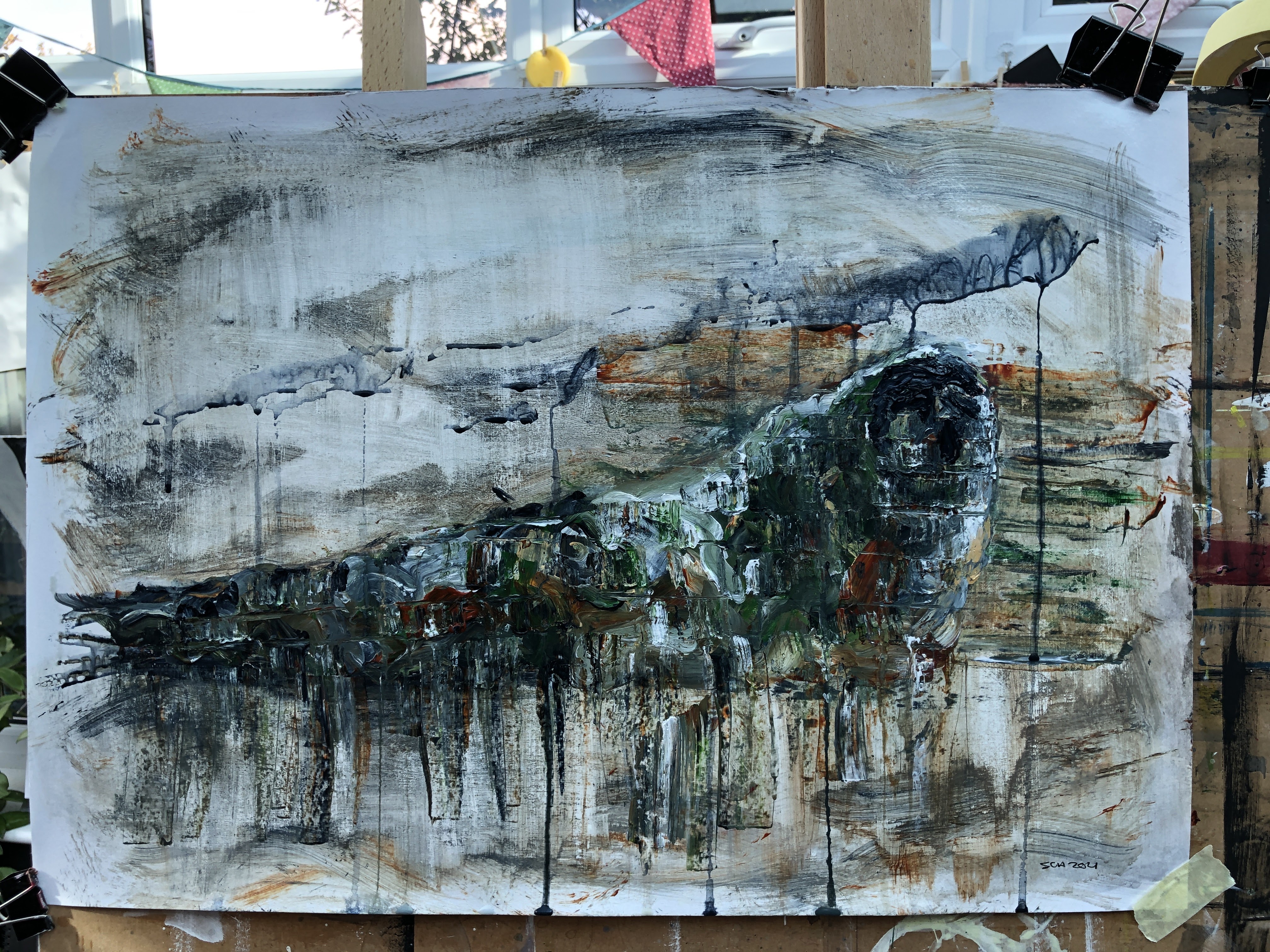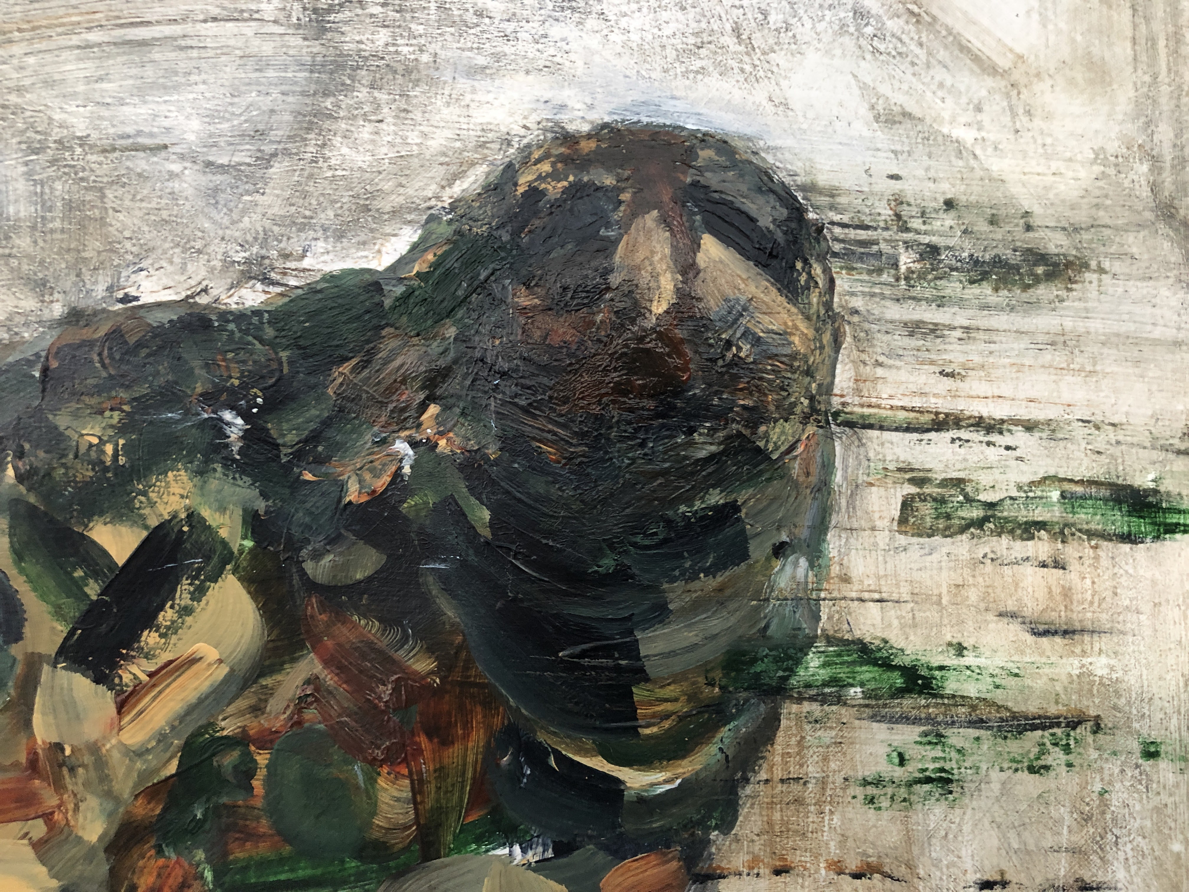 This morphed into drips and dribbles which needed some further scrubbing and paint application. I’m at risk of over-working it now and I need to leave it to dry so I can scrub some of this down to texture and intimation. I like the colours, and I like the military reference. Seals are ideally suited to water and muddy places so often very difficult to spot, which of course is exactly the purpose of military fatigues. The drips recall the shadow/shape baffling webbing placed over tents and tanks and, below, I’ve also broken up the image with horizontal lines then pulled wet paint down in some of the rectangles. This recalls pixilation, another disrupter of shape and features.