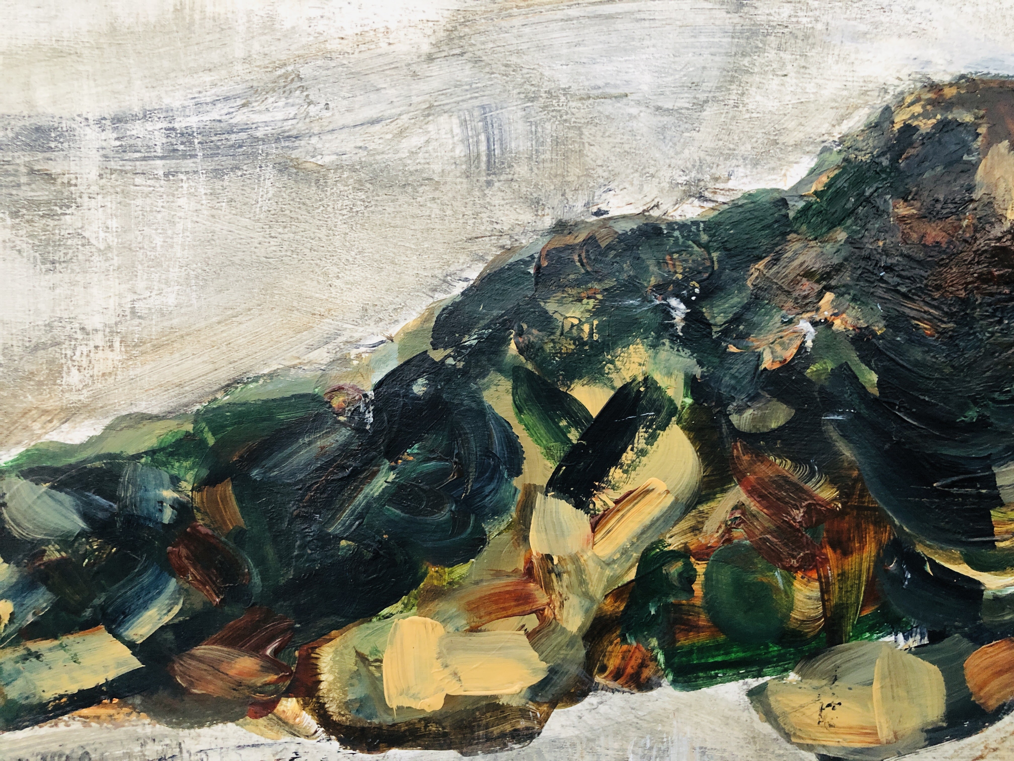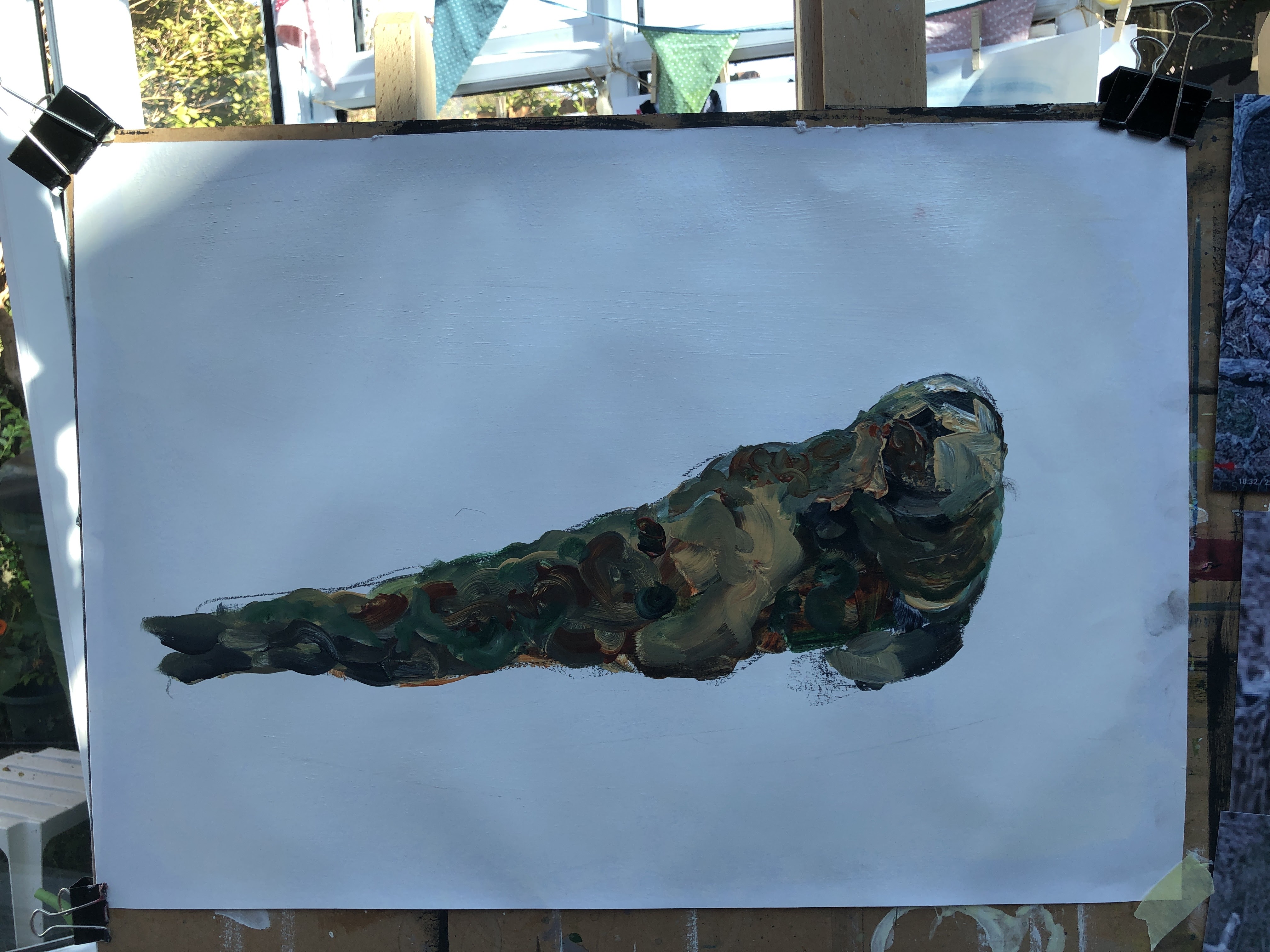 These are quasi military colours, designed to camouflage soldiers in a European countryside. My seal is becoming the countryside because I can see hills and meadows in the patterns, achieved by brush-dancing (twiddles and swirls) over the gloss surface, but I risk over-working it if I get too deeply involved in that. The simplest thing will be to allow these layers to dry then pareidol a face into it. I think for a minimalist back ground, I might just draw some very straight, architectural, horizontal lines to intimate the shelf the seal is hauled up on, and a couple of levels of bank behind.