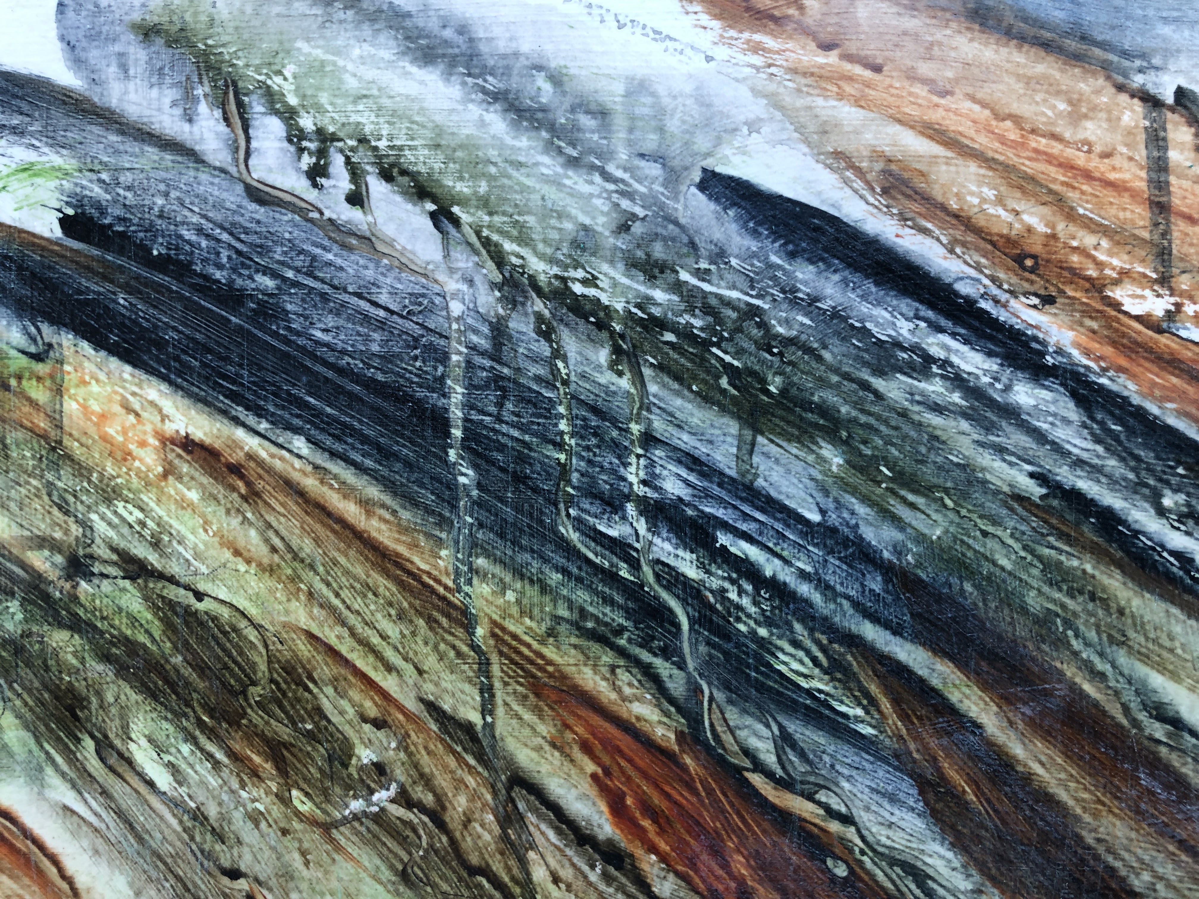 After a further layer of gloss varnish, I washed some of the painting, top and bottom, with T white to mute the lines a little and to suggest distance (top) and water (bottom). Then when it was dry, I scrubbed it with a rough flannel – old paint fused into the cloth is ideal – to reveal textures.