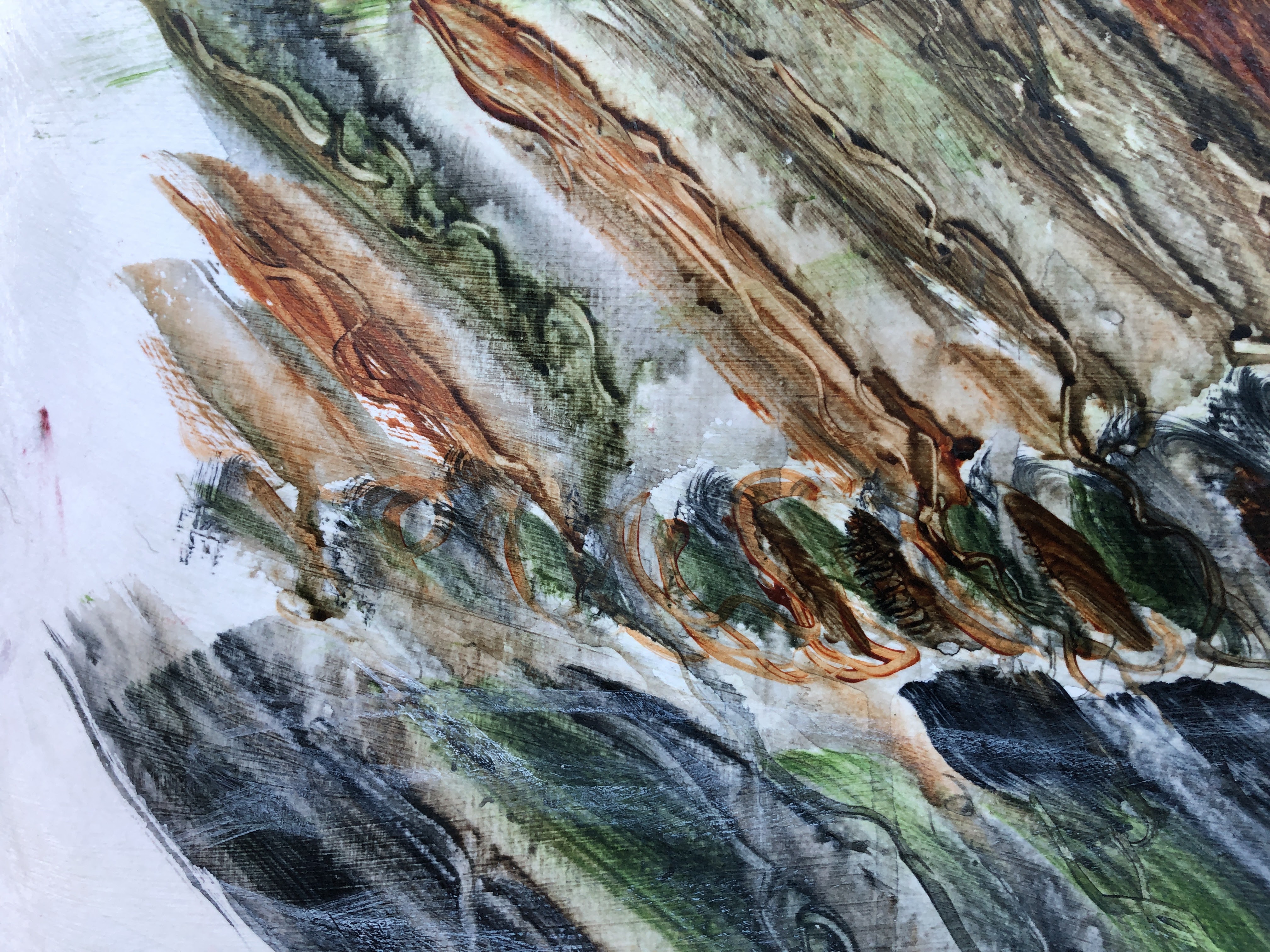 The new marks are dribbles of dilute paint that follow ridges of thicker medium. I’ve followed these actively with a small round brush which had the effect of trailing pigment around the surface, and also reducing it in small channels. In the image below, I’ve used a small air blower (for removing debris from keyboards) to push dilute medium around so it makes tiny tendrils. The effect I was looking for is a kind of fantasy landscape of roots and the tracks of small animals such as worms.