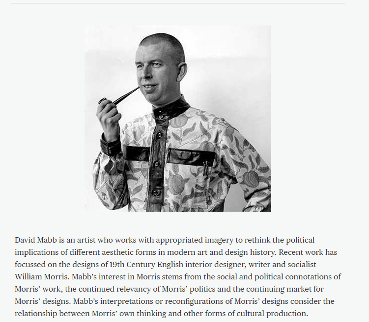Video dated 2014. Mabb really likes his William Morris! In one room of this exhibition, he’s taken a Morris book which he says is very backward-looking in terms of its sources of inspiration, and overlaid it with images from a Russian book which exemplifies the new constructionist era that was keen to cast away the past entirely. In another, there is much more delicate work which uses Morris patterns from his wallpaper books and picks out detail within squares or circles. But unlike a kind of tondo tunnel, some of the detail leaks out over the boundary. Complex and intricate.