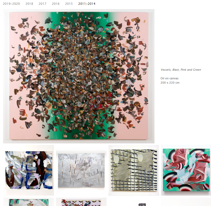 There is some overlap between the digital and the physical, or maybe purposeful integrative glitching going on in Zhang’s work. She deliberately pixelates with paint and refers to the contrast of experience between viewing on-screen and in person. The is repetition and symmetry alongside disconcerting ‘faults’.