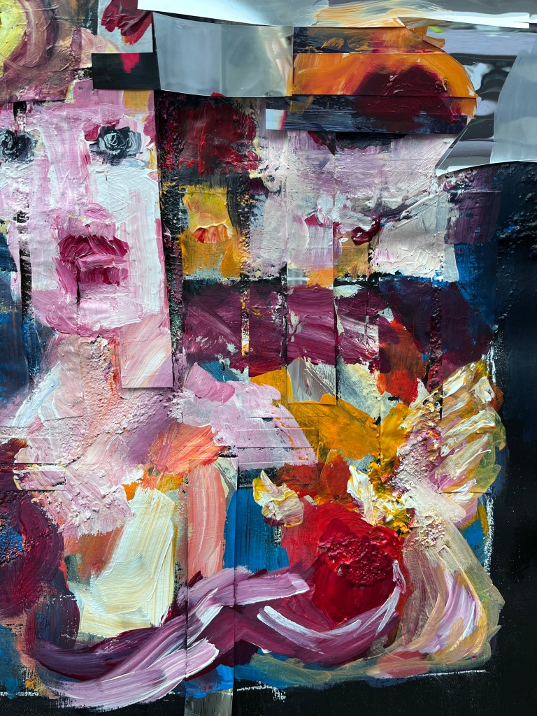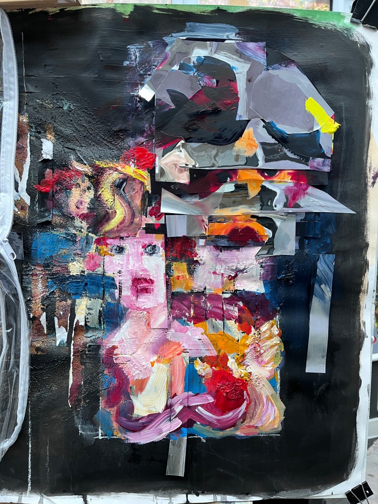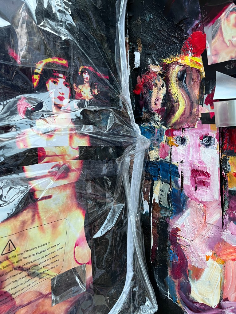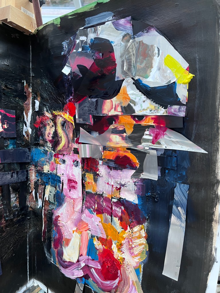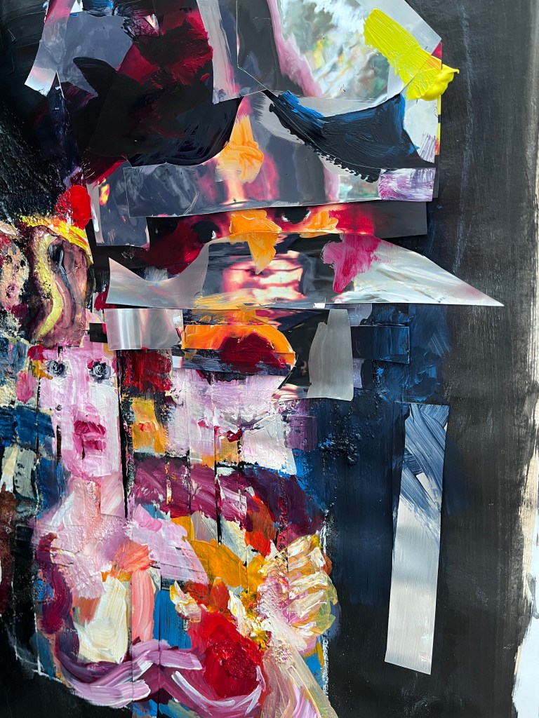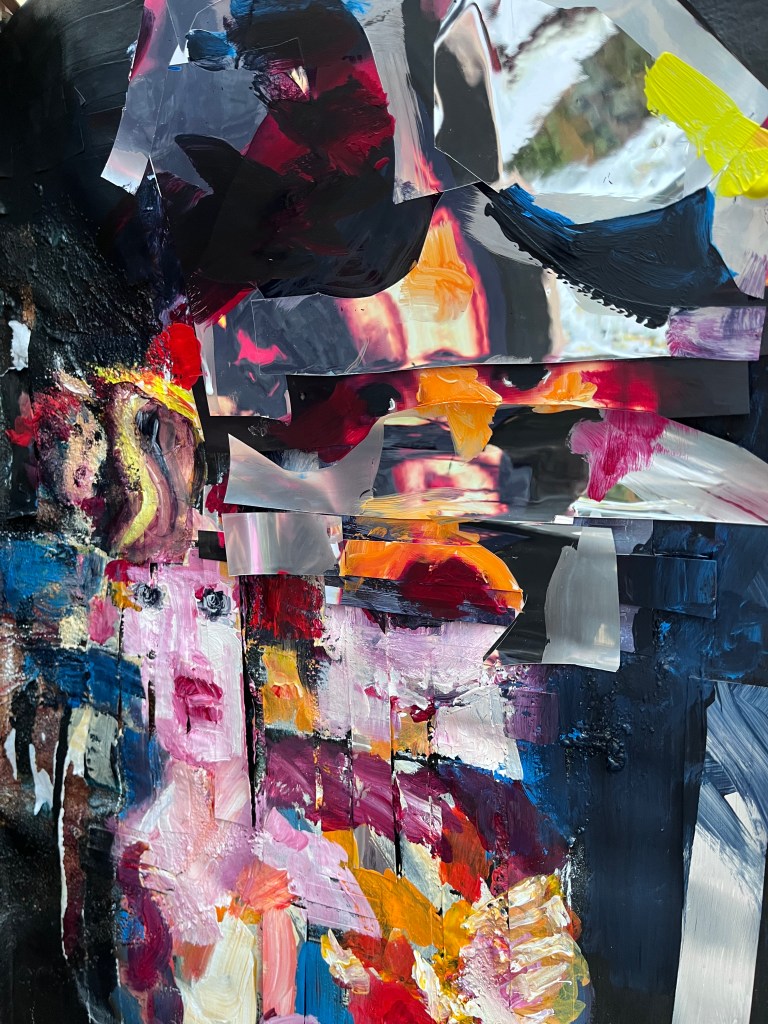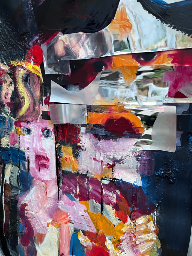 On the right are painted in faces and collaged painted over faces interspersed with mirror foil. The faces are distorted and seem to be trying to escape or tell the viewer something important, and the mirror foil, as viewed head-on, reflects the viewer back to themself.