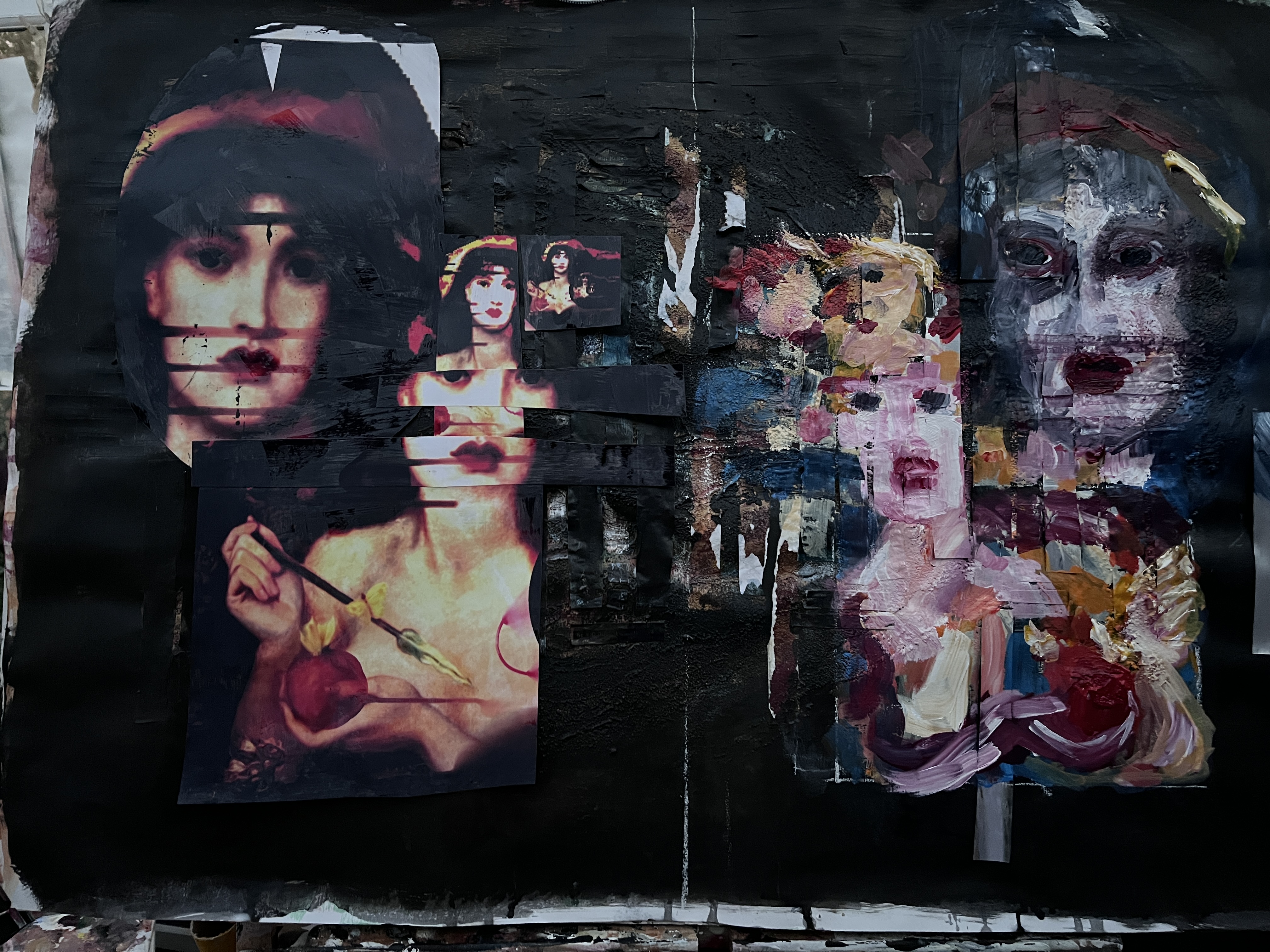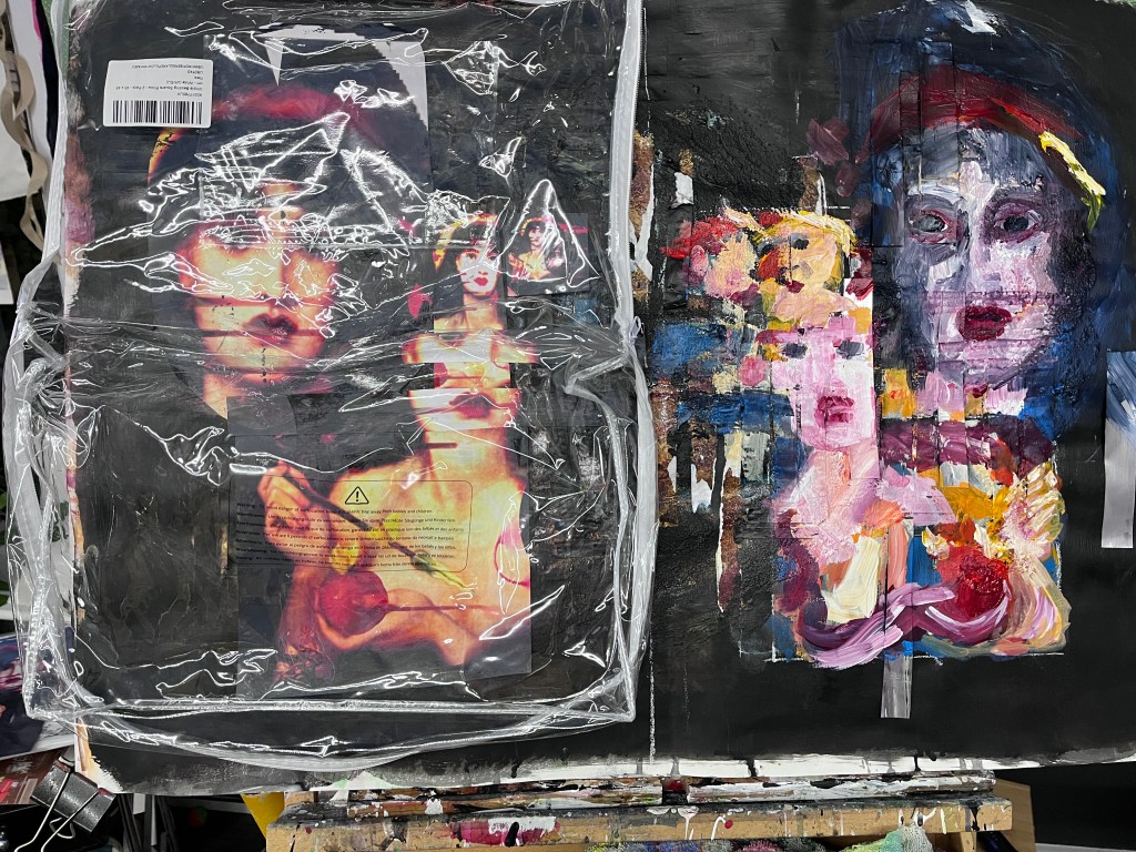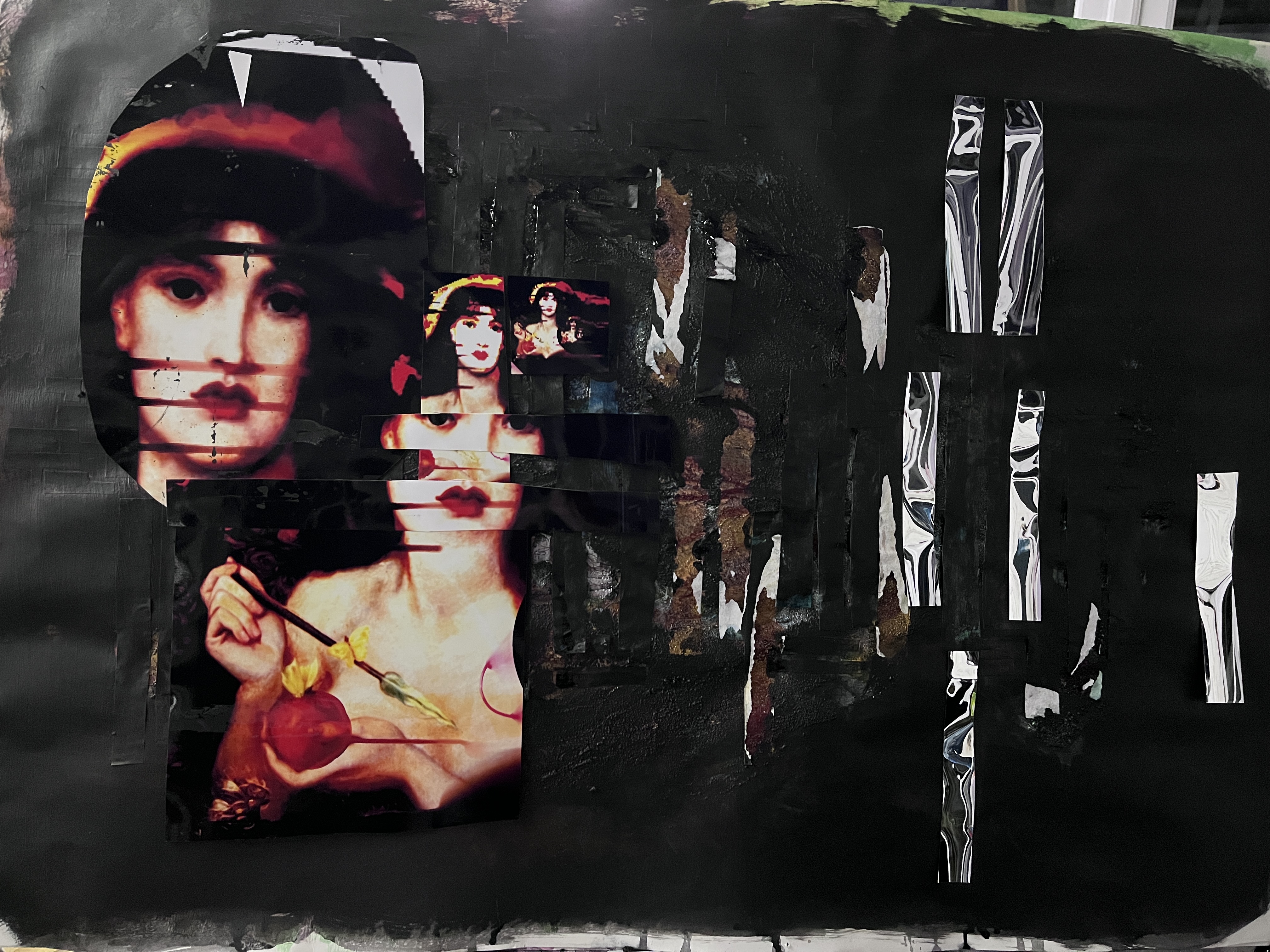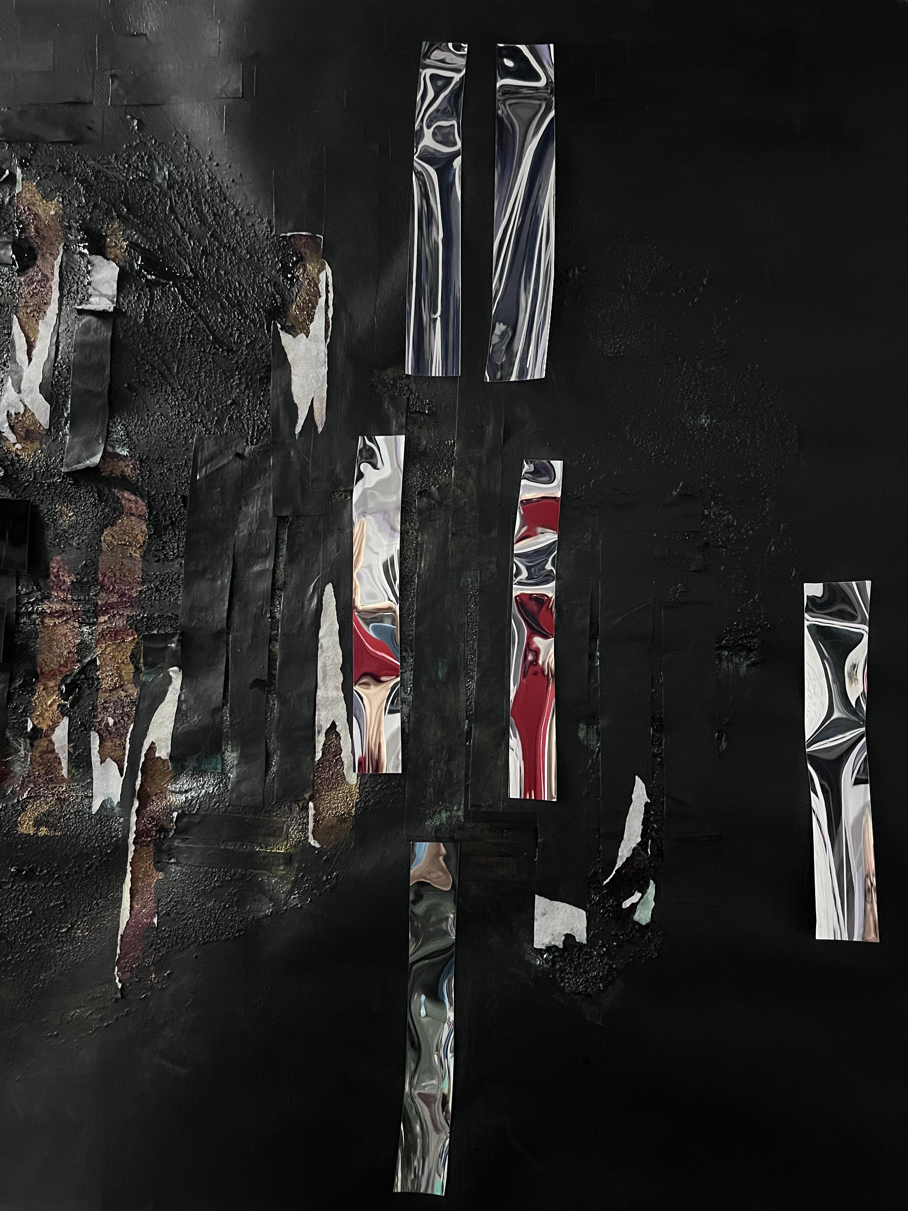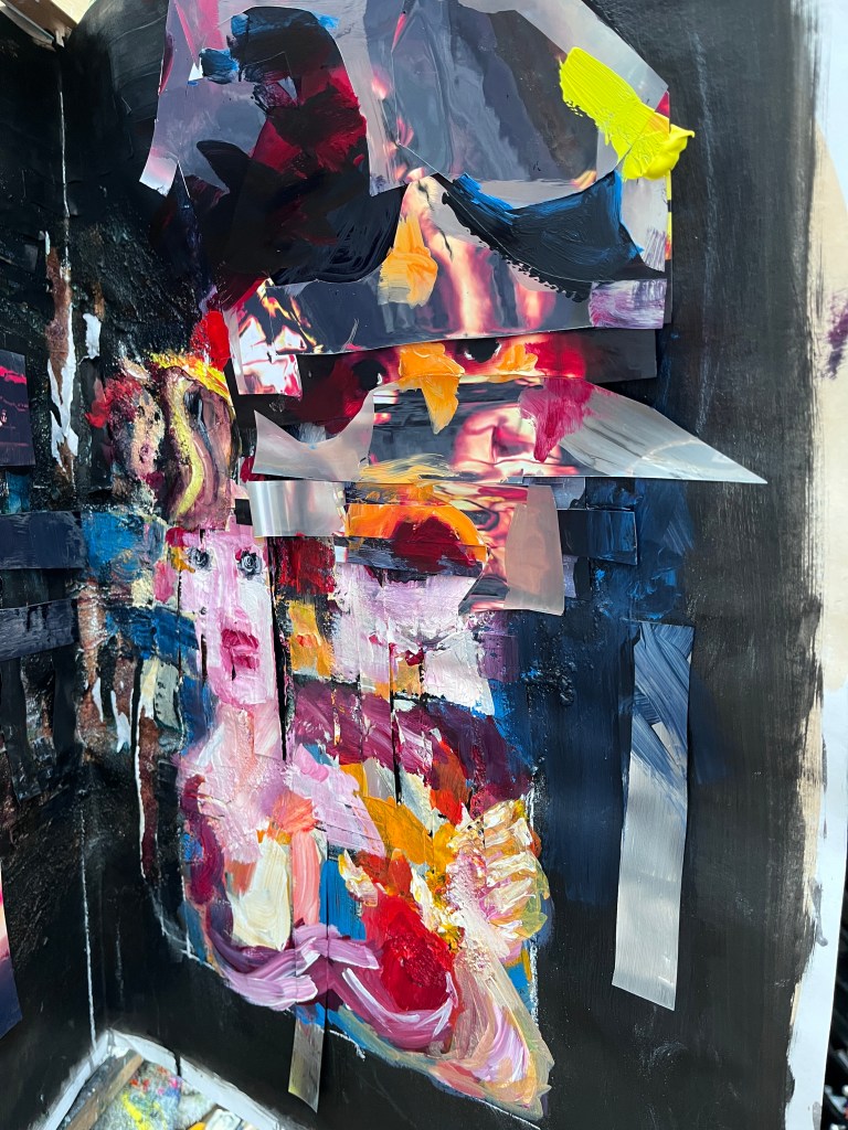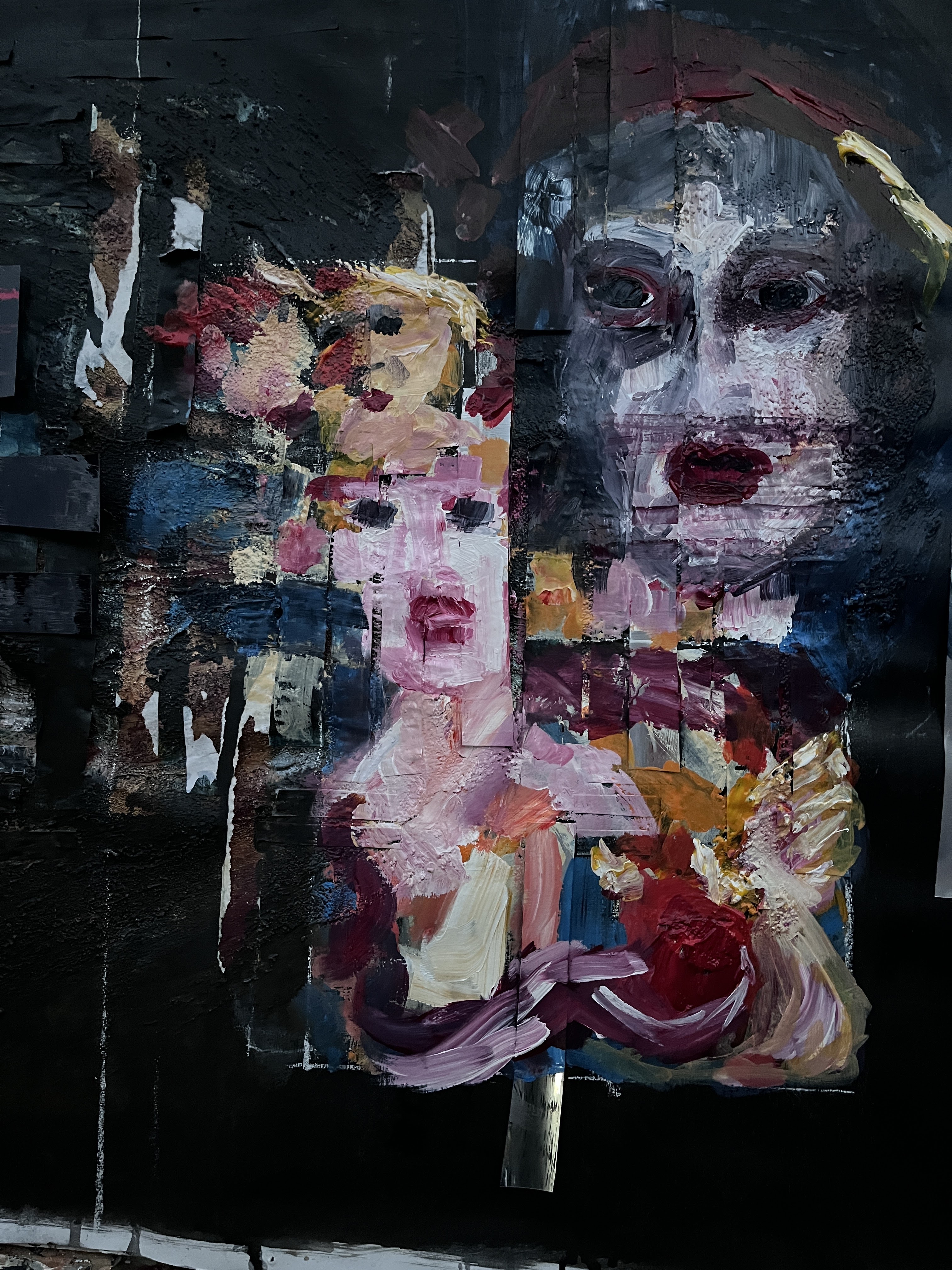 On the right are painted in faces and collaged painted over faces interspersed with mirror foil. The faces are distorted and seem to be trying to escape or tell the viewer something important, and the mirror foil, as viewed head-on, reflects the viewer back to themself.