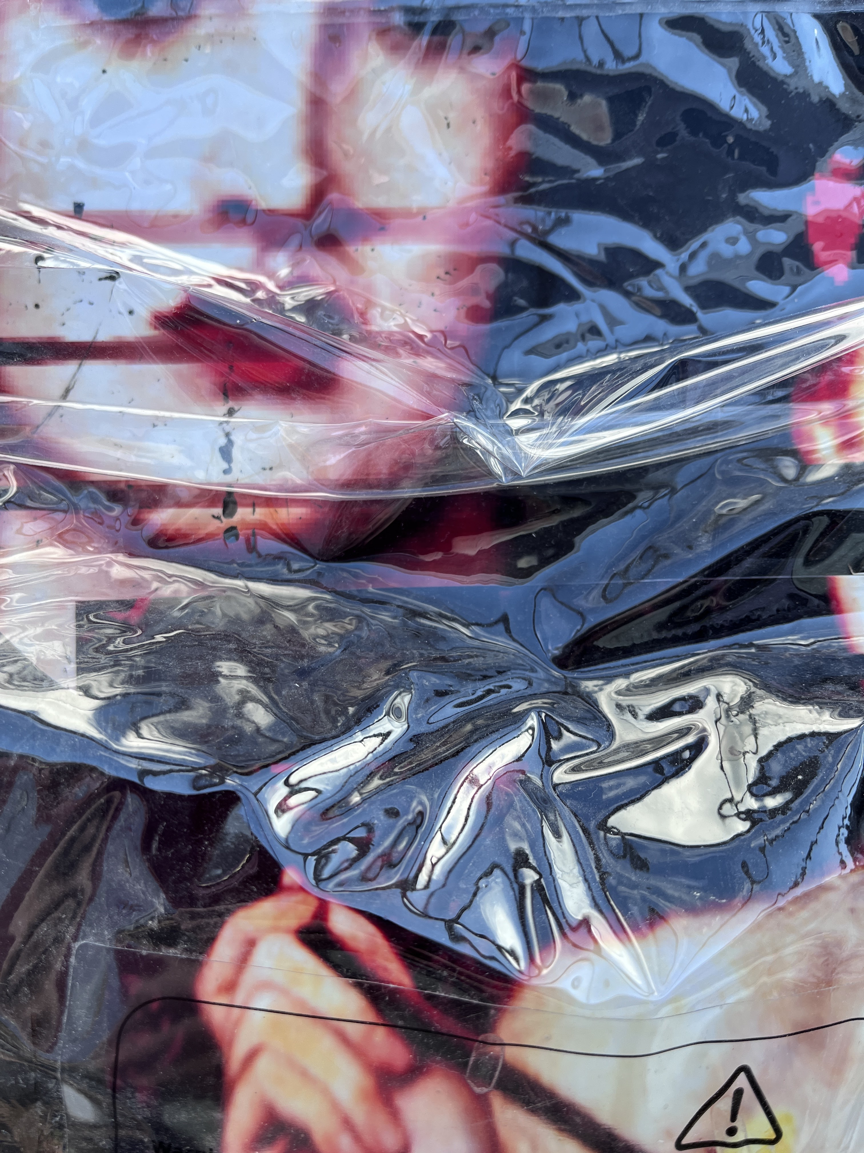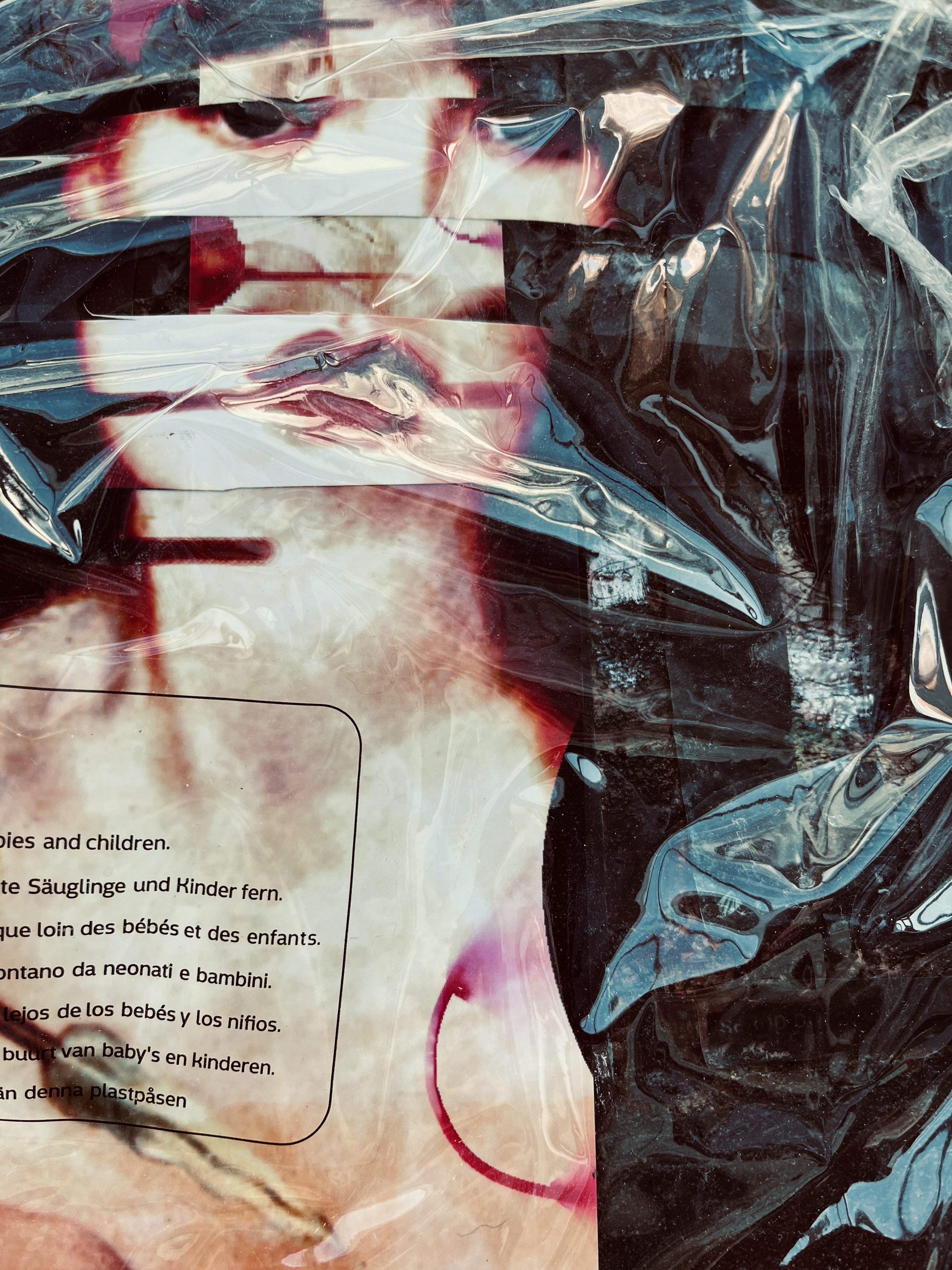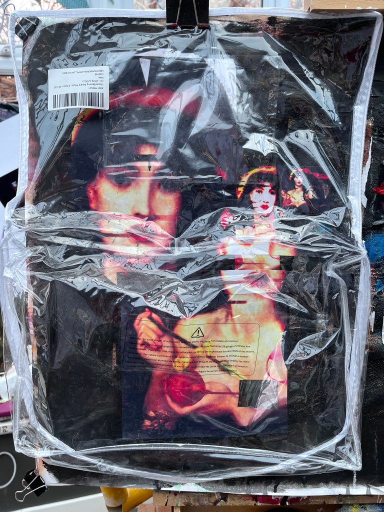 The images on the left are collaged elements of my digital manipulation of Rossetti’s Venus Verticordia who had morphed first into the exquisite woman in Bladerunner and then become the proxy for Zhora running through glitter and glass to escape her killer. All of these women seem to me to be reflections of men’s notion of what women are or should be and so reflectivity is a key component. This is emphasised on the left using a plastic case that something like a cushion arrived in. It’s sturdy and so stands well as a proxy for Zhora’s plastic coat.