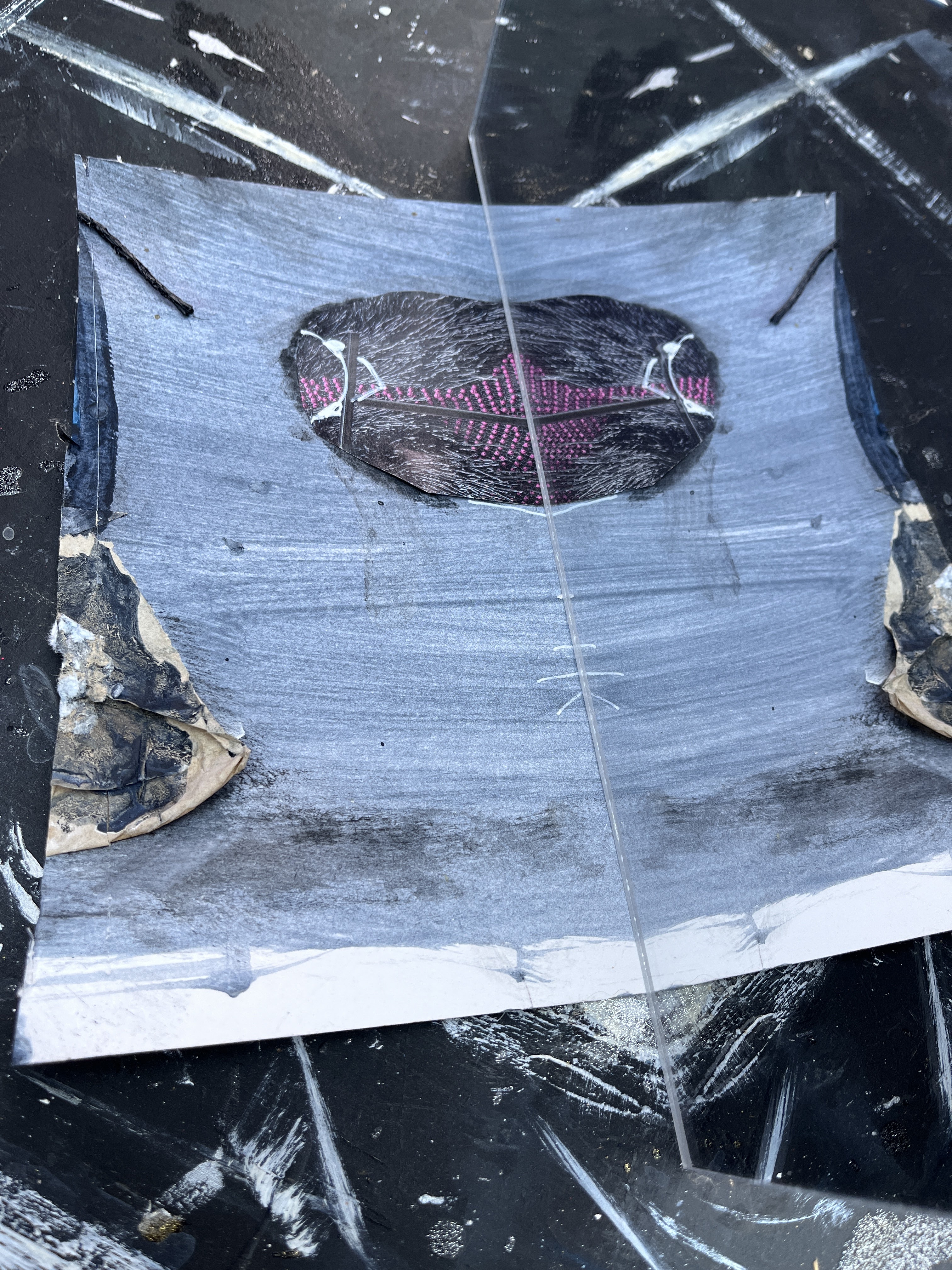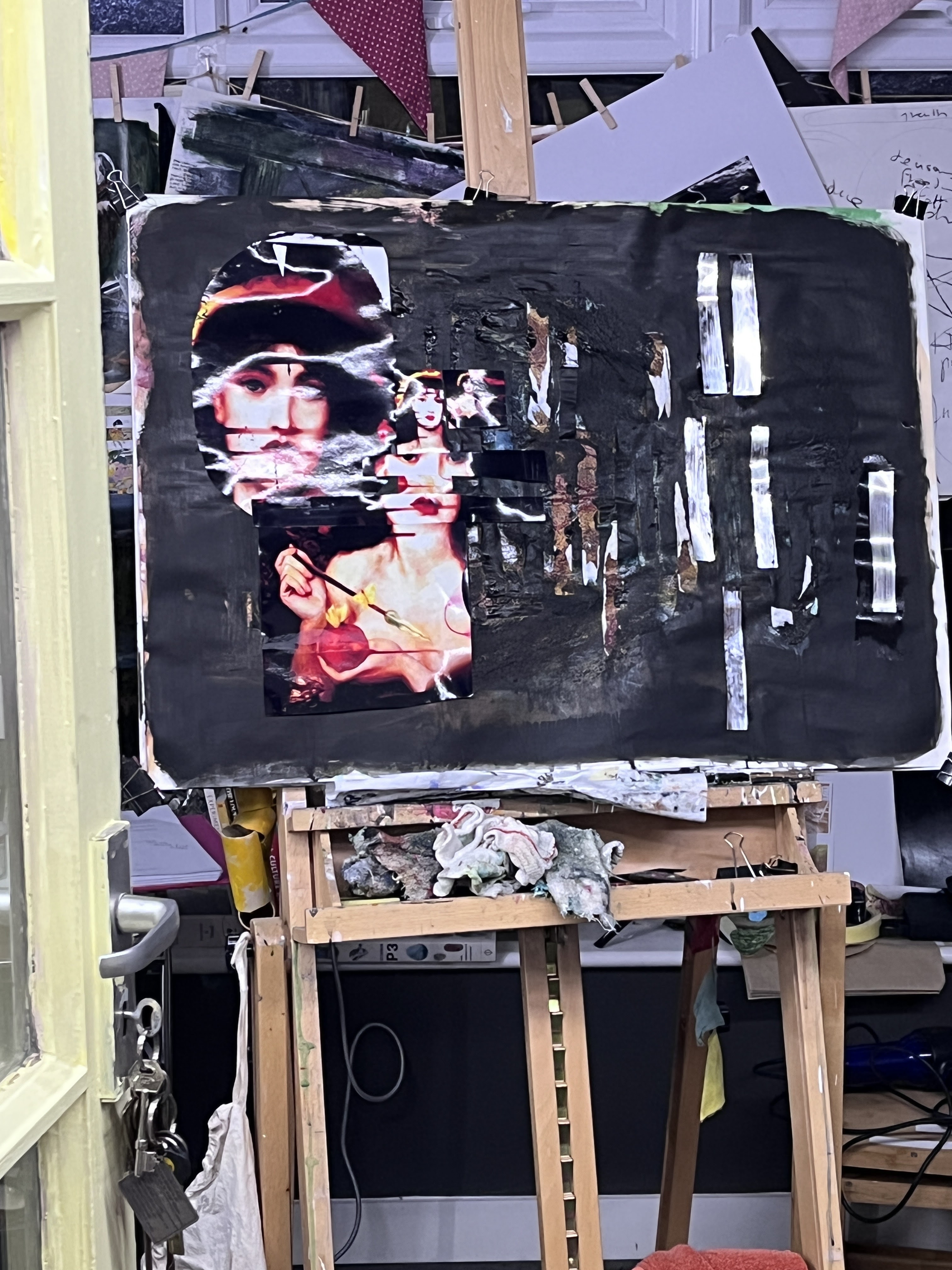 I have printed out the digital image, along with some enlargements of details. The base for a composite collage/painting is an earlier collage/painting, muted with lamp black applied with a sponge.