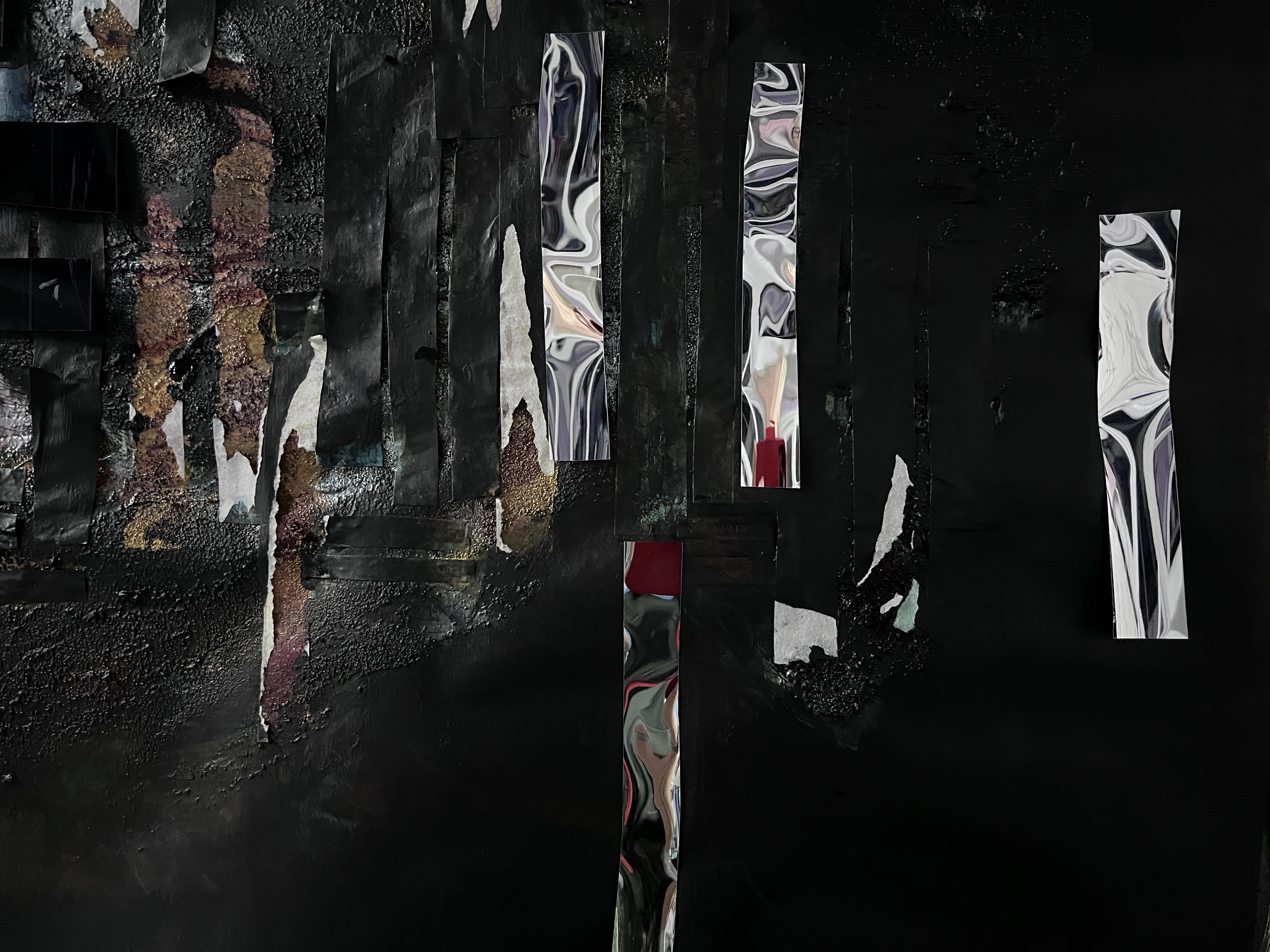 This is already textured with pumice medium and strips of paper, and has its own inherent shine, exaggerated by my phone’s management of black surfaces.