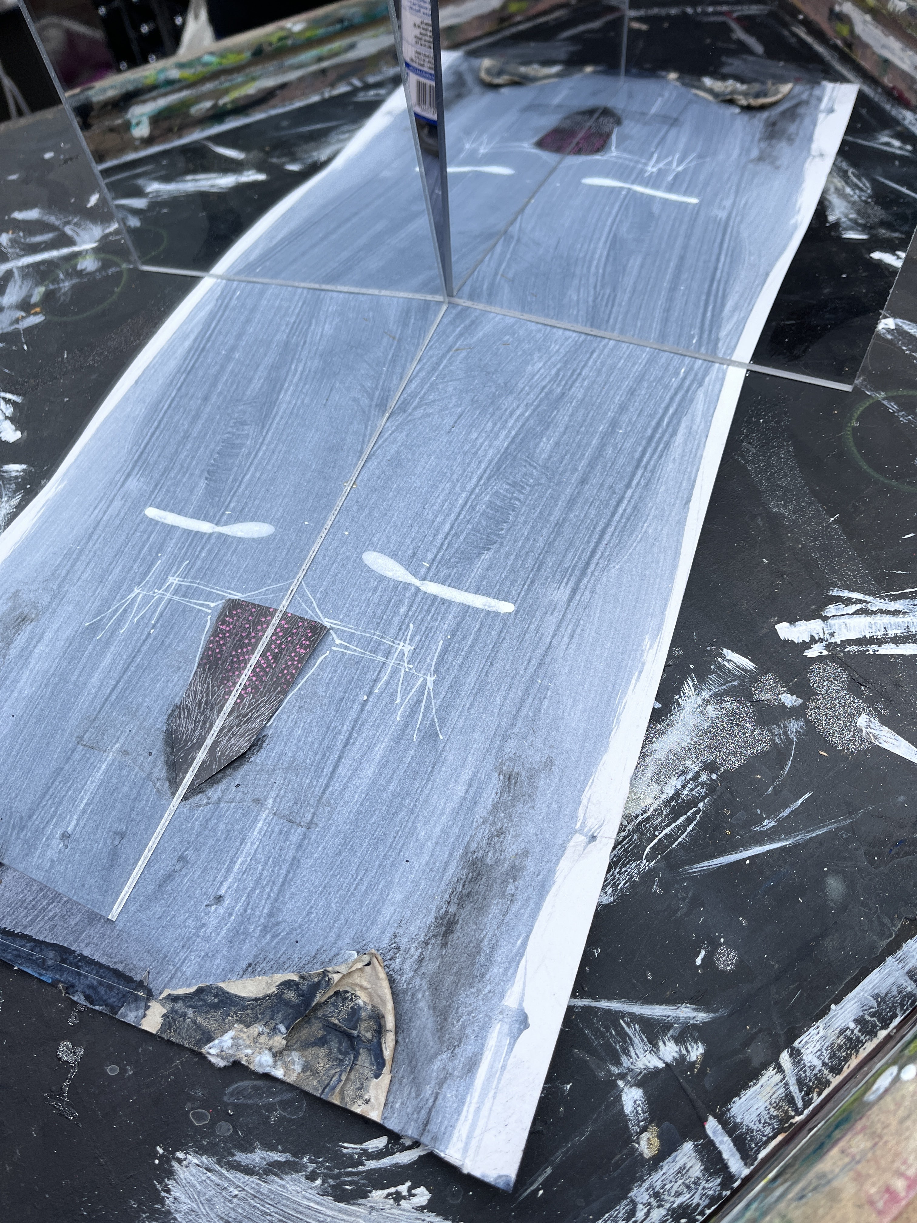 I’m thinking now about the placement of the reflective strips – should this be a single sheet of mirror foil, or will there be another, more interesting effect if I ‘pixelate’ them by placing more in the gaps and ‘bar coding’ them with matte paint?