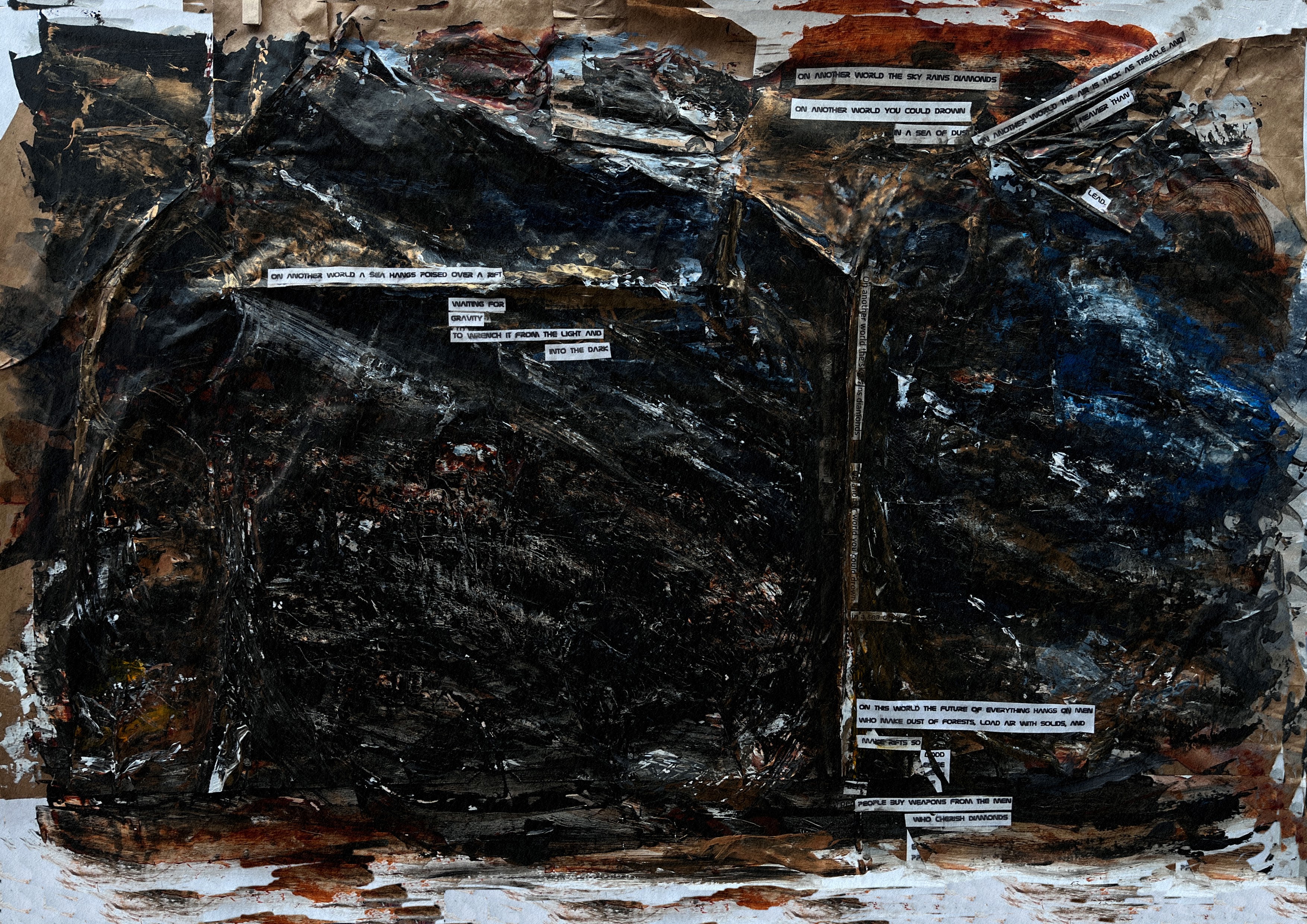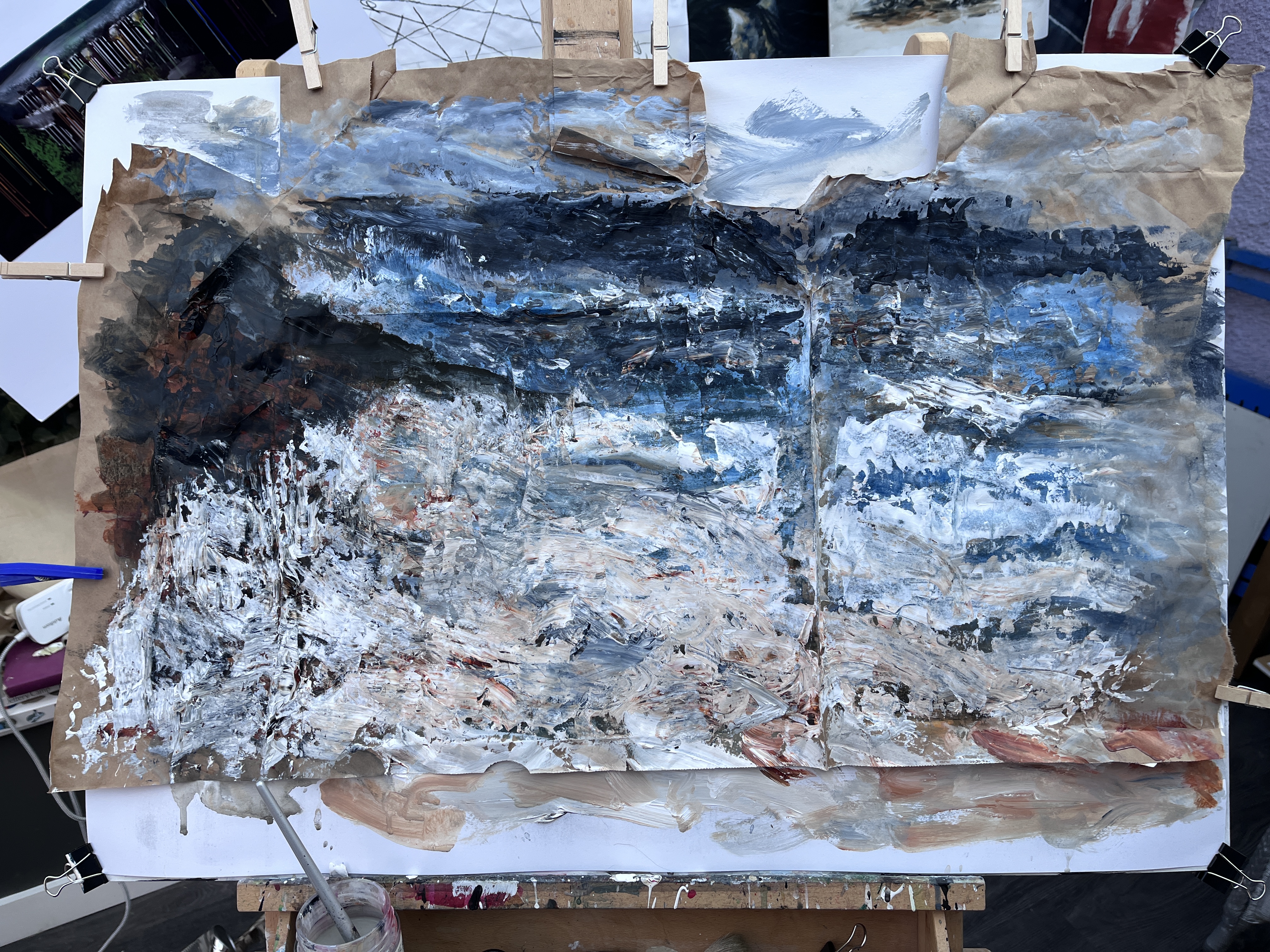 10th February 2022. Off the back of some partially imagined seascapes, and after seeing someone using brown paper as a support, I tore up an Amazon bag and stuck it with transparent primer to a sheet of white cartridge. No plan in mind except to use a mixture of dilute and thick paint, plus some charcoal and/or soft pastel.