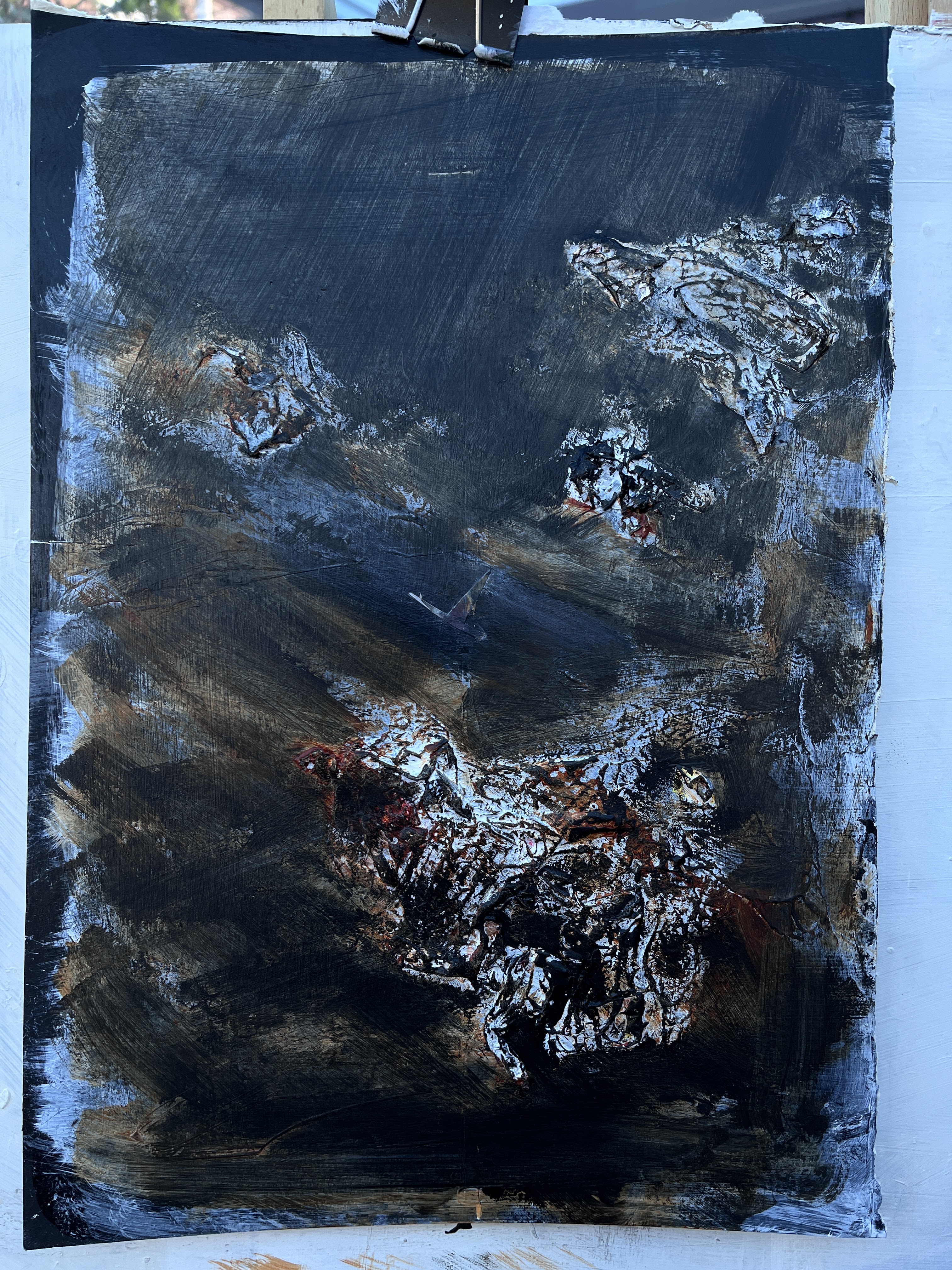 The dark painting is made using dried acrylic paint peeled from my palette and glued in place. I washed the whole with dilute T white then pulled that off with a flannel. The next layers are lamp black and burnt sienna, dragged across the support to lodge on the peaks of the collaged paint. I rubbed quite a lot of that back too, then cut out a hand drawn image of the bird in the photo to glue into the centre of the chaos.
