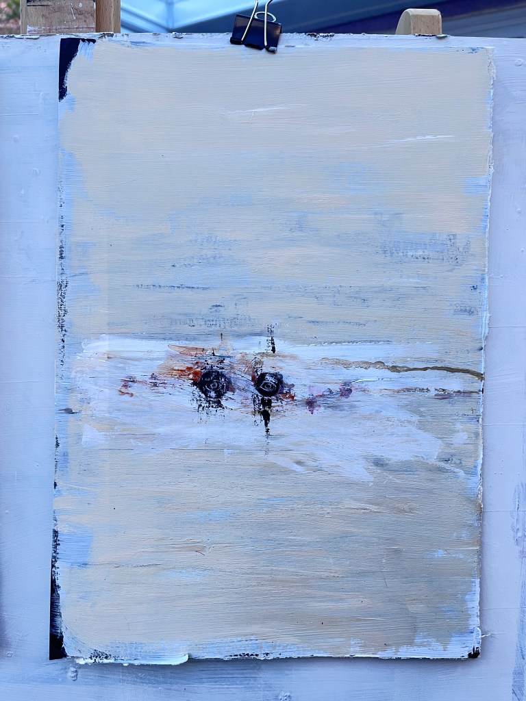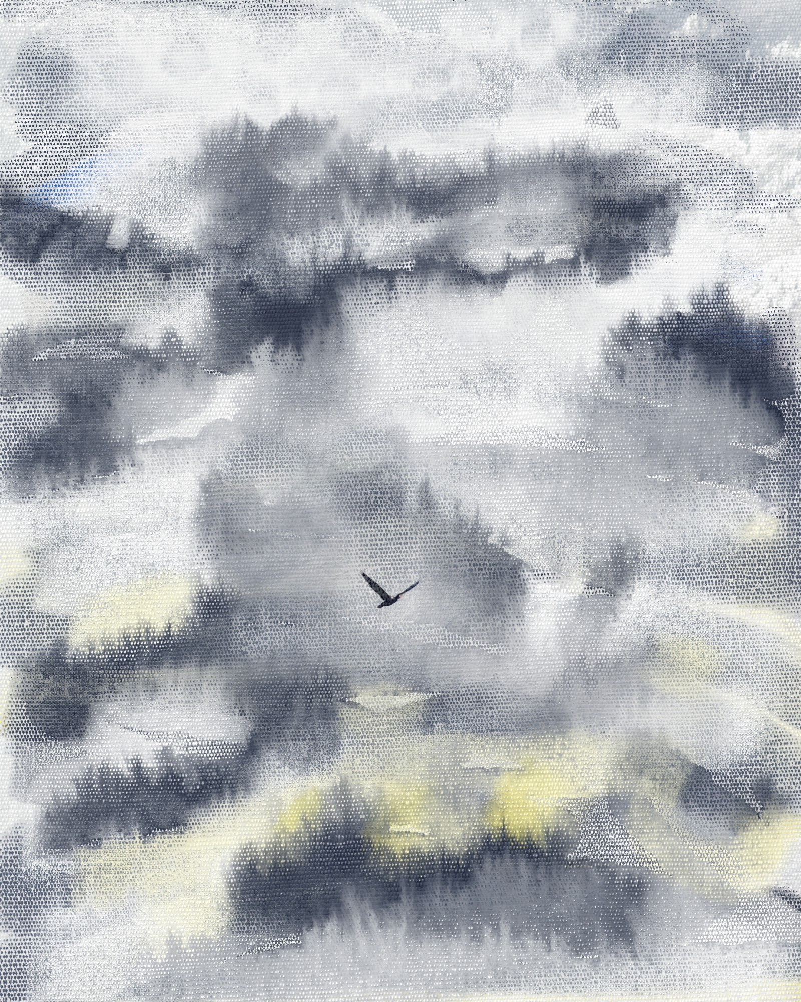 Both the use of palette peelings and gloss surfaces are techniques I’ve used before. I like the textures that come from them, whether raised or due to the mobility of paint on the surface. What I haven’t done is actively given priority to space, and I had both Agnes Martin and Ian McKeever in mind for their sparsity and muted colours. Martin’s lines definitely lent themselves to the ‘blinds’ painting but had much less impact on the storm although I had drawn a line down the centre and another across in white paint using a ruler. This ultimately felt out of place and served only to fix the bird.