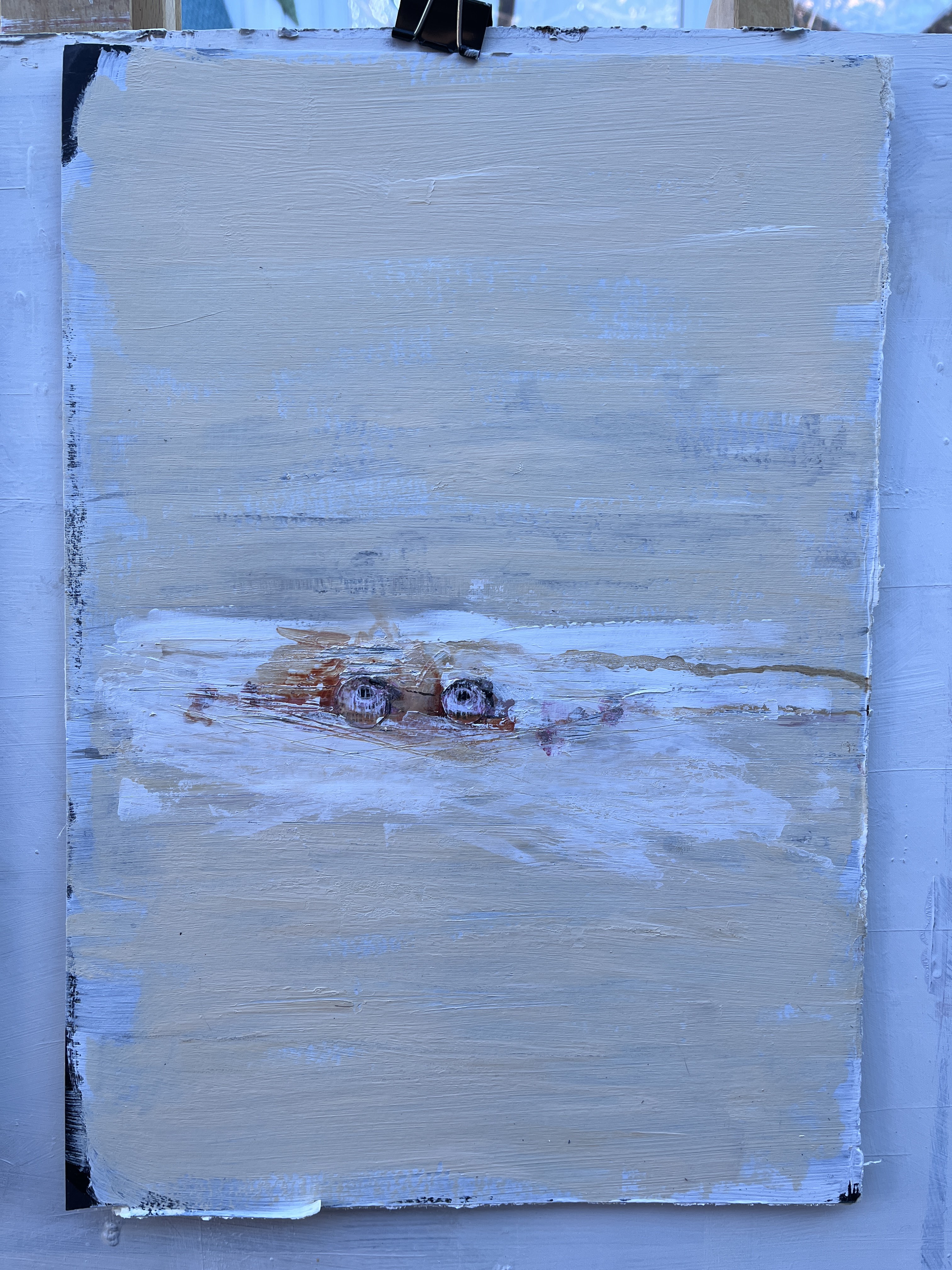 The painting on the right is based on the same black card with its gloss seal but with a white primer applied. I drew in the lines of the blinds in pencil and found the place for the eyes, using my Rebelle image for reference instead of the original because of its surreal quality. Then I applied layers of T white mixed with Naples yellow to make the space. The eyes went through several phases, at one time looking more like a cartoon than something oddly creepy.