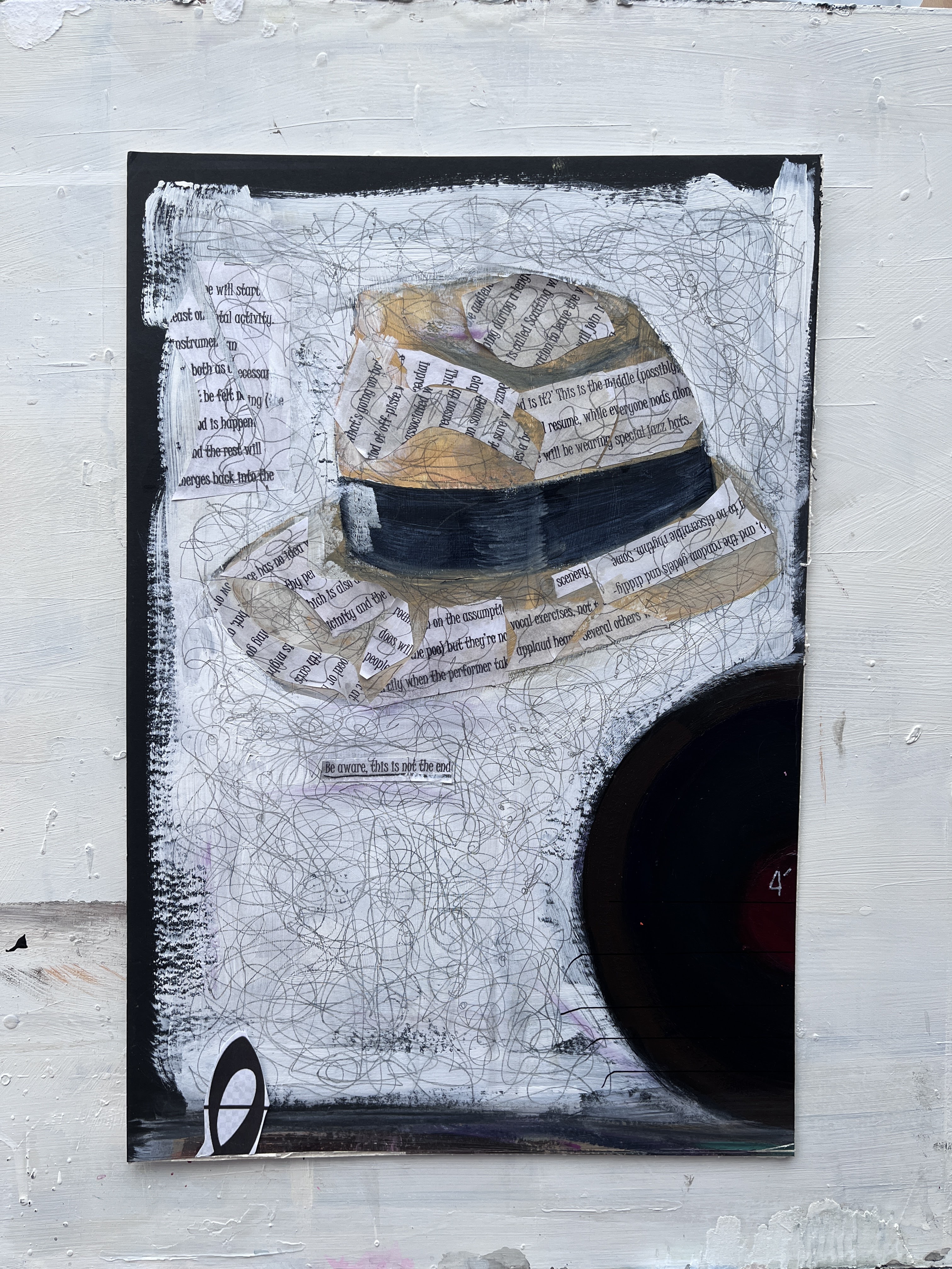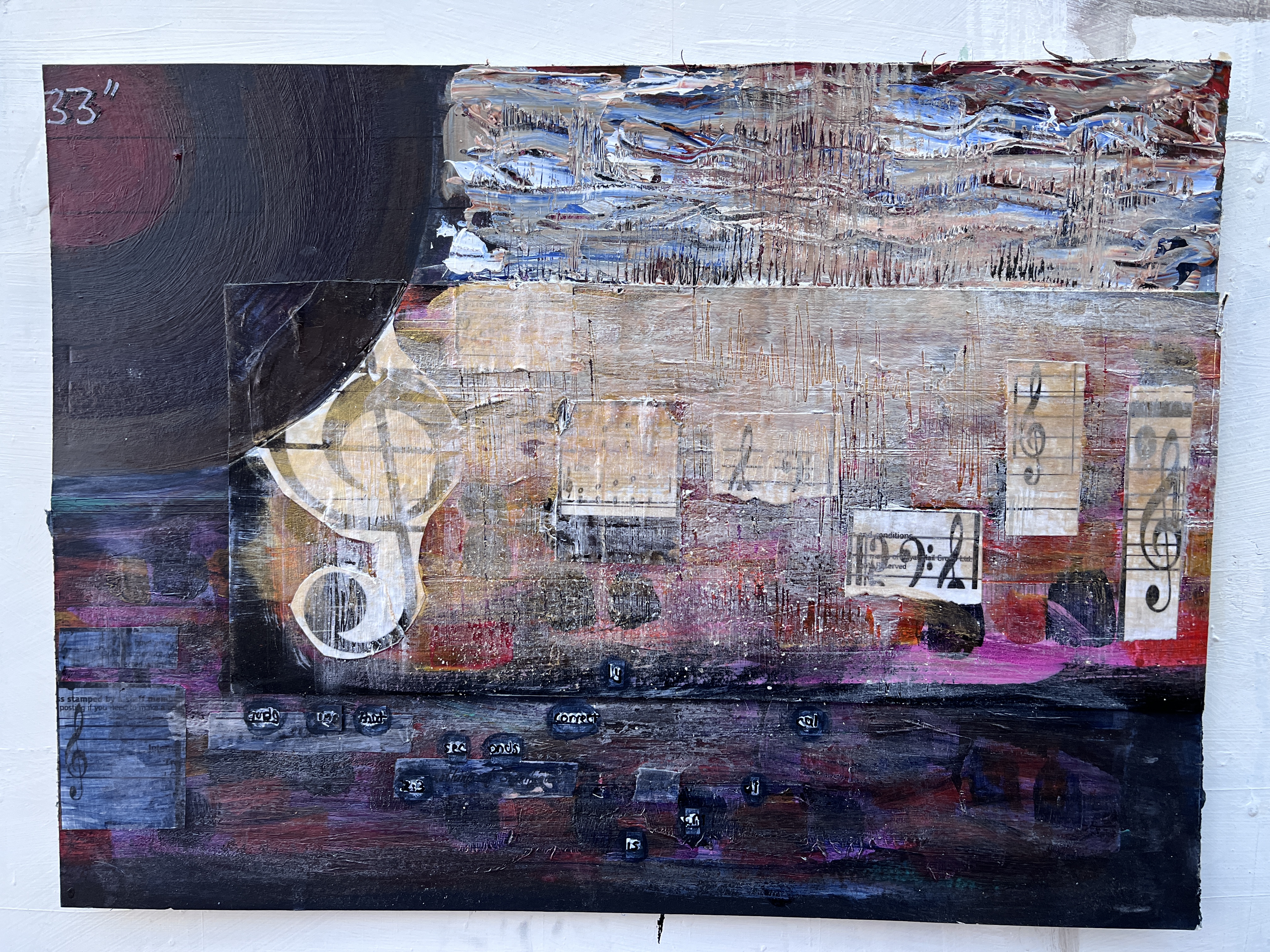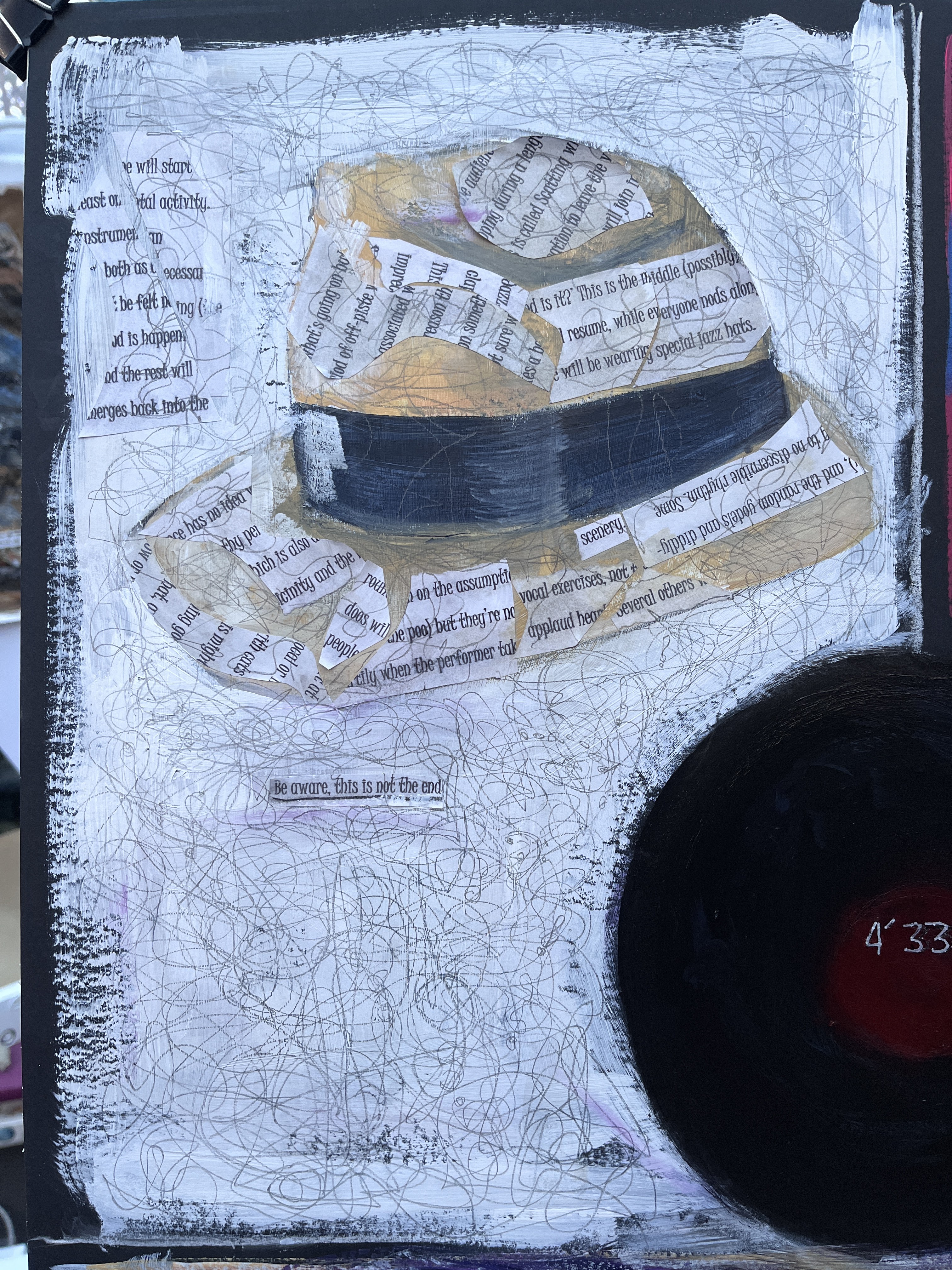 My emerging plan is to focus on painting the representatives of the musical genres, with or without the whole text or samples of it (see underlining), and to use another motif to connect them. Perhaps!