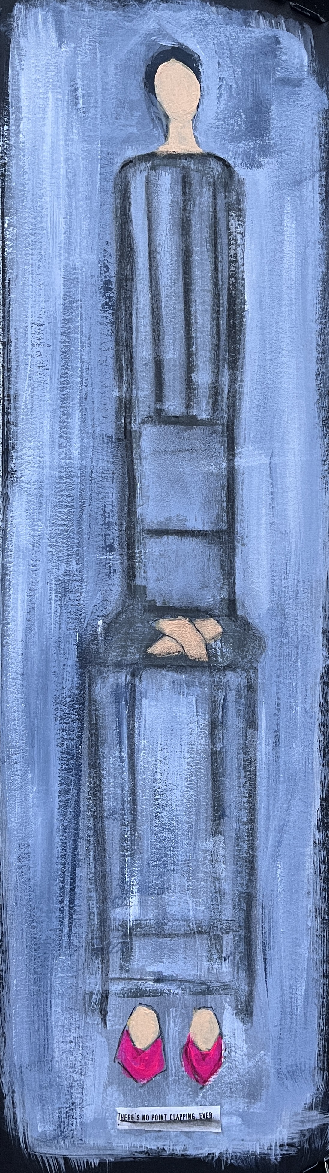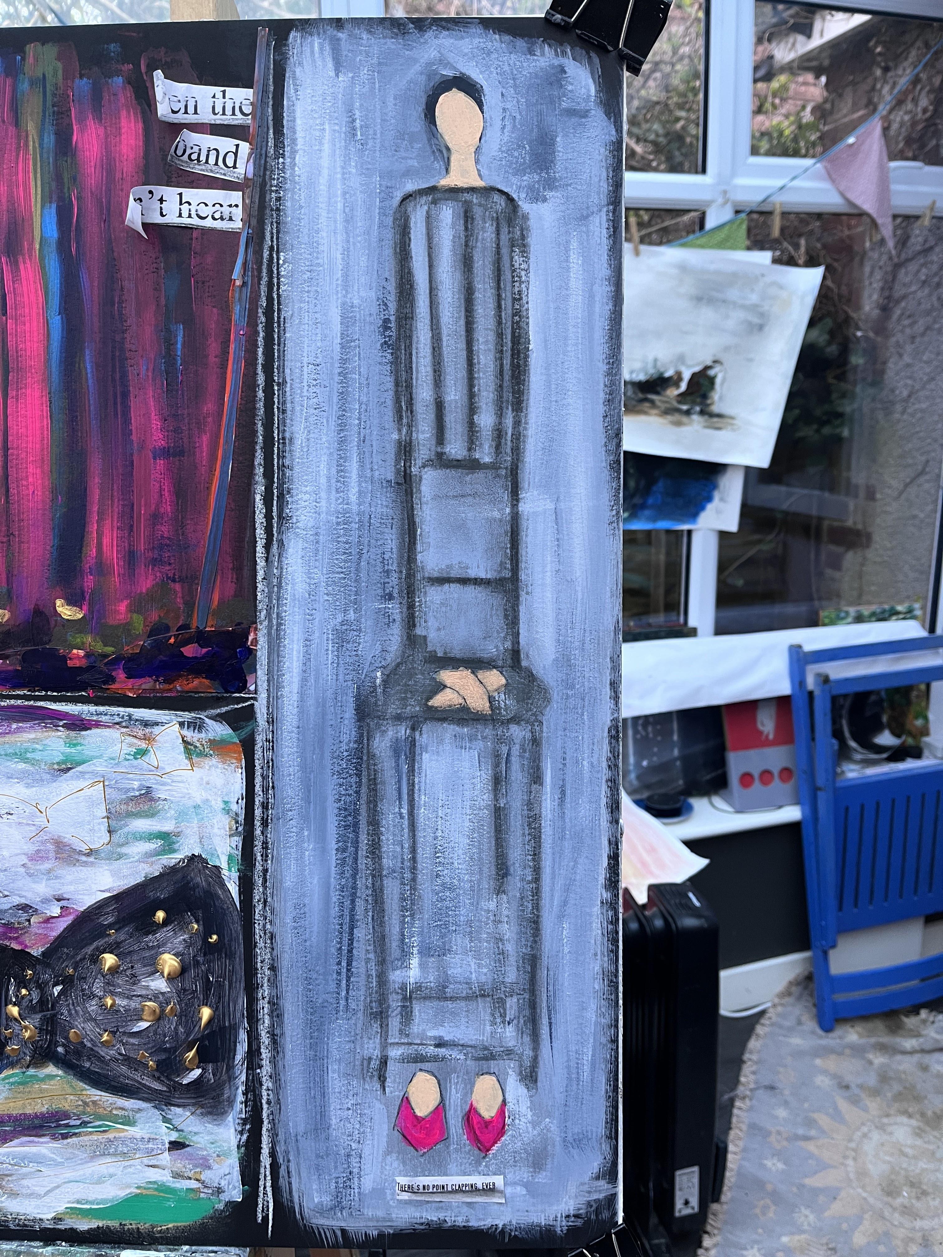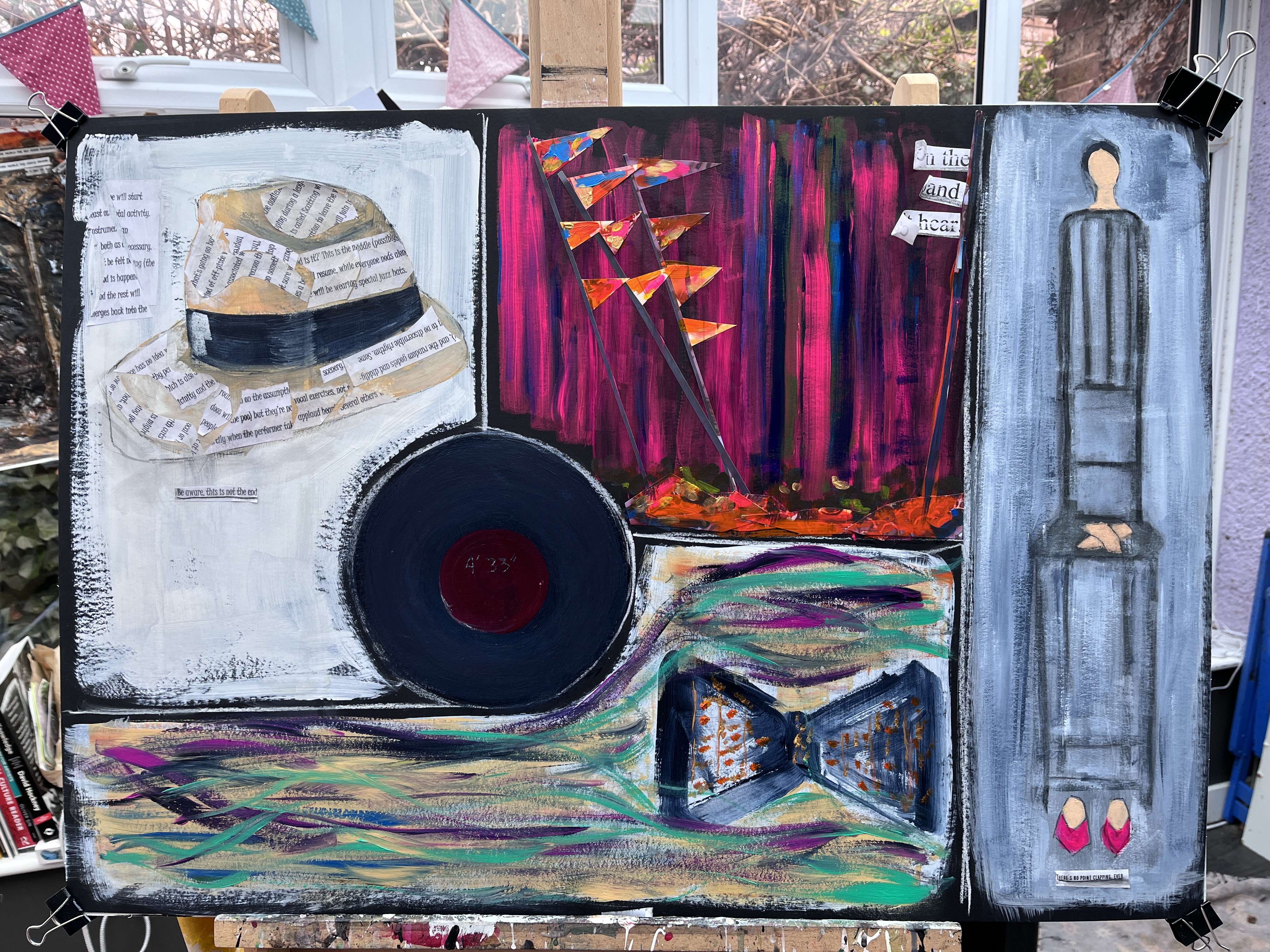 Not done yet but top left is jazz – acrylic and collaged plain paper with text; top centre is festival – acrylics with collaged banners and pennants; far right is chamber music in dilute acrylics, undiluted acrylic (head, feet, hands), and charcoal; centre is minimalist – acrylics, gloss, and a stylus; bottom is classical – acrylics.