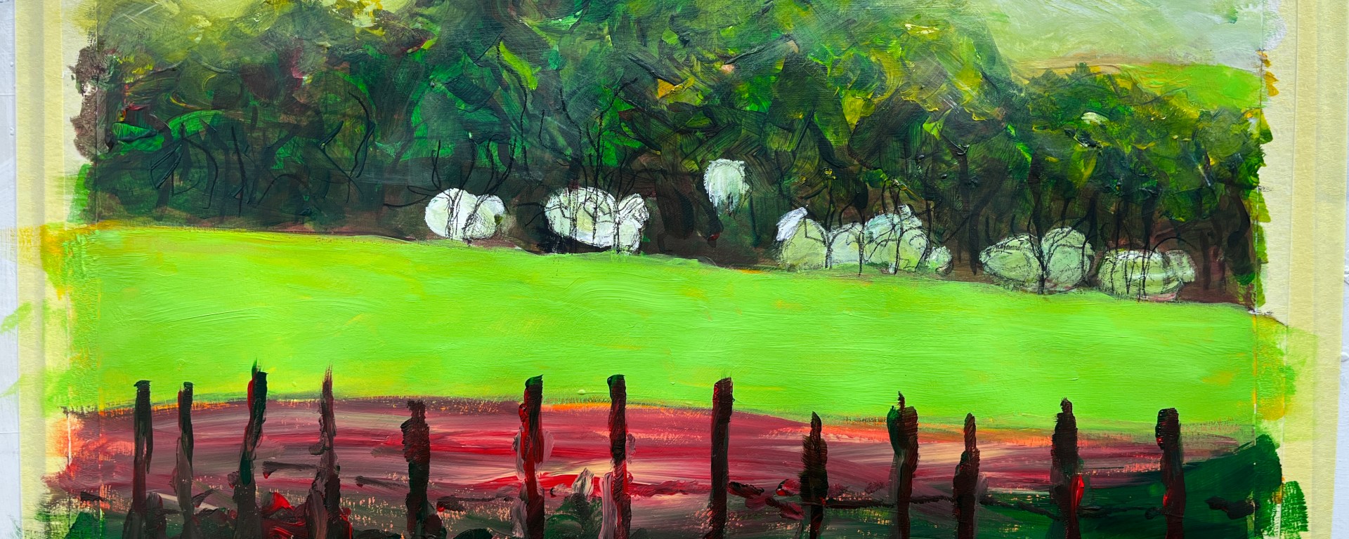 To me, this looks like three different paintings even without the bright green strip across the middle – the top and the bottom being quite painterly but in different ways, and the strip with the sheep seeming more illustrative due to the charcoal marks.
