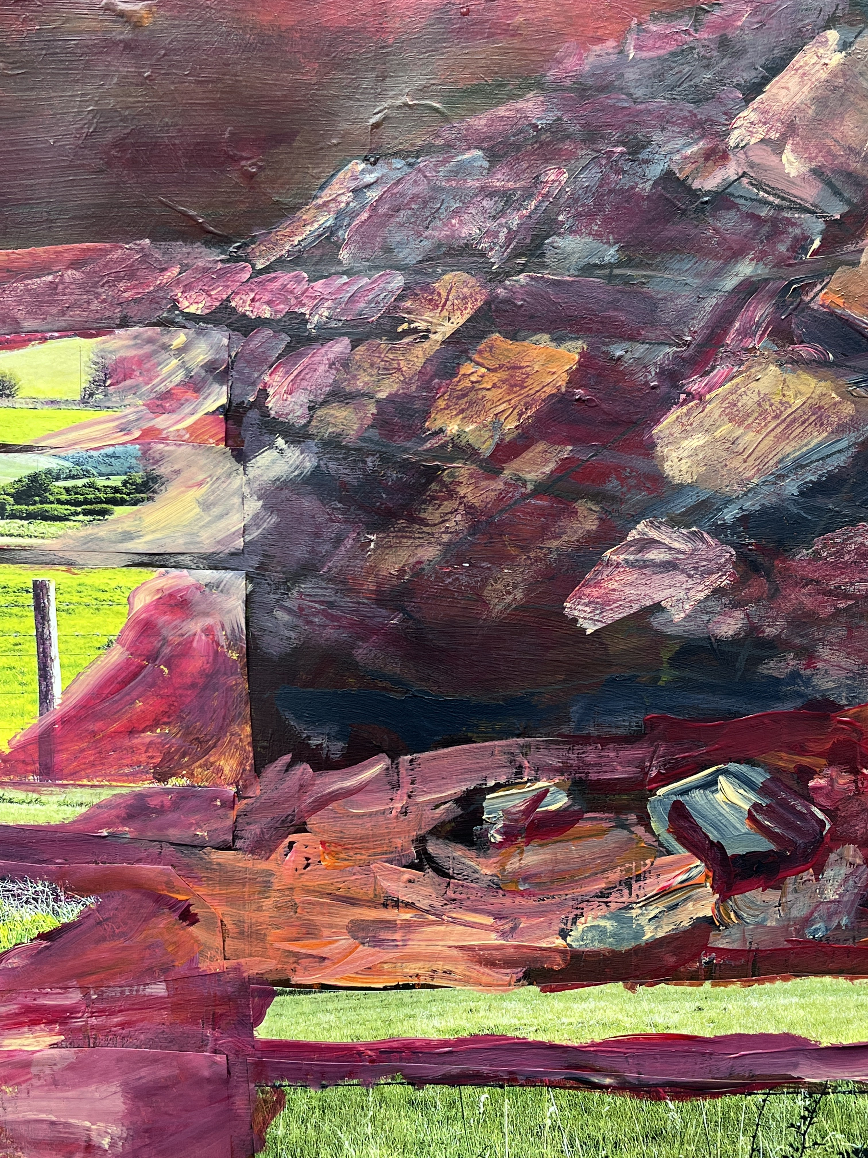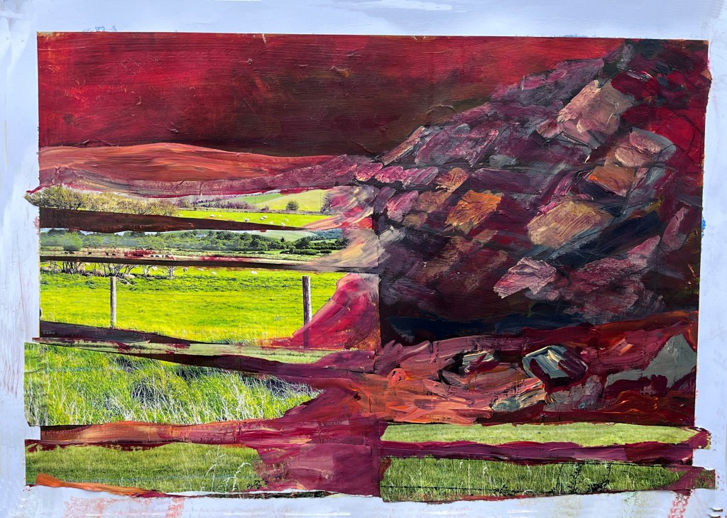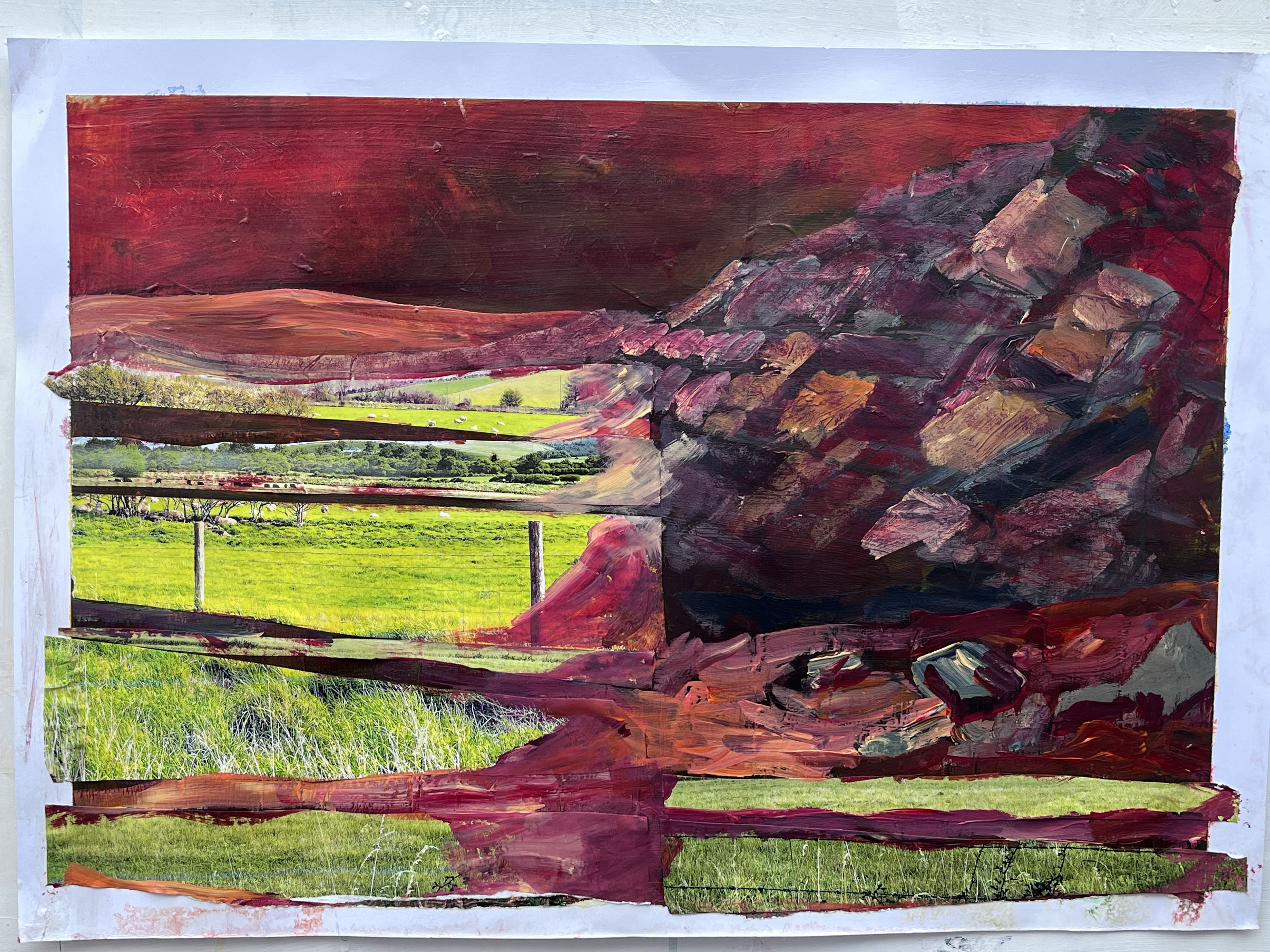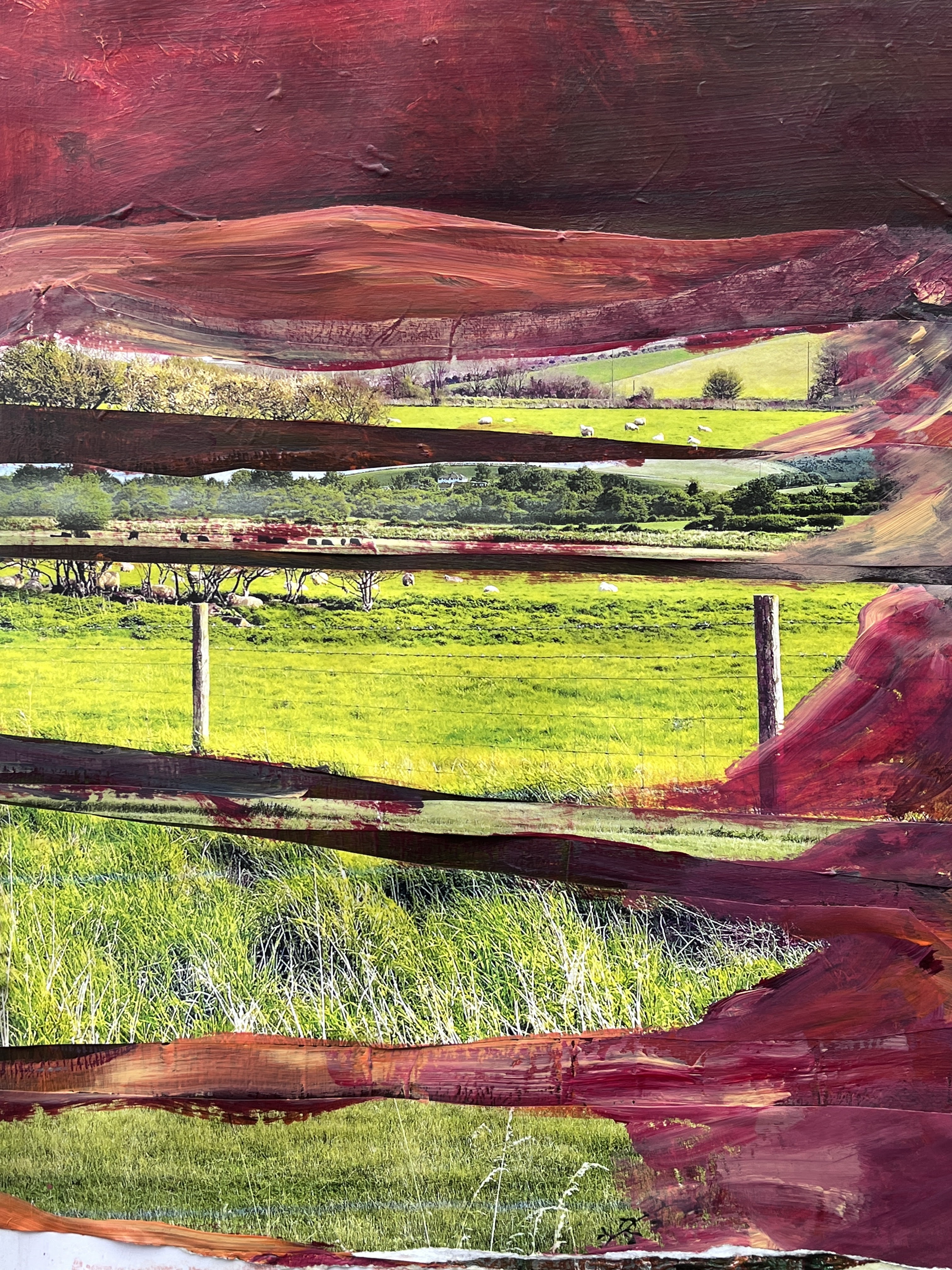Then I took prints of several of my photos relating to sheep in fields and located close to the original. Fortuitously, some of these benefited from a blast of yellow from the printer cartridge making them very bright green indeed. These I cut into strips to paste onto the support, first in a kind of horizontal bar code, then in fractured lines (back to the rift), and finally with a focus on the left half of the image because by then I had my total image in mind, likely driven by my audio book, Red Mars (starts out well, gets very blokey).