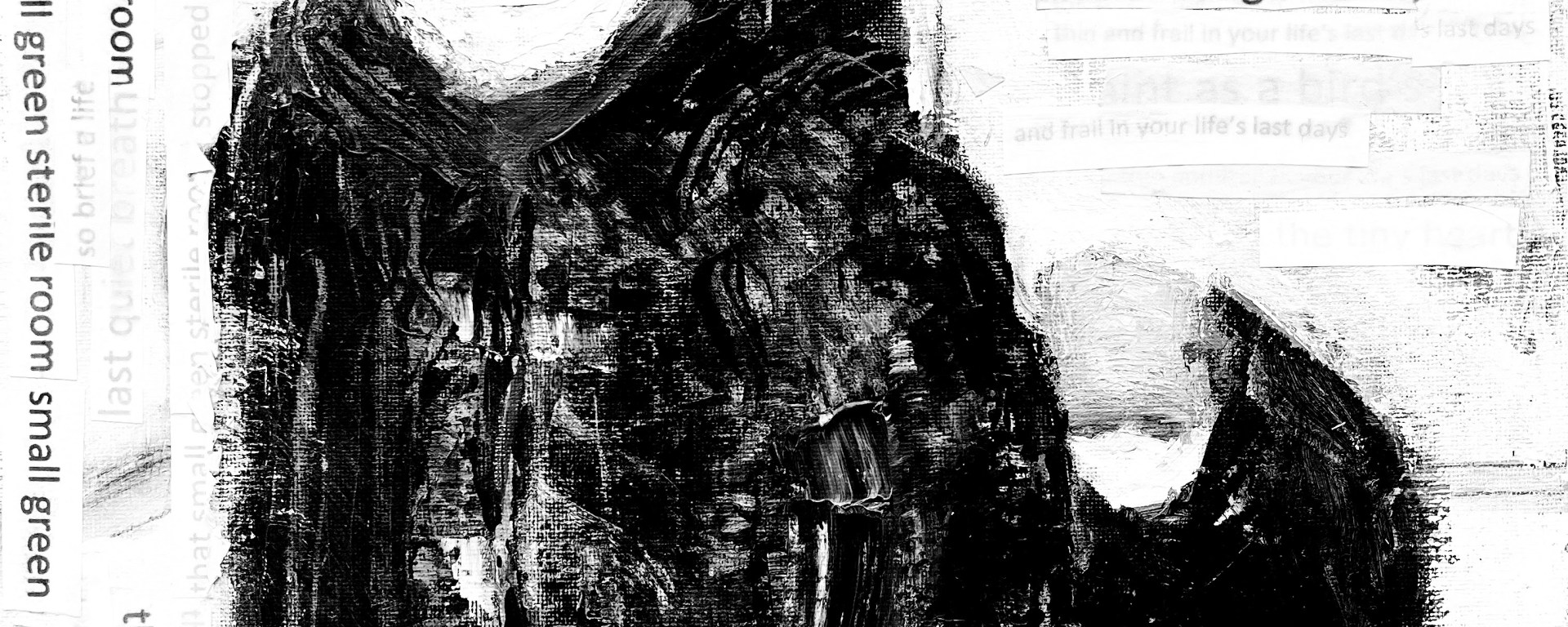 The poem is called, ‘Not Quite You’ and it is about the death of Huggins’s cat. The painting was built on a similar scene at the Vet’s surgery where an elderly couple waited with their dog for that final goodbye. I called it ‘The Small Green Room’ but renamed it for this new place, ‘the day you make a memorial’.