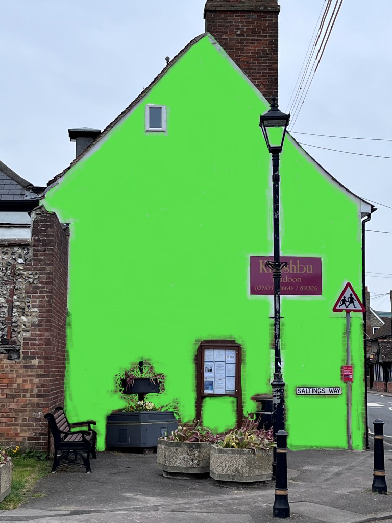 Greenscreen is essential to the selective mixing of elements such as a static image and a video. The green paint here blocks out the wall of the restaurant but leaves their sign and various pieces of street furniture untouched. This ensures the video material only appears in the marked areas and doesn’t encroach on elements you might want to keep intact as anchors to the physical world. I discovered later that it’s possible to use ‘feathering’ which means the green pigment is applied like scratches and gives the impression of viewing moving images through dirty windows.