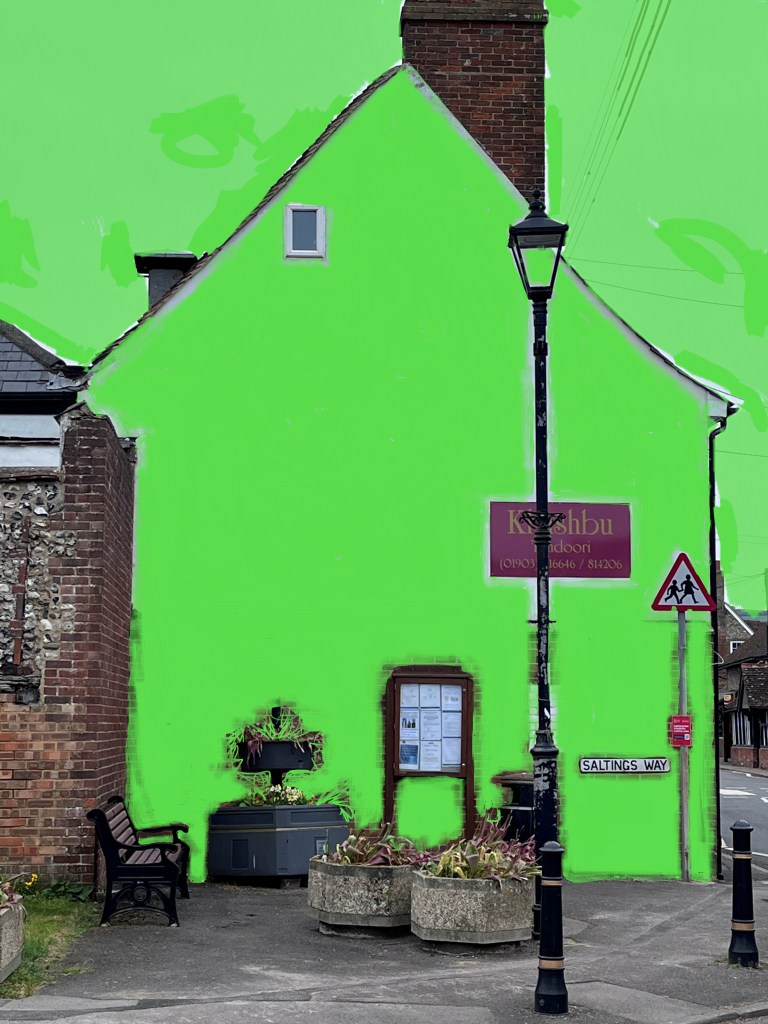 This is the primary image painted for greenscreen. Note signs, street furniture, and physical context are untouched. This is to keep the activated image fully aligned with the real world so as to create the best AR experience for the viewer.