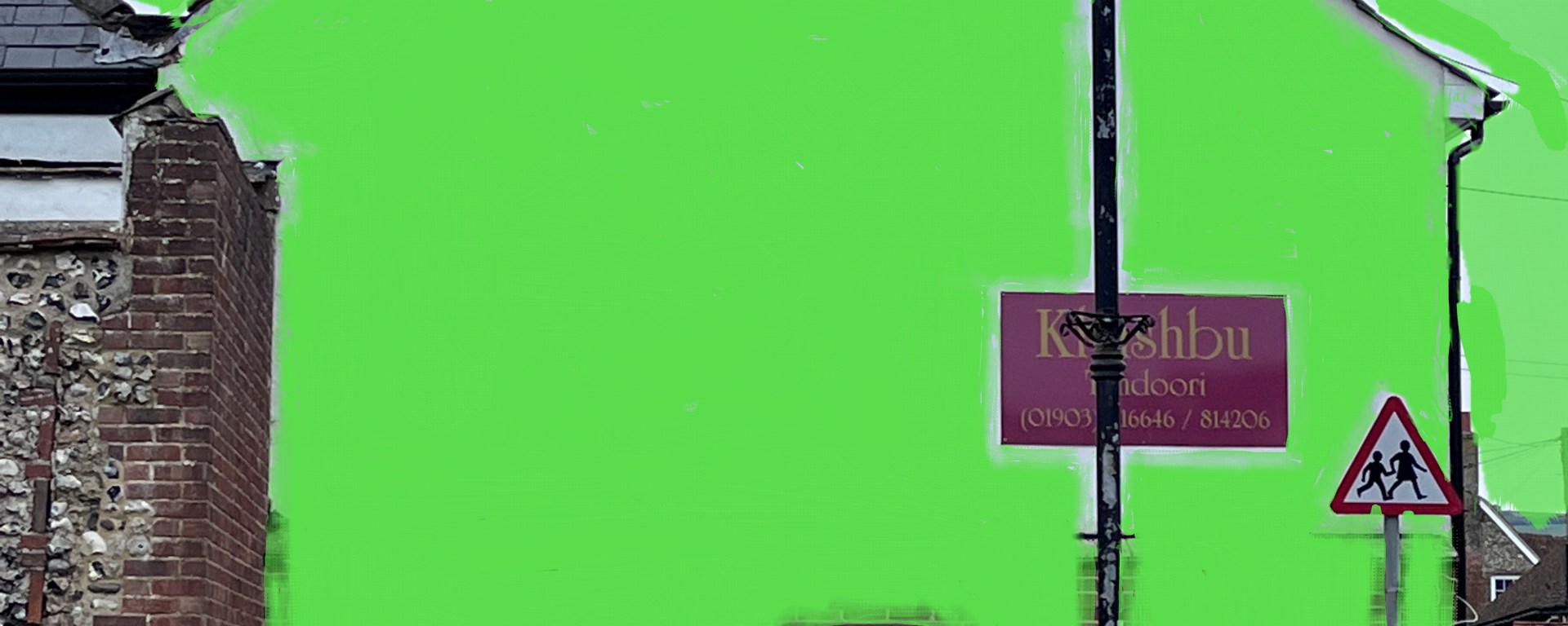 Greenscreen is essential to the selective mixing of elements such as a static image and a video. The green paint here blocks out the wall of the restaurant but leaves their sign and various pieces of street furniture untouched. This ensures the video material only appears in the marked areas and doesn’t encroach on elements you might want to keep intact as anchors to the physical world. I discovered later that it’s possible to use ‘feathering’ which means the green pigment is applied like scratches and gives the impression of viewing moving images through dirty windows.