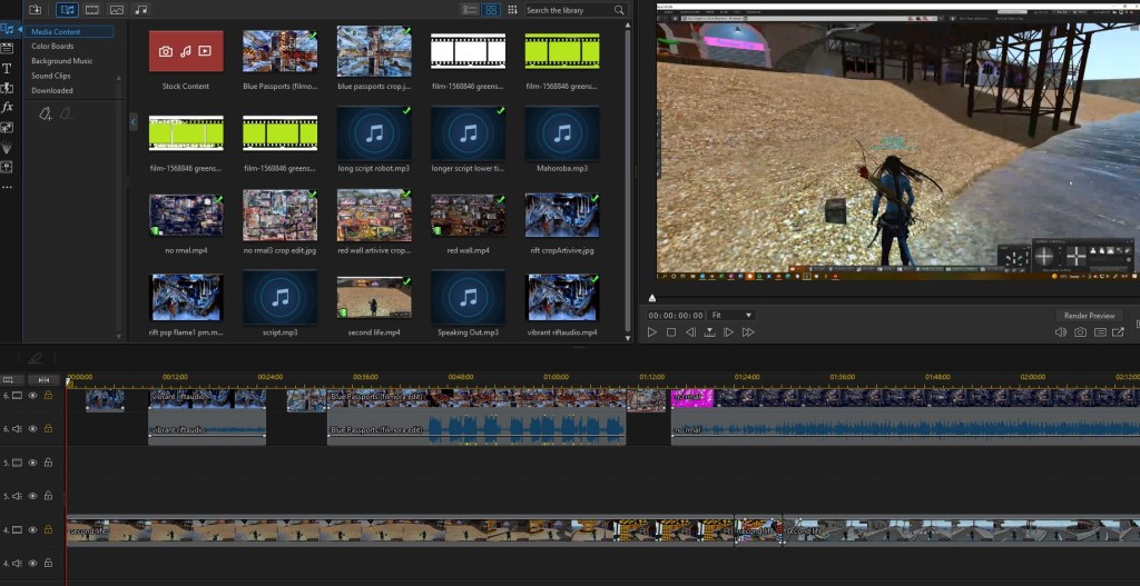 I had considered using greenscreen to show the art work through an image of old cinema film, but that turned out to be both fussy and redundant, messing up the positioning of elements within or over others to no discernible advantage. The major challenges were going to be lining up audio with video while editing out redundant space or material. I discovered some time ago how to lock tracks so that they weren’t all chopped at the same time whenever I wanted to edit something out, but getting the images, SL video, and audio voice tracks to sit where I wanted them was a task requiring some patience and definitely no cats on the keyboard.