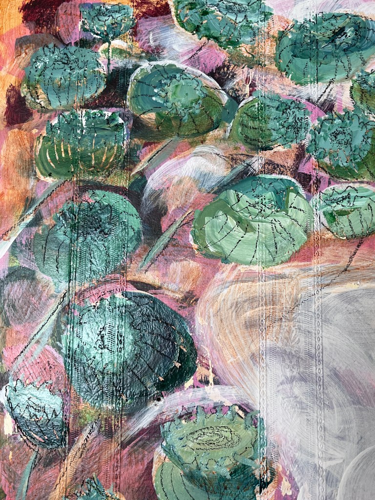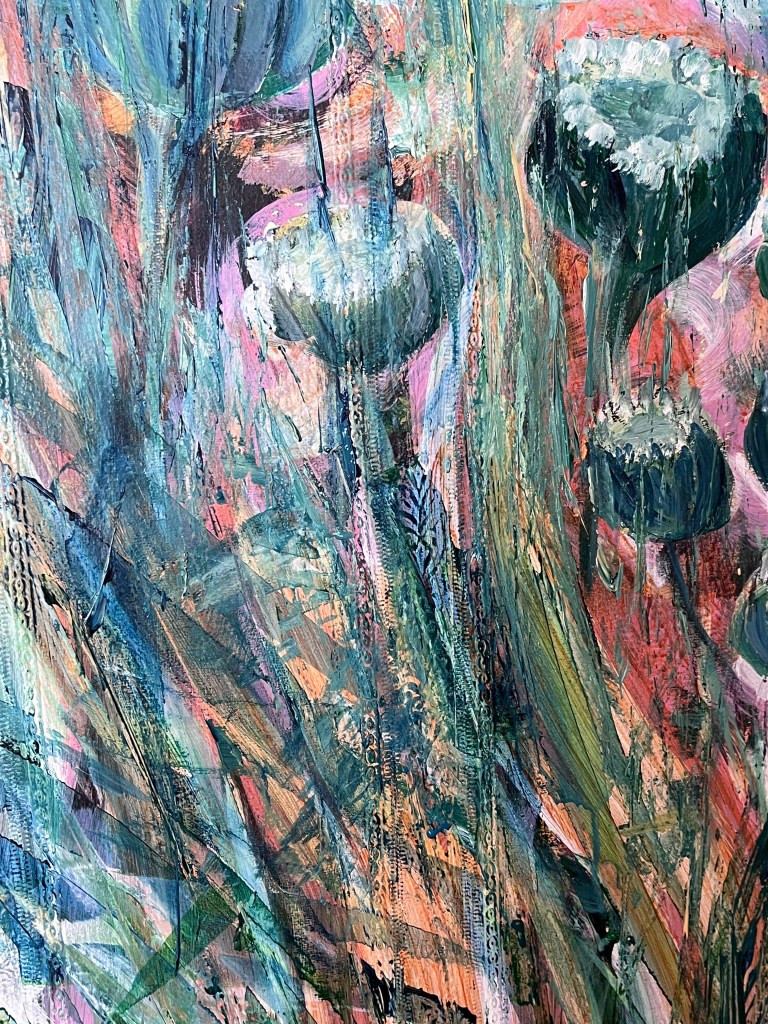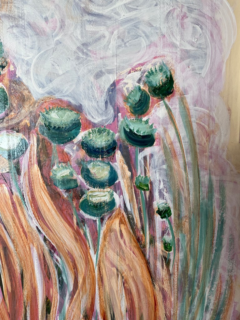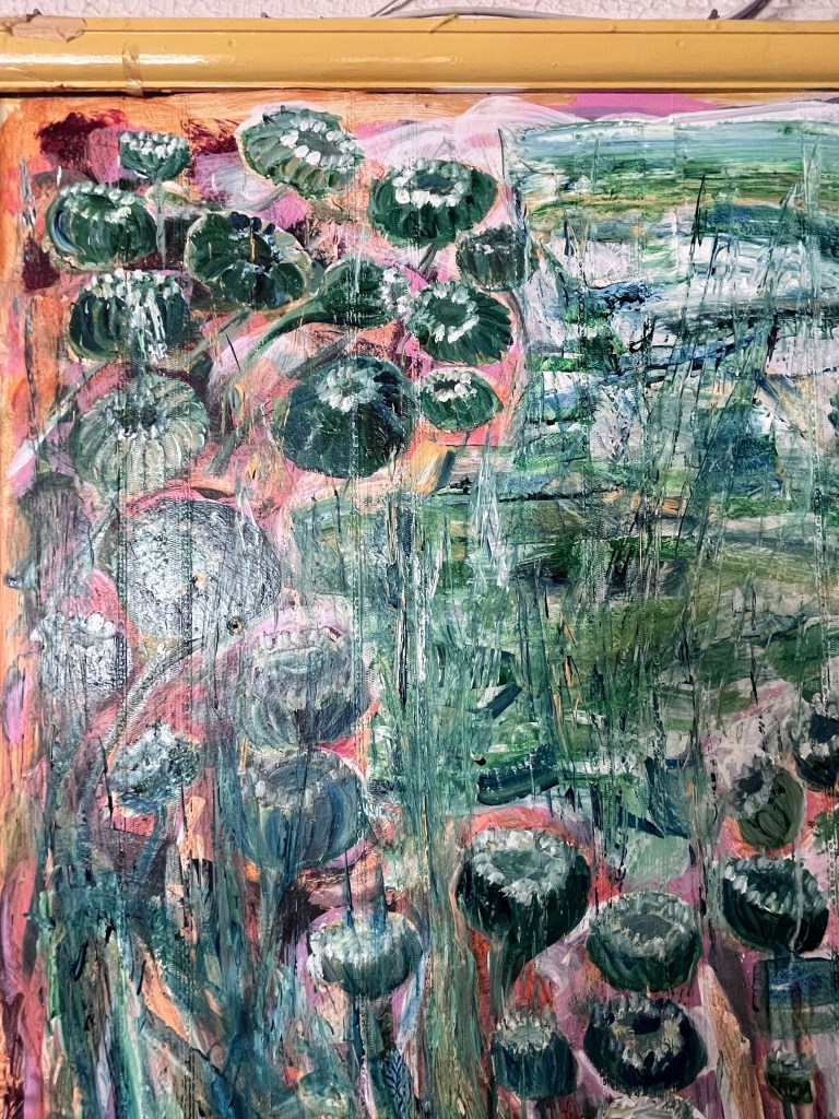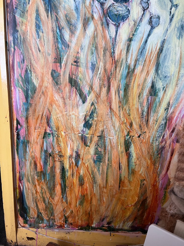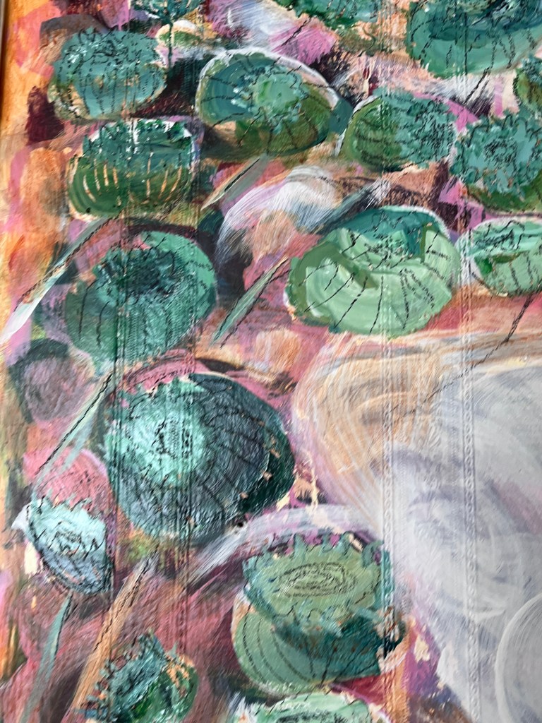 The painting, my sister’s from her degree show, and the stencilled vine suggested foliage but quite how we got from that gentle thing to this, I’ll never know. I blame OCA.
