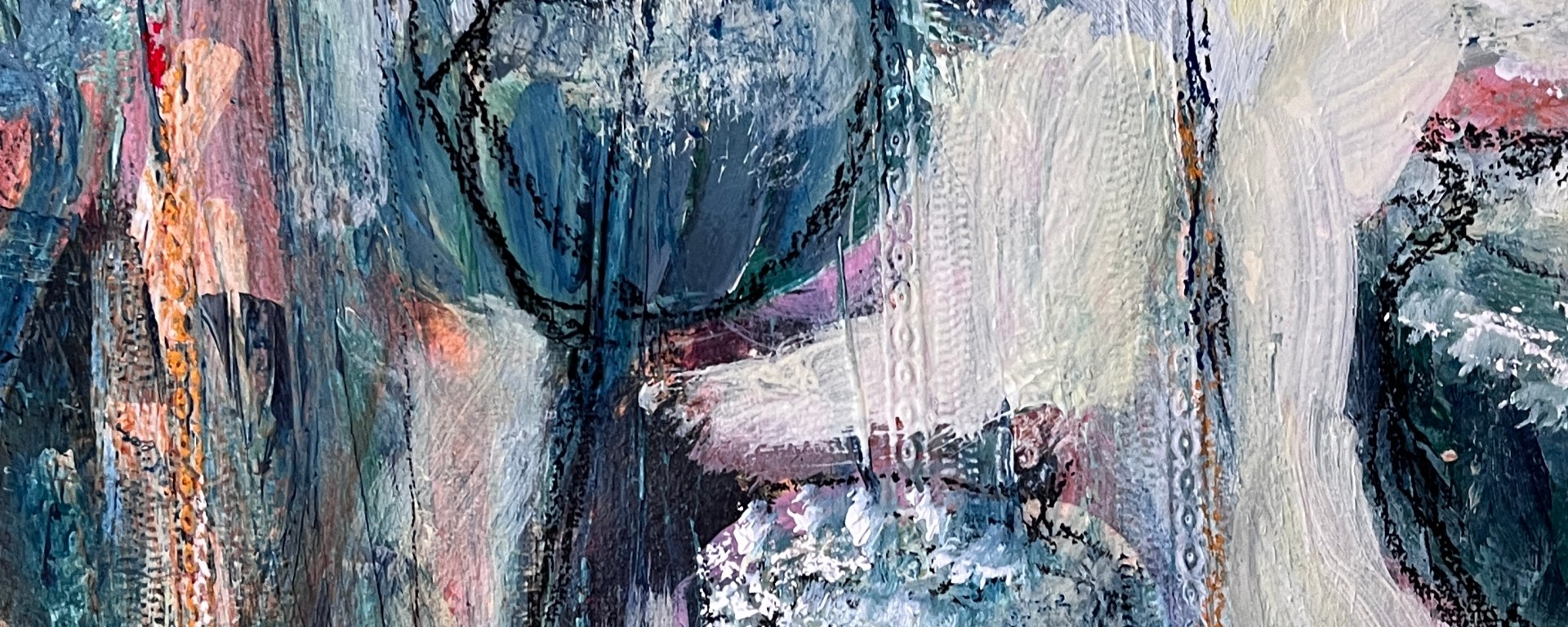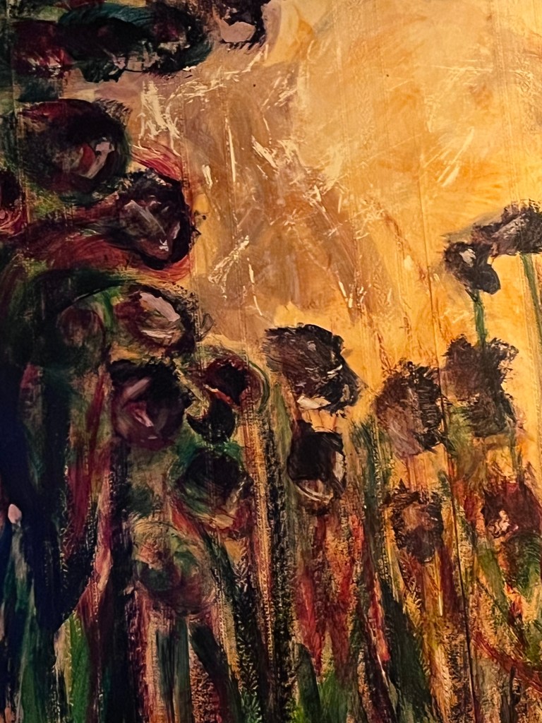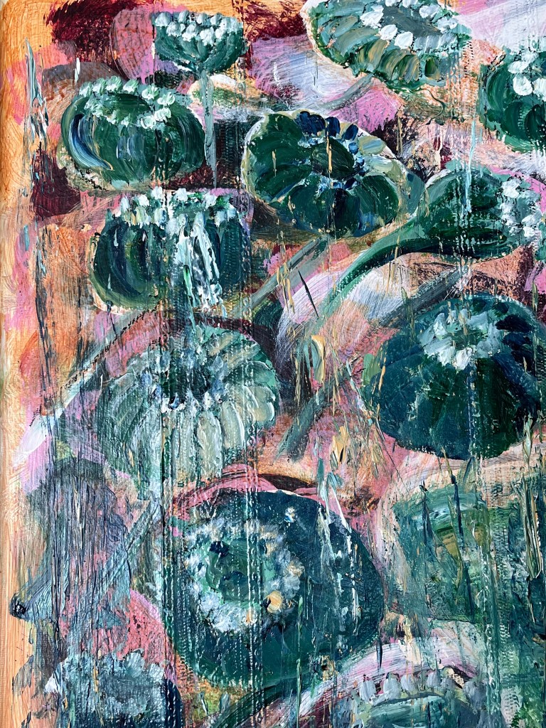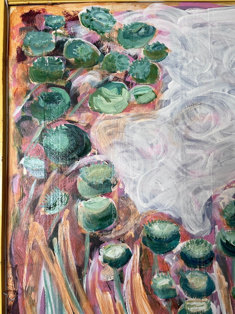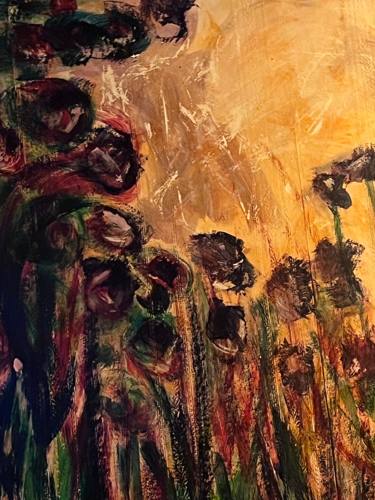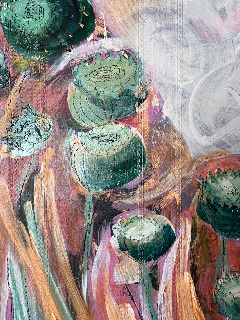 The painting, my sister’s from her degree show, and the stencilled vine suggested foliage but quite how we got from that gentle thing to this, I’ll never know. I blame OCA.