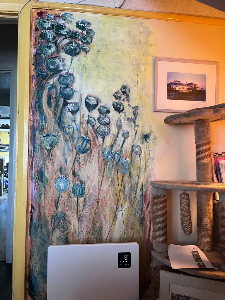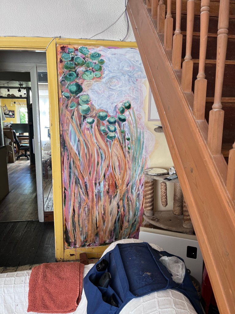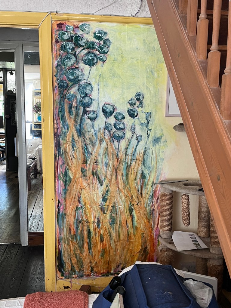 Once upon a time, I’d stencilled some flowers up the side of the door frame in the space between that and a painting, but suddenly they had had their day. Artist me told decorator me that we’d got this; we could paint on a wall in acrylics and gloss, with brushes, sponges, and flannels just as we did on the 30″x40″ canvases we’ve got used to. And anyway, we had a can of white and a can of yellow to cover it all up again if need be. So artist me won out and off we went.