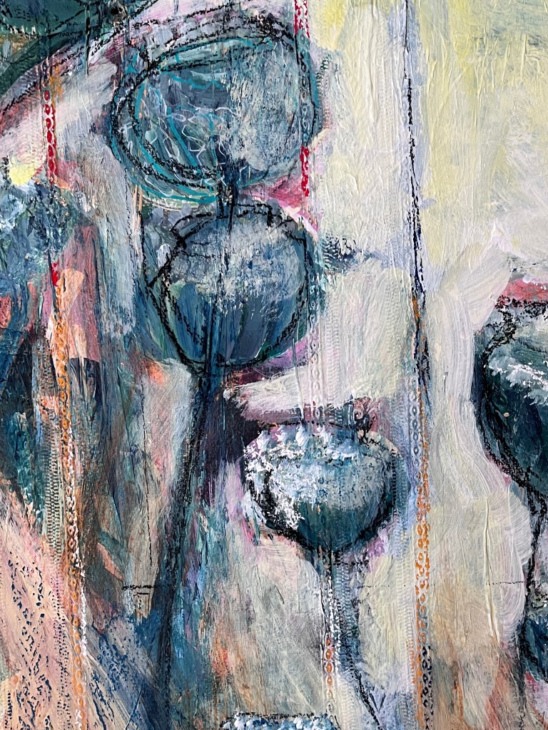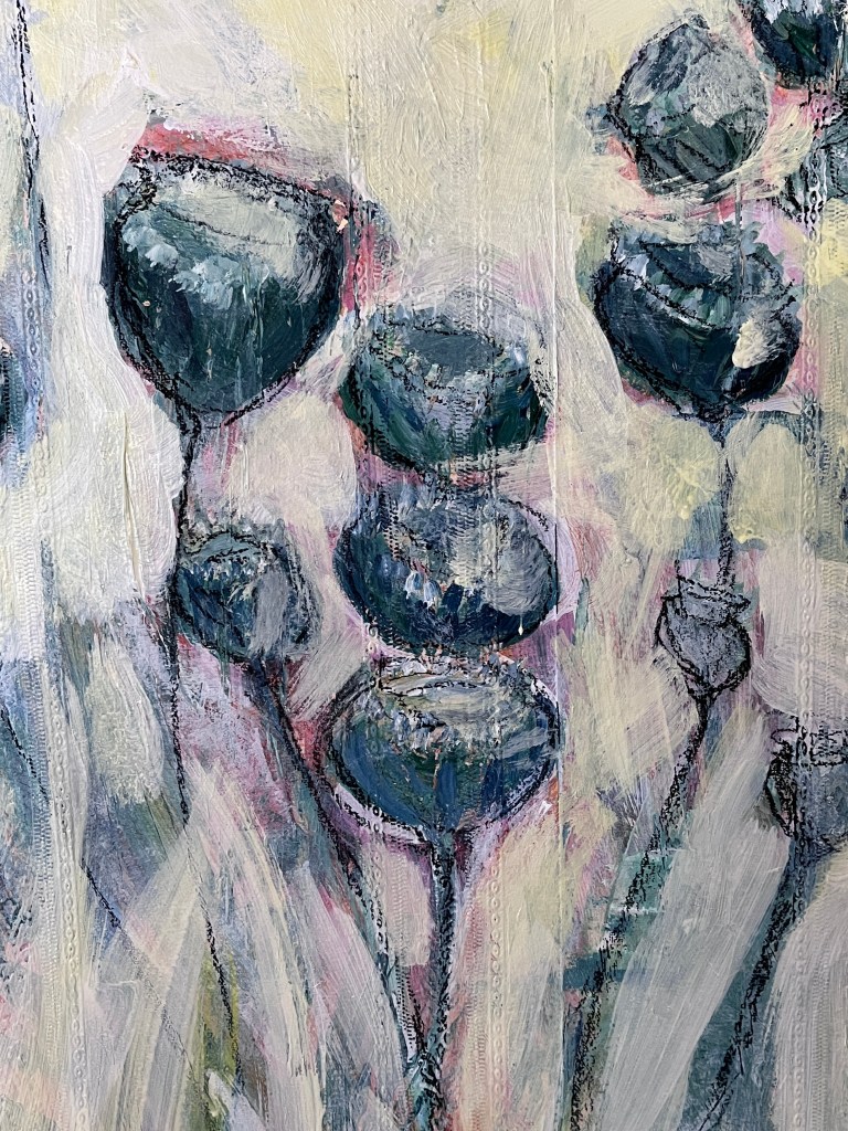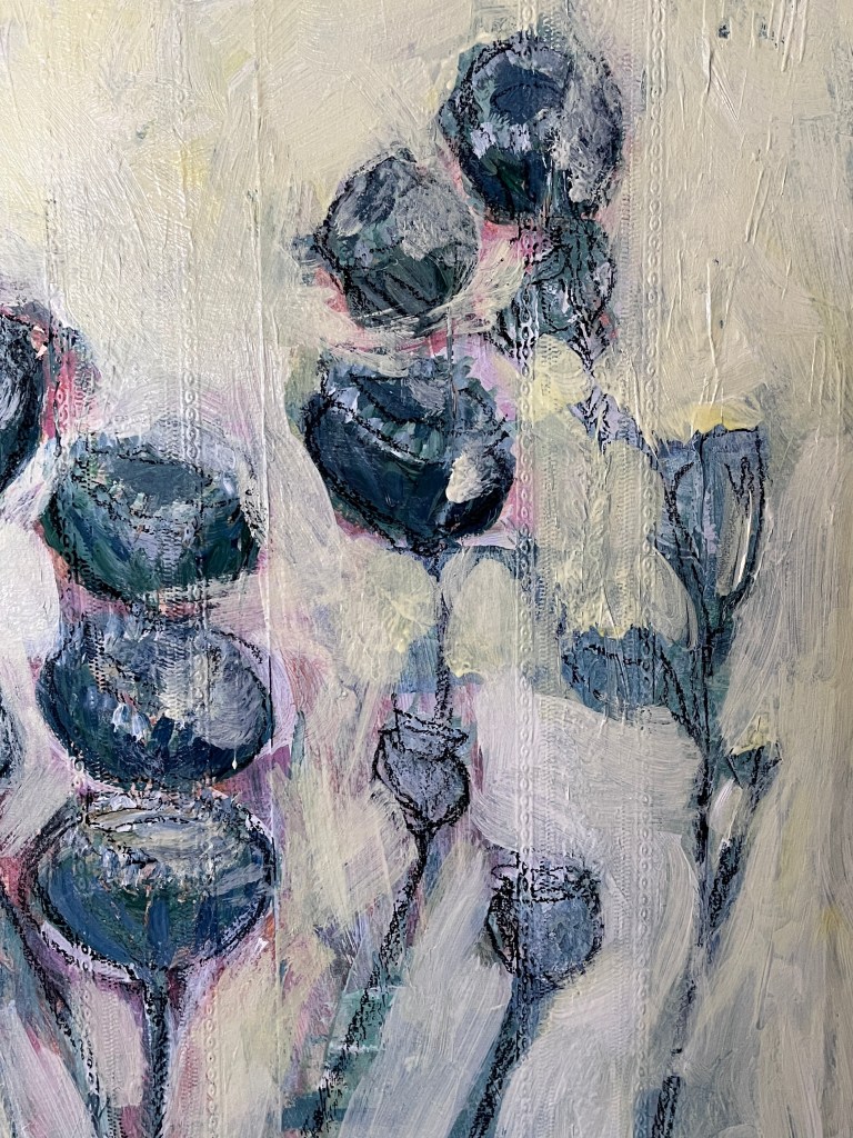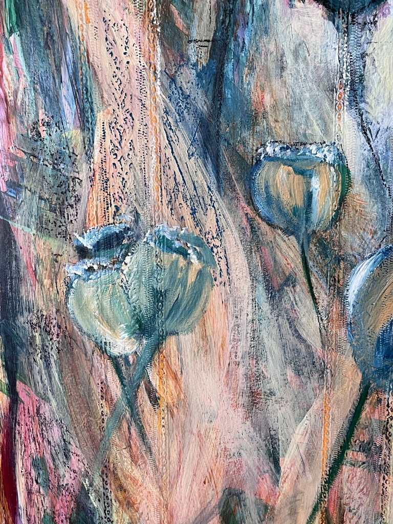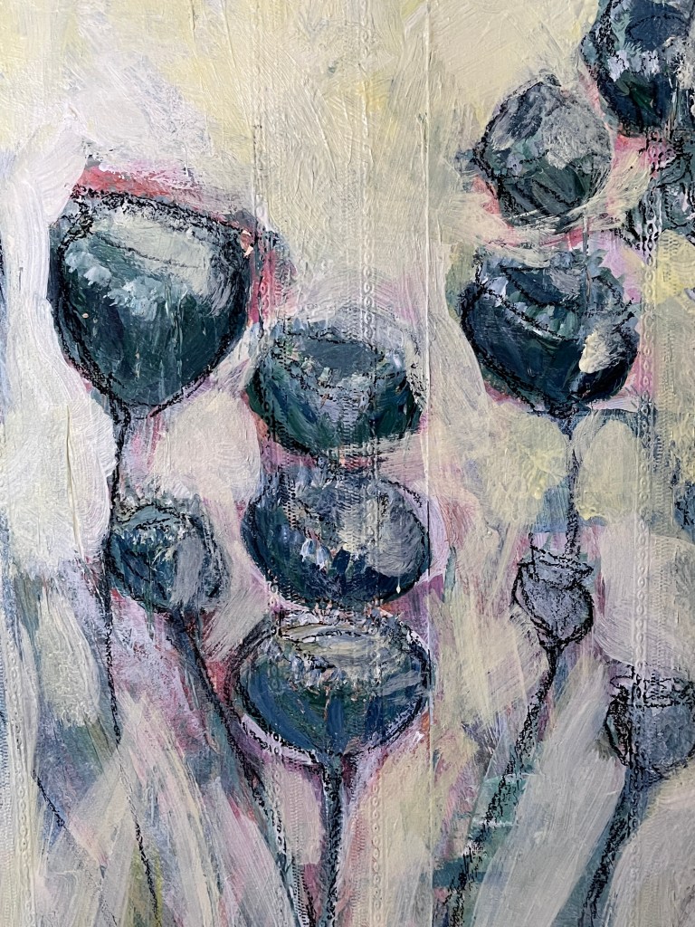 This was after lunch when carefully picked out poppy seed heads, then added temporary detail with charcoal, and finally went berserk with a pebble. It’s quite shiny, which doesn’t help show it off to its best, but it’s just possible its best was about three hours earlier. I think there are some decent ‘moments’ in there even if the rest has gone a little off piste. Still, a change of light might make a difference, as will later lamp light, and tomorrow is another (editing) day.