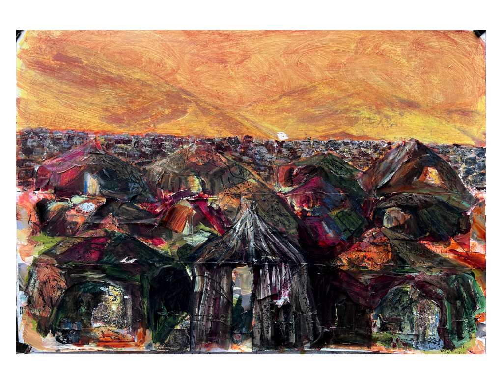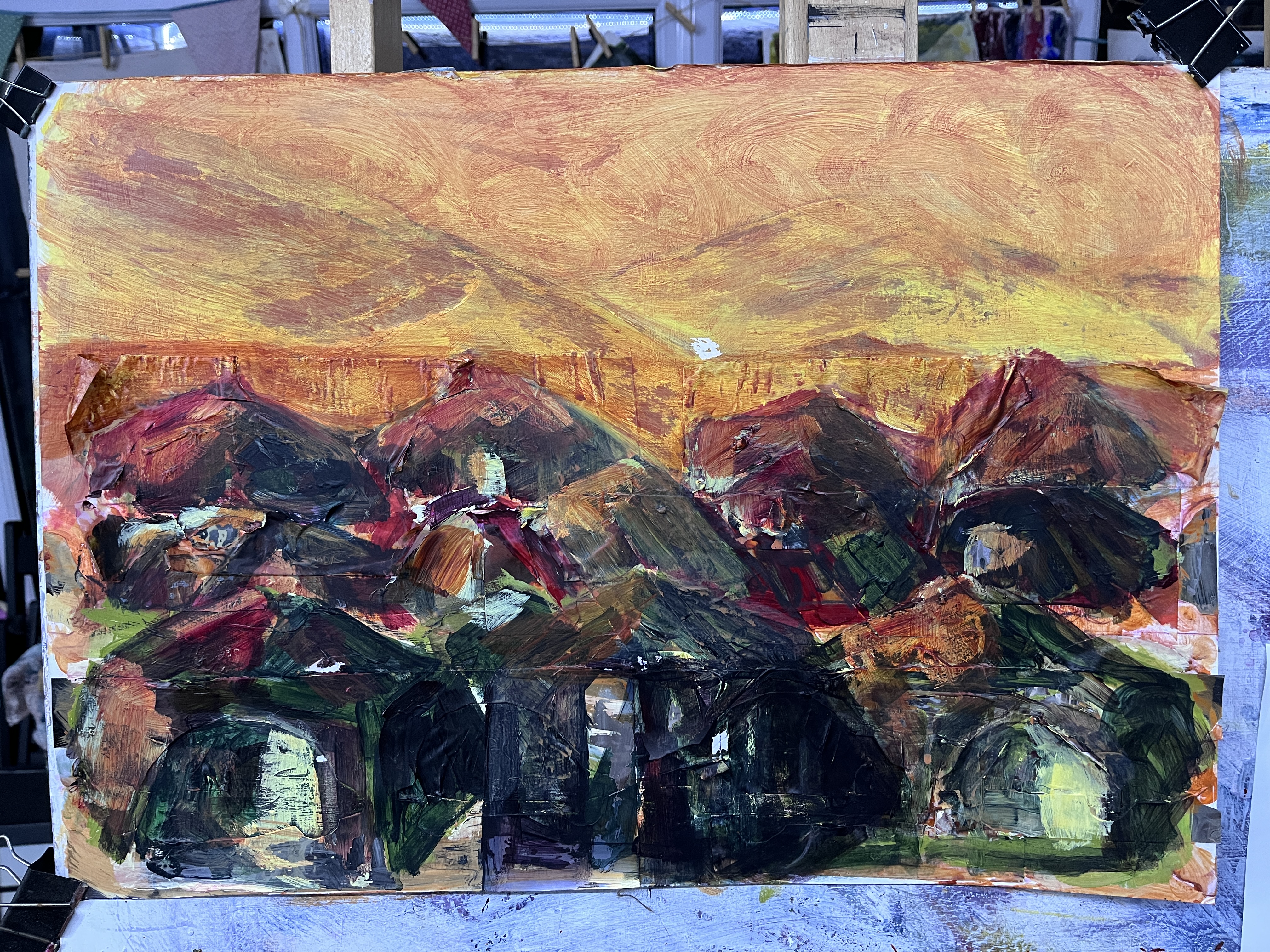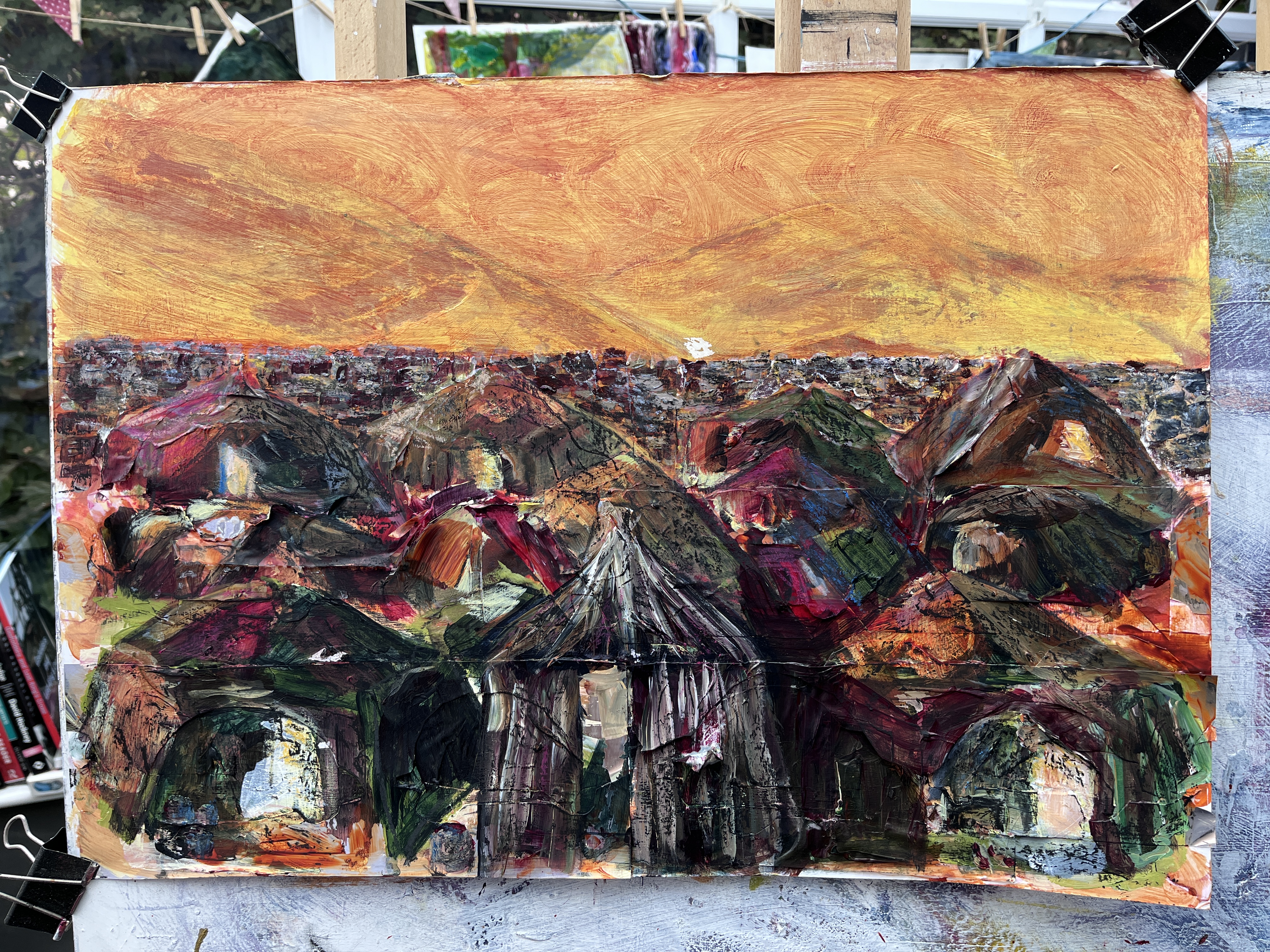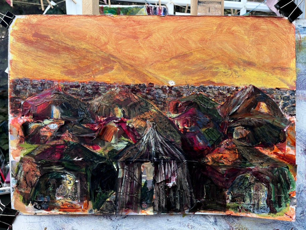 The string of ambulances at the bottom has become a new string of tents. Looking at the photos, and also the painting from a distance, helps bring to my attention shapes and shadows I don’t see close up, so time and space are important parts of the process.