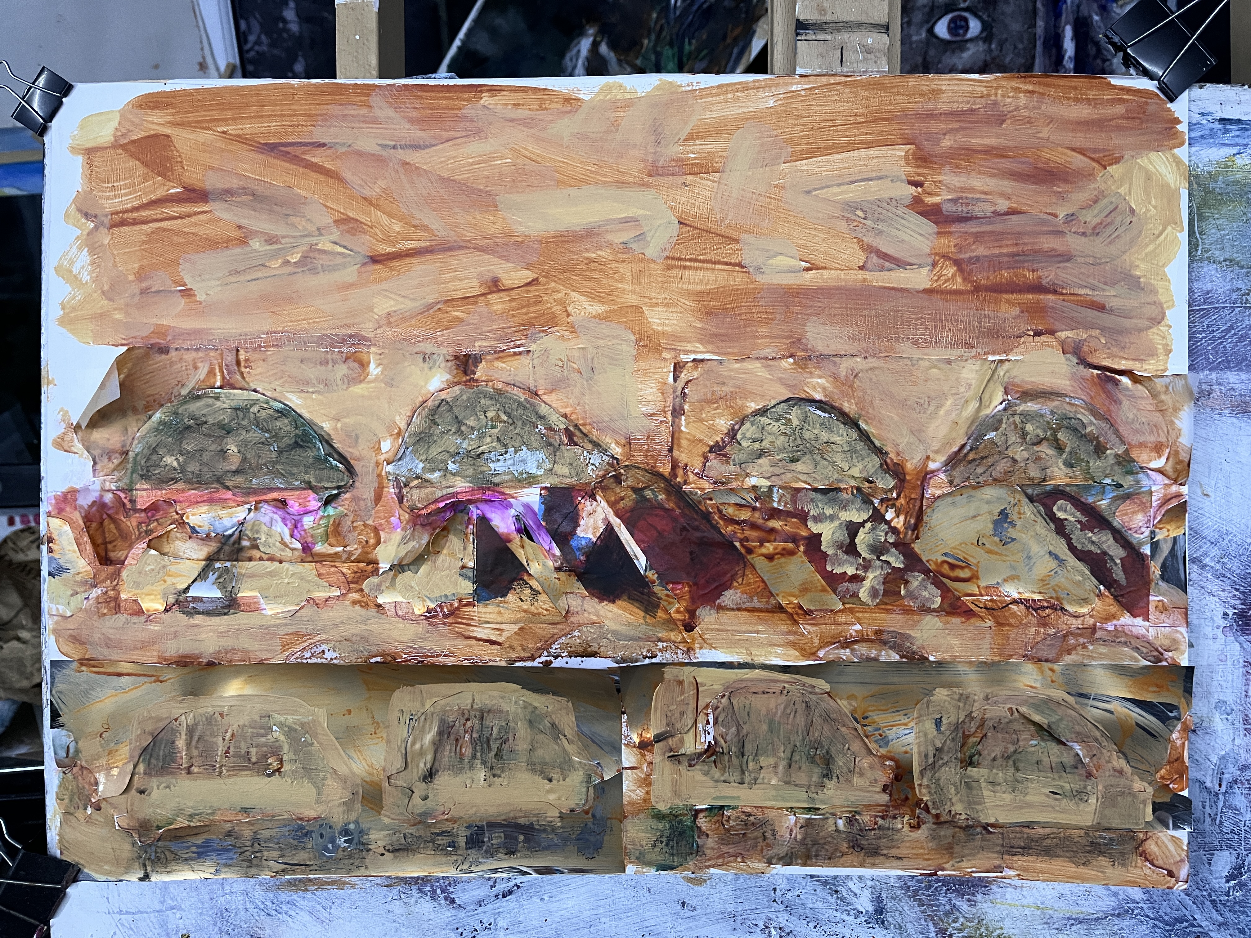I have a piece on the back of something else that I stuck collaged vehicles onto, using mirror foil, tracing paper, and the paper that came off the back of the mirror foil. It’s a spreadsheet. So now I’m inventing ways to give it some substance and, after sloshing burnt sienna all over it, some of it sinking into the primer and some running off the collaged areas, I can see rows of tents in the desert.