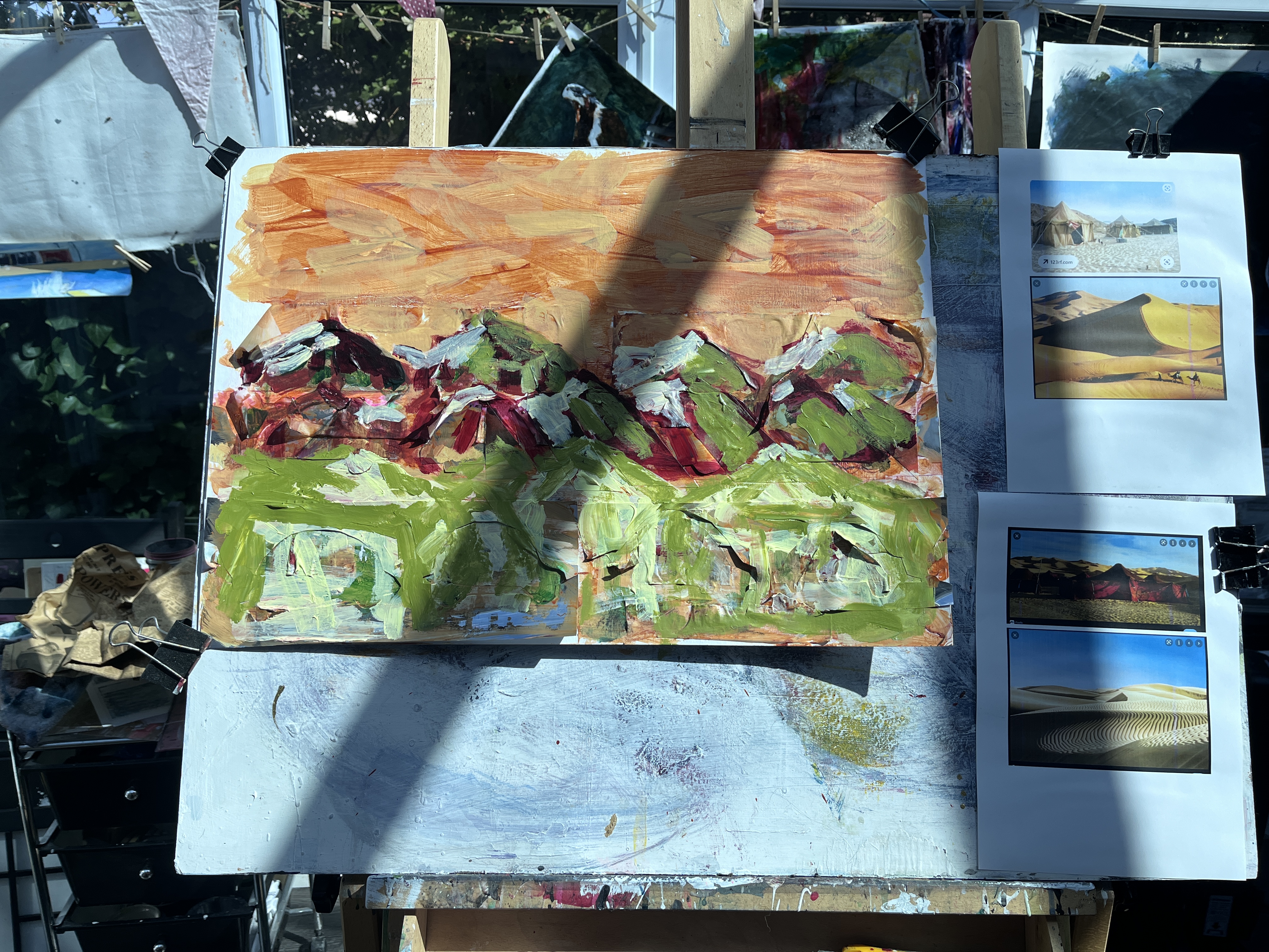 Since I’ve settled (for now) on a desert theme, I’ve found some reference photos and, with Dune still in mind, begun working shapes and shadows into what were cut out cartoon cars.