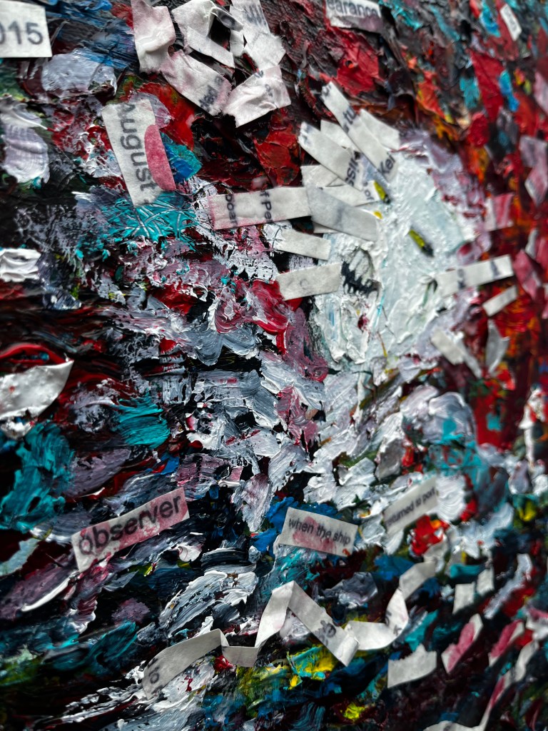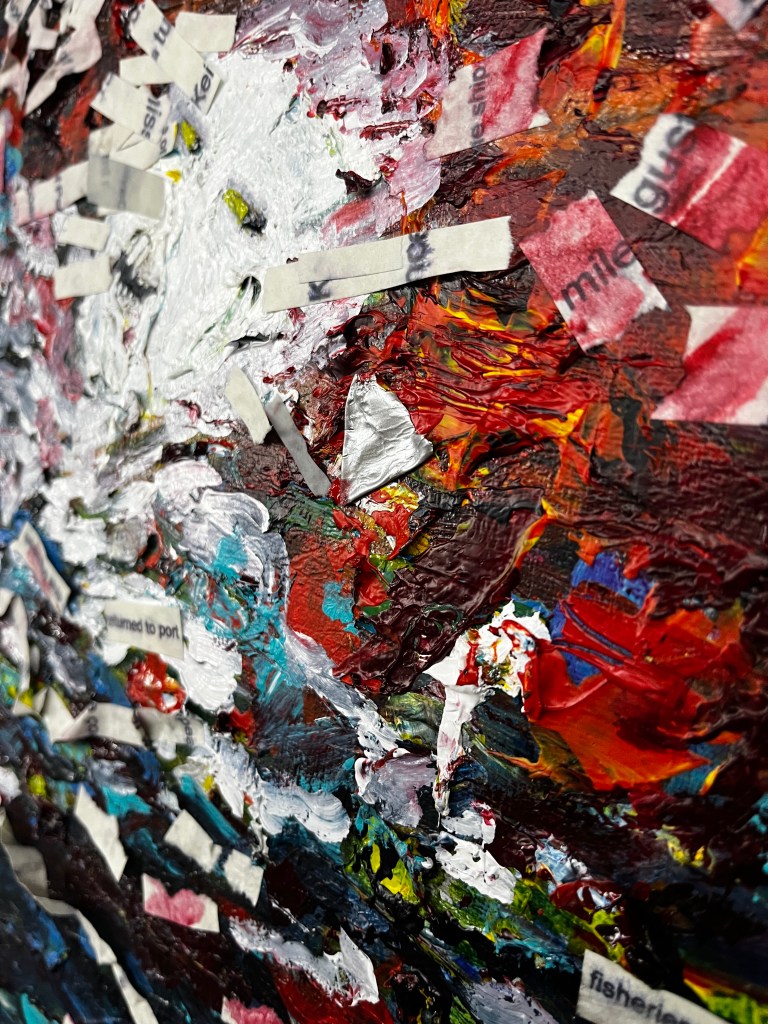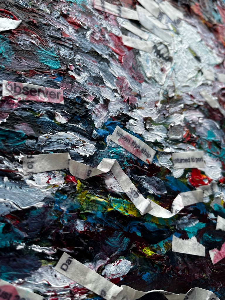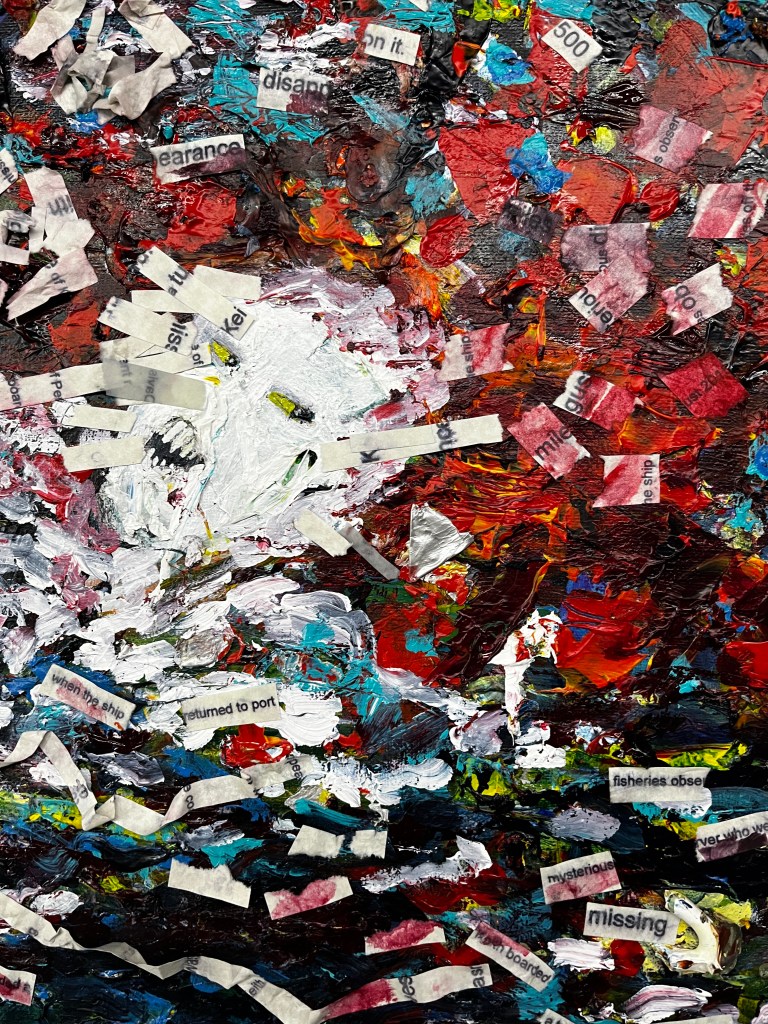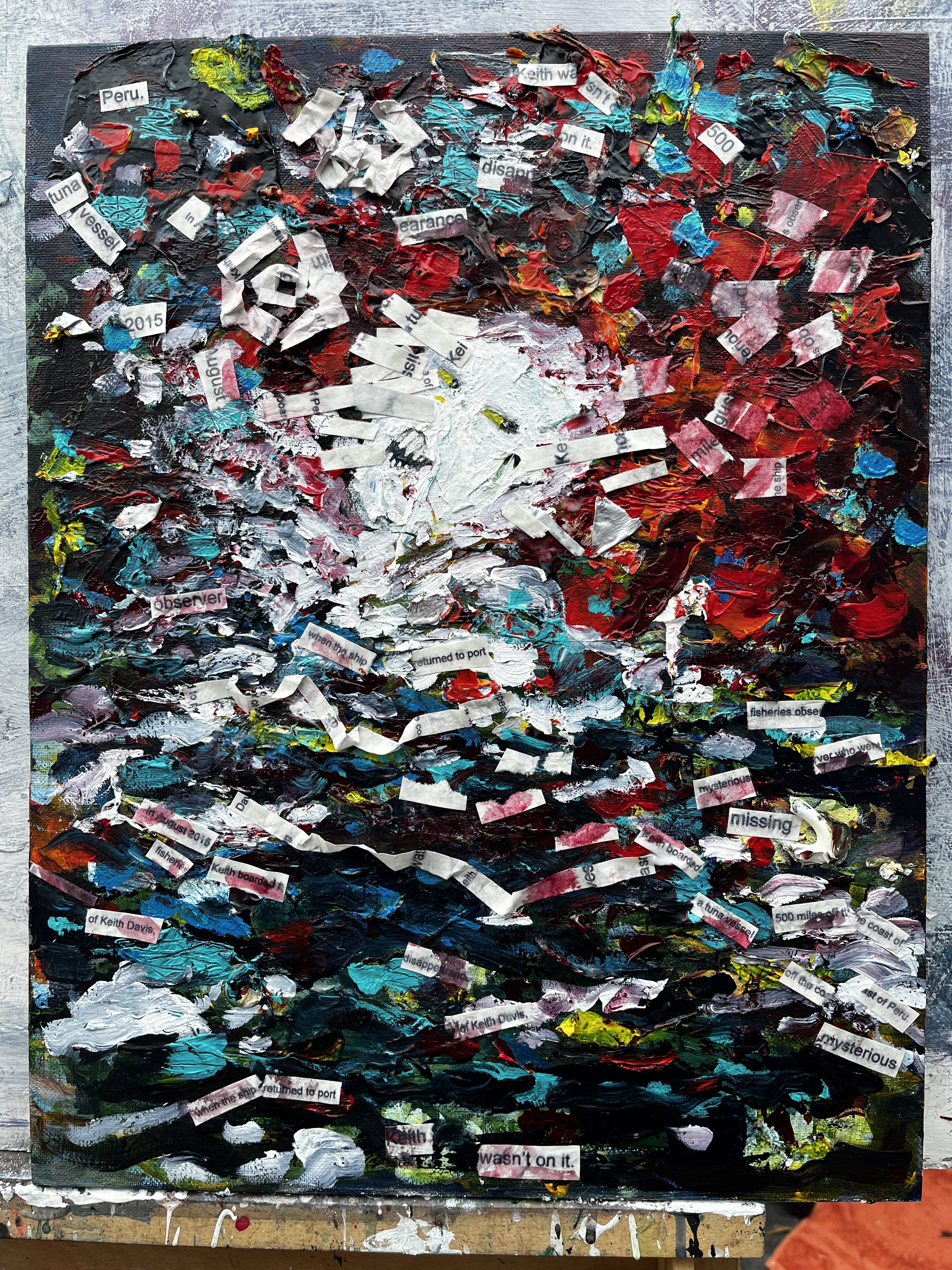 Some of the ‘pixels’ are collaged pieces of the text from the BBC podcast’s site which simply describes how Keith Davis went missing 500 miles off the coast of Peru in 2015. I’ve torn these pieces up and glued them into place as strips or pieces so they bring both scales and foam to mind. The paper is parchment soaked in water so that the ink of typed words has run.
