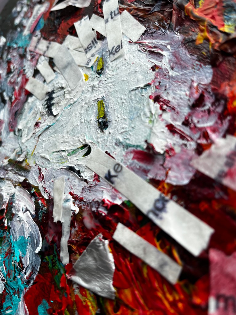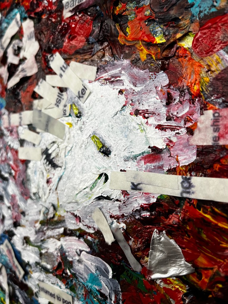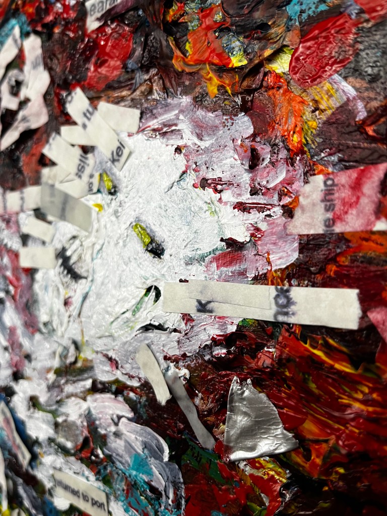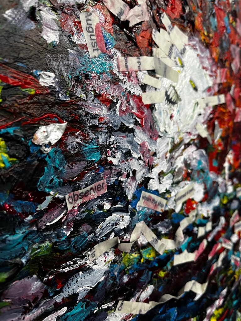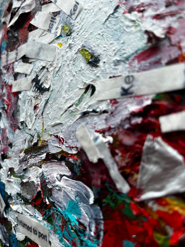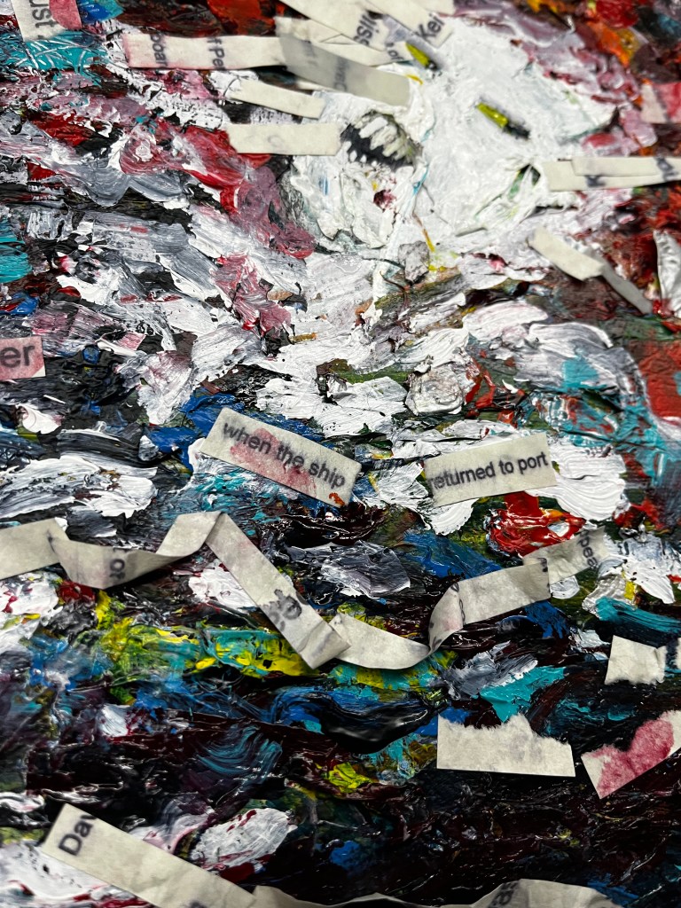 Some of the ‘pixels’ are collaged pieces of the text from the BBC podcast’s site which simply describes how Keith Davis went missing 500 miles off the coast of Peru in 2015. I’ve torn these pieces up and glued them into place as strips or pieces so they bring both scales and foam to mind. The paper is parchment soaked in water so that the ink of typed words has run.