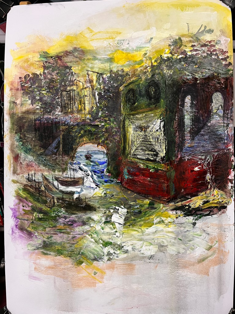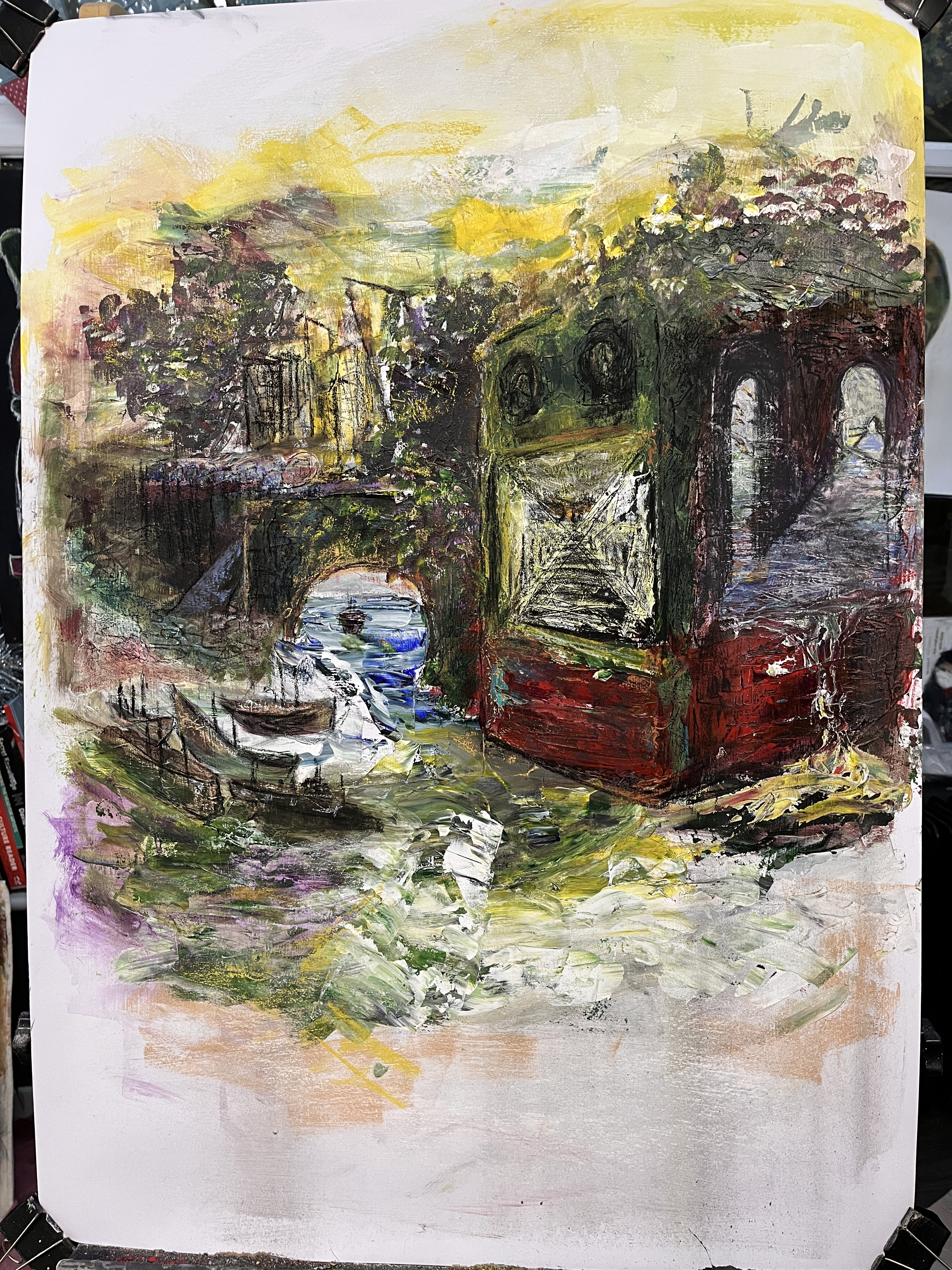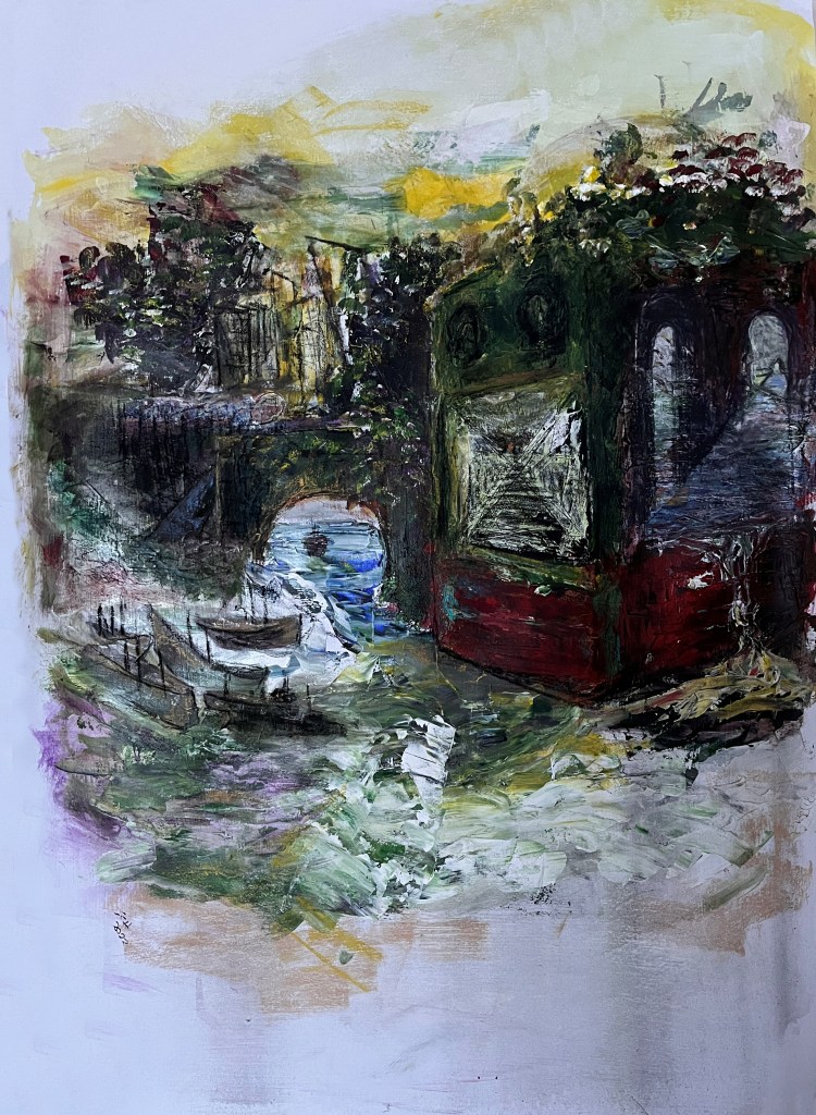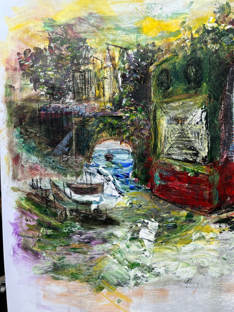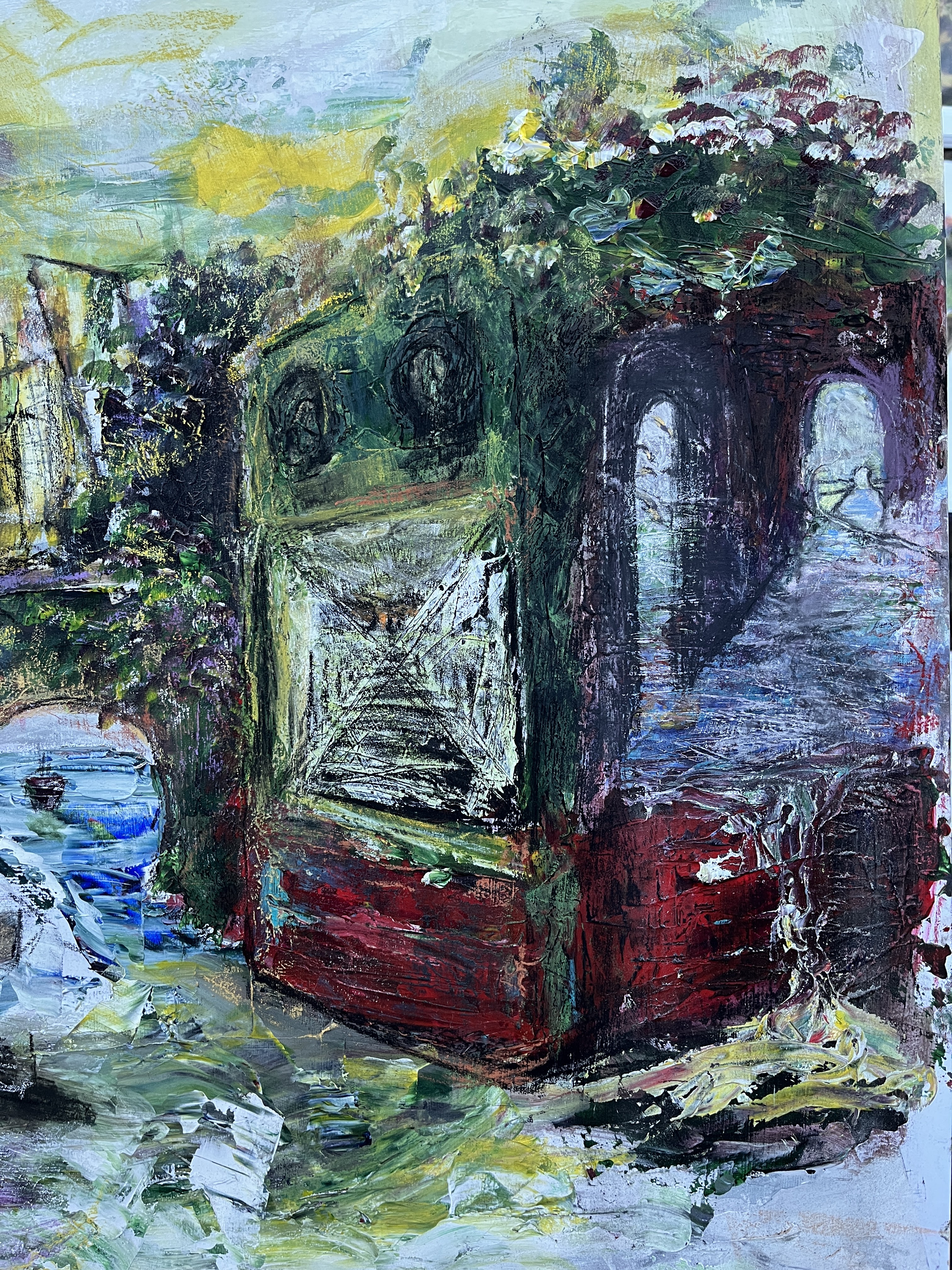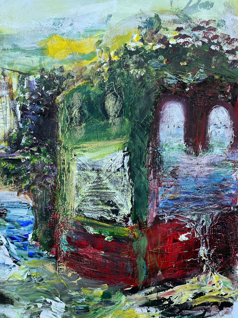 This piece, which isn’t finished yet, epitomises my strategic lack of strategy in that I’ve learned to trust my imagination and as yet limited technique to build something from a raw idea. I have re-read the poem several times and wanted to include the key elements but without turning the painting into an all-you-can-eat poem menu. I began with the bridge in the centre. I’d found a photo of it, its arch now bricked over, a dead end; and the train that would have run on that line. I chose a photo of a coal transporter. Then there was the viaduct, a structure that often arches over valleys, of which there are many in Wales. Another photo reference. The docks are hinted at by the presence of water, some of it tumbling, some halfway to being waves; and the whole is permeated by green and yellow – the sun and the foliage that has replaced the abandoned buildings and toxic industry.