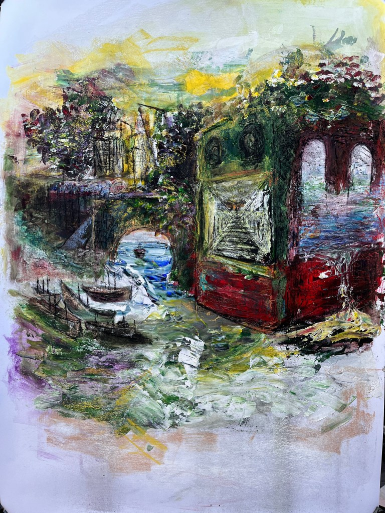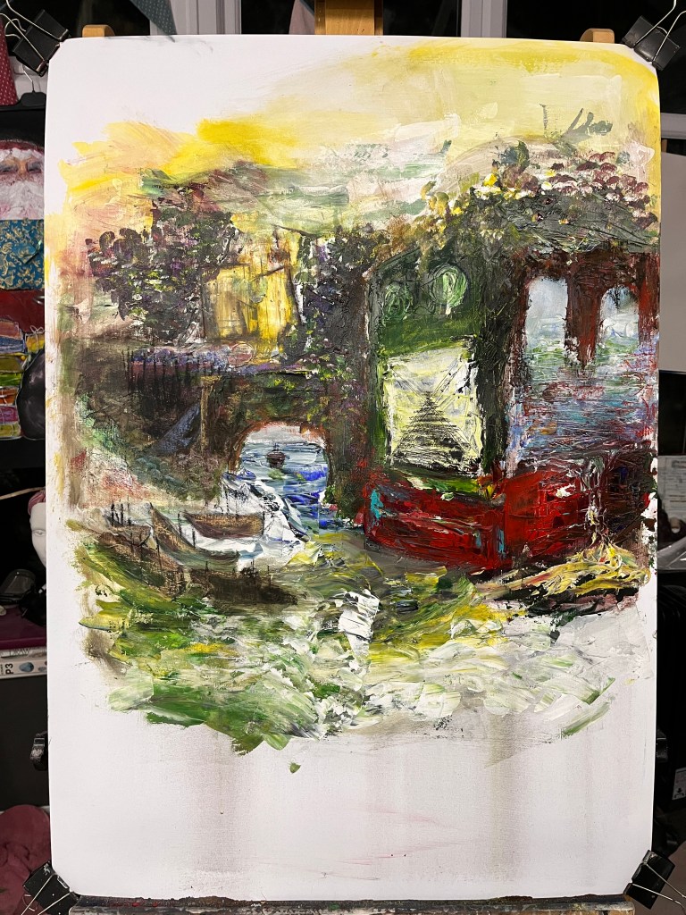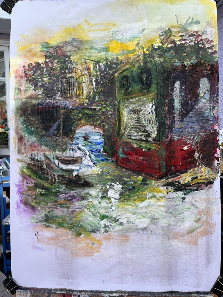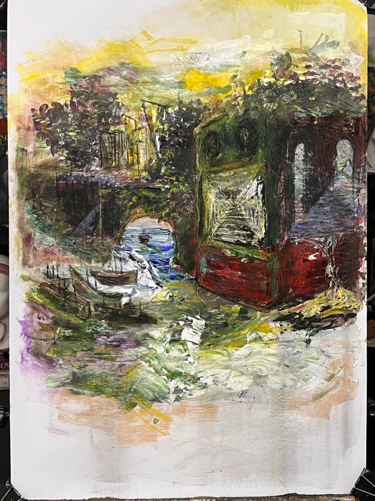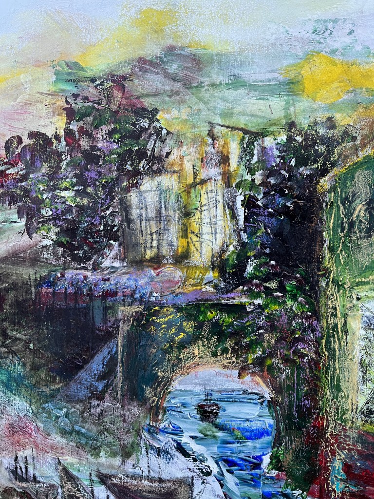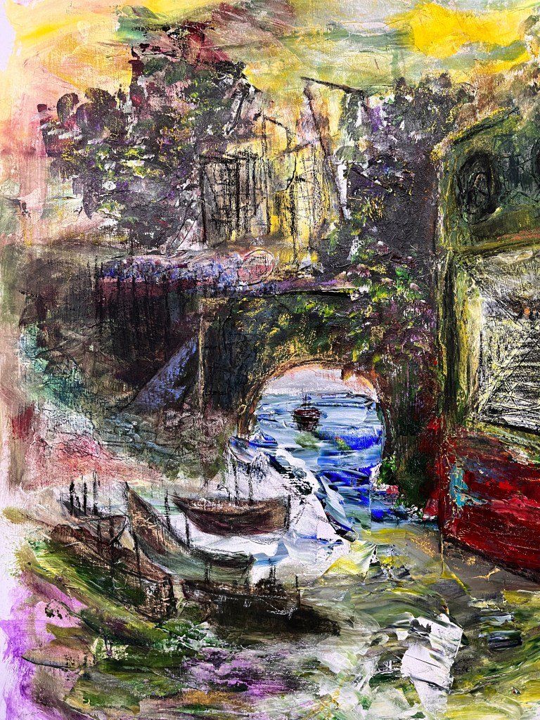 This piece, which isn’t finished yet, epitomises my strategic lack of strategy in that I’ve learned to trust my imagination and as yet limited technique to build something from a raw idea. I have re-read the poem several times and wanted to include the key elements but without turning the painting into an all-you-can-eat poem menu. I began with the bridge in the centre. I’d found a photo of it, its arch now bricked over, a dead end; and the train that would have run on that line. I chose a photo of a coal transporter. Then there was the viaduct, a structure that often arches over valleys, of which there are many in Wales. Another photo reference. The docks are hinted at by the presence of water, some of it tumbling, some halfway to being waves; and the whole is permeated by green and yellow – the sun and the foliage that has replaced the abandoned buildings and toxic industry.