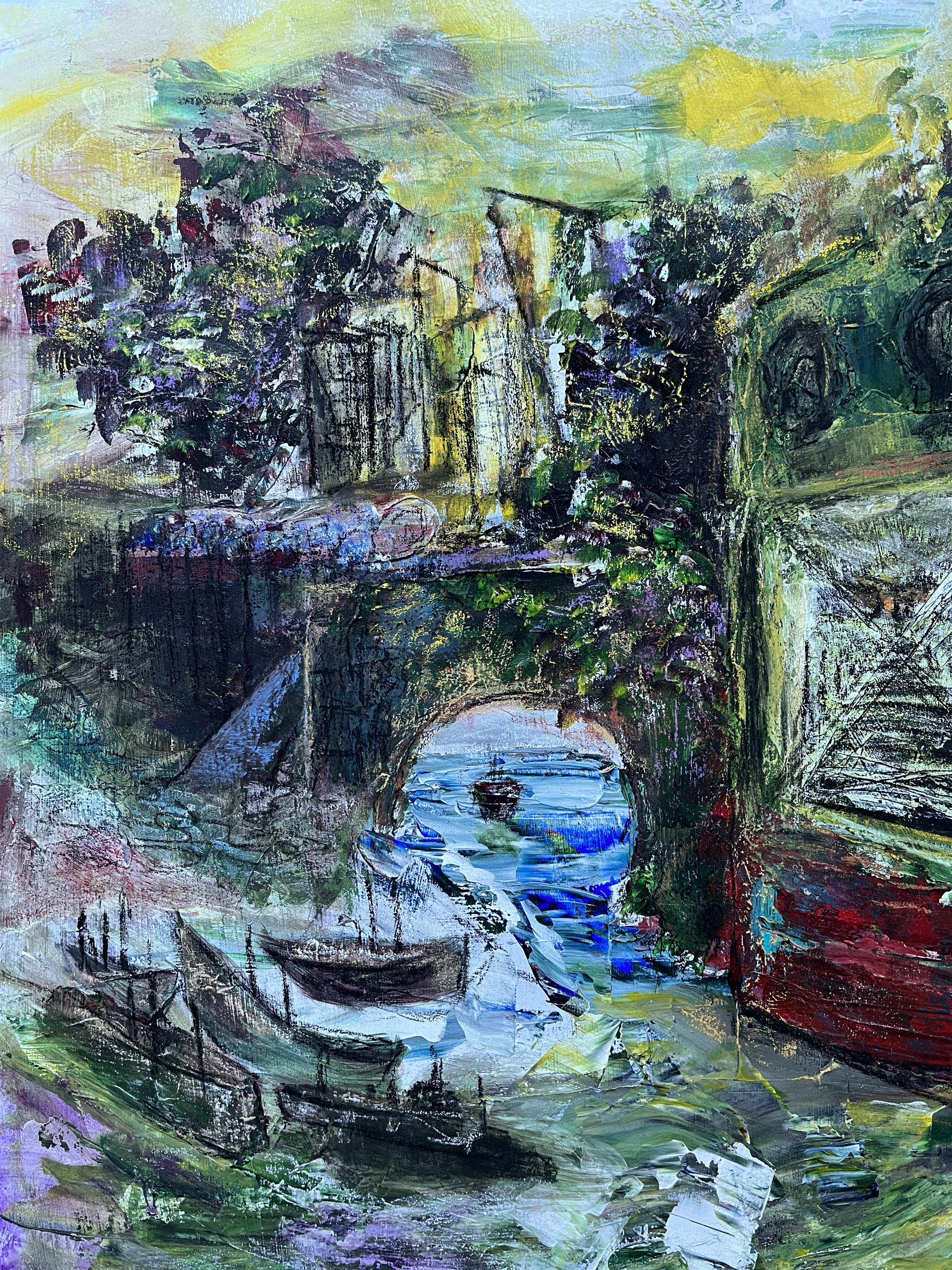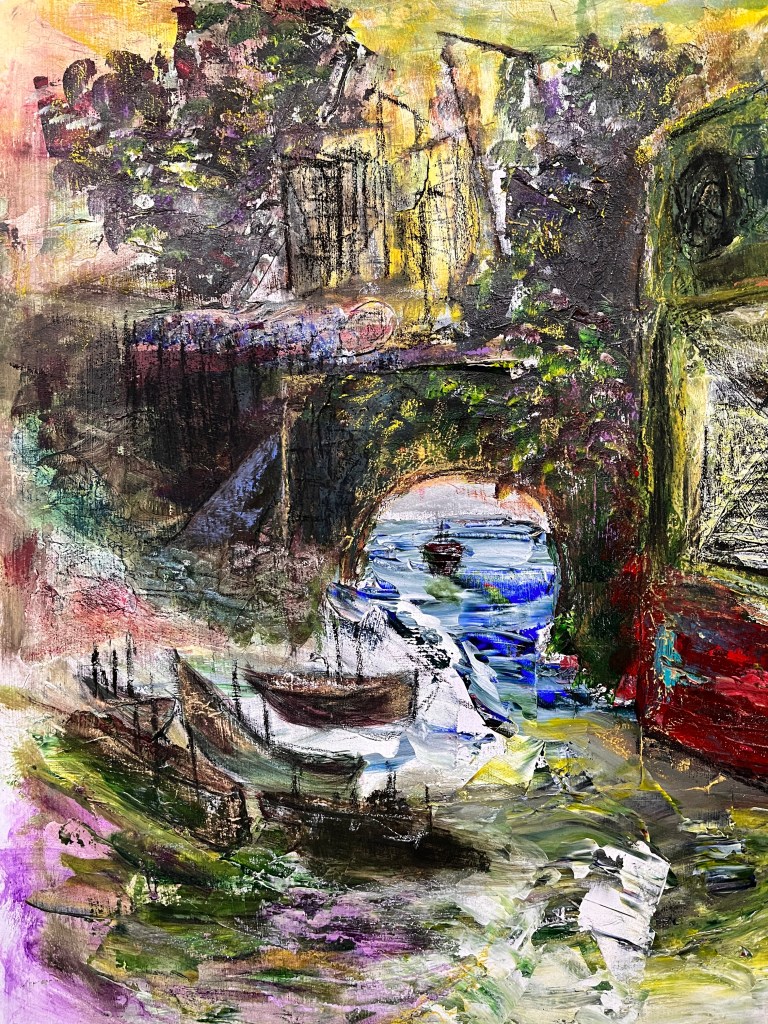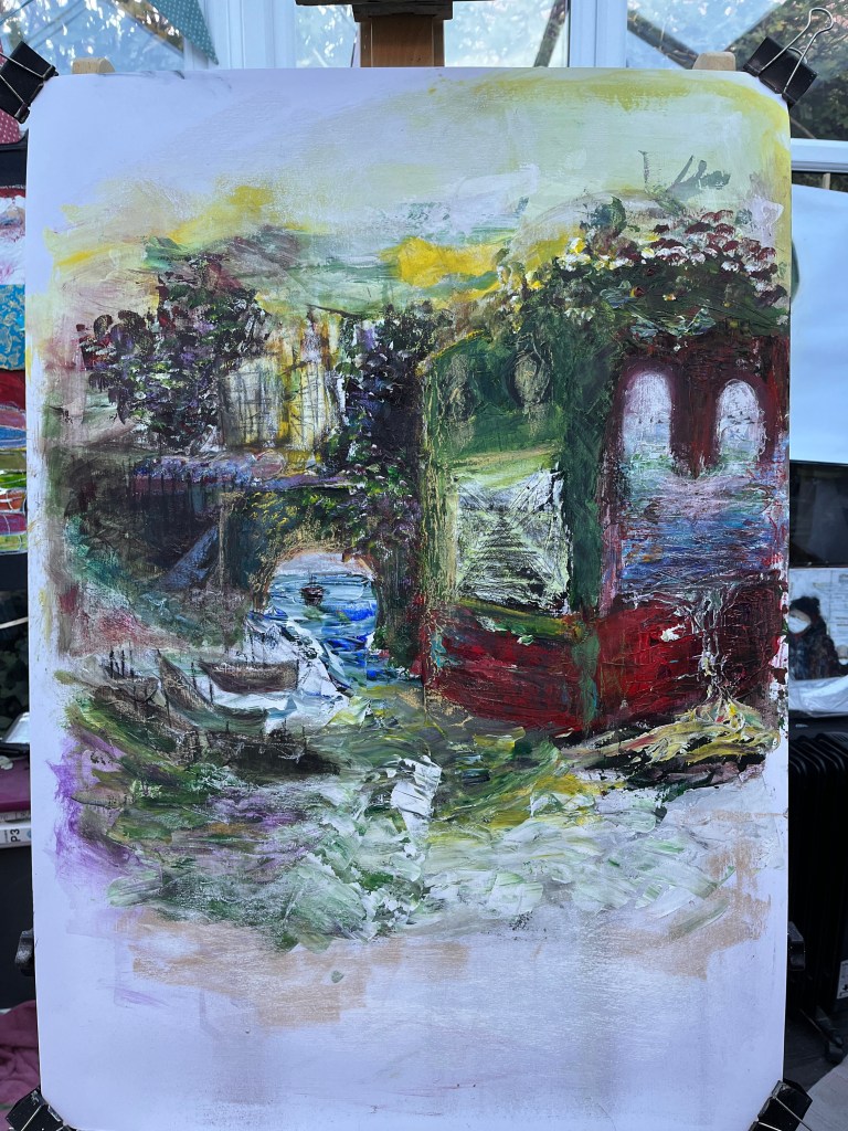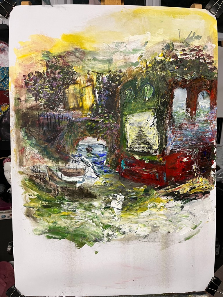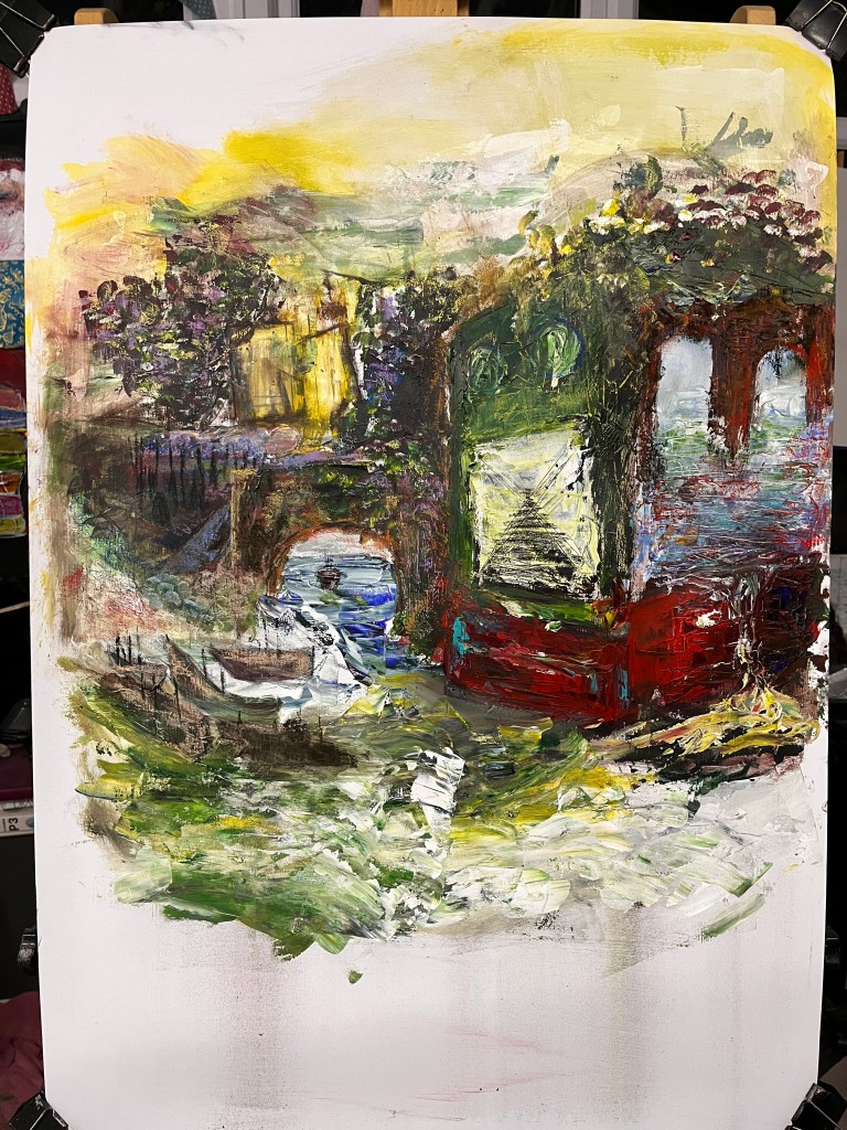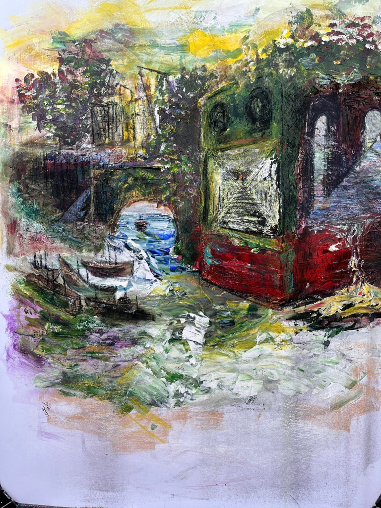 This piece, which isn’t finished yet, epitomises my strategic lack of strategy in that I’ve learned to trust my imagination and as yet limited technique to build something from a raw idea. I have re-read the poem several times and wanted to include the key elements but without turning the painting into an all-you-can-eat poem menu. I began with the bridge in the centre. I’d found a photo of it, its arch now bricked over, a dead end; and the train that would have run on that line. I chose a photo of a coal transporter. Then there was the viaduct, a structure that often arches over valleys, of which there are many in Wales. Another photo reference. The docks are hinted at by the presence of water, some of it tumbling, some halfway to being waves; and the whole is permeated by green and yellow – the sun and the foliage that has replaced the abandoned buildings and toxic industry.
