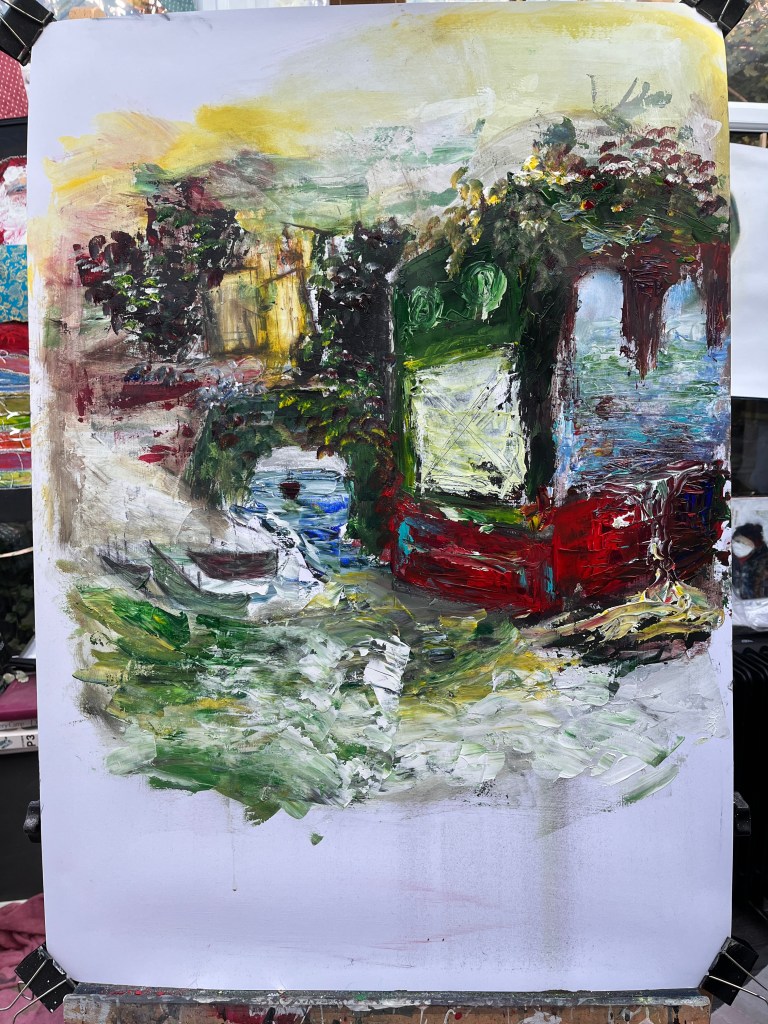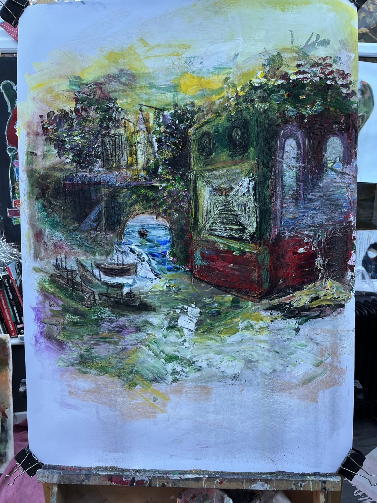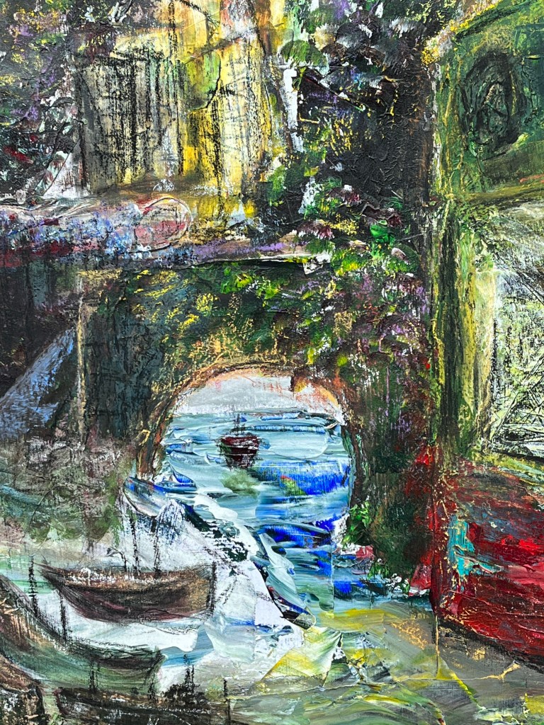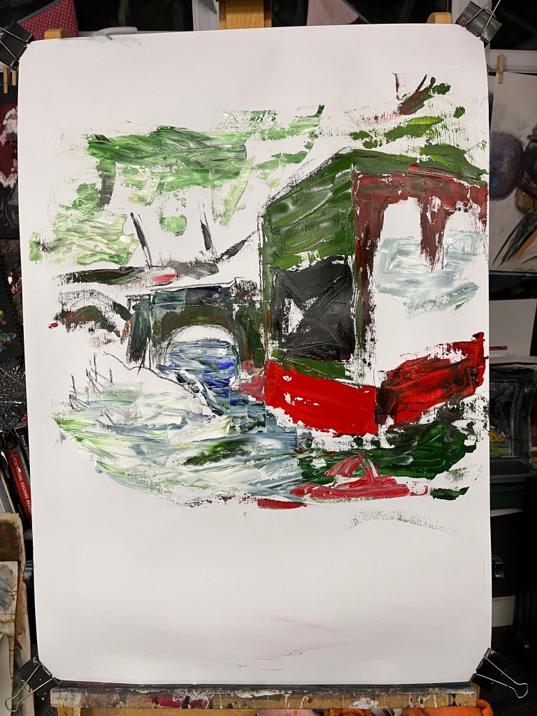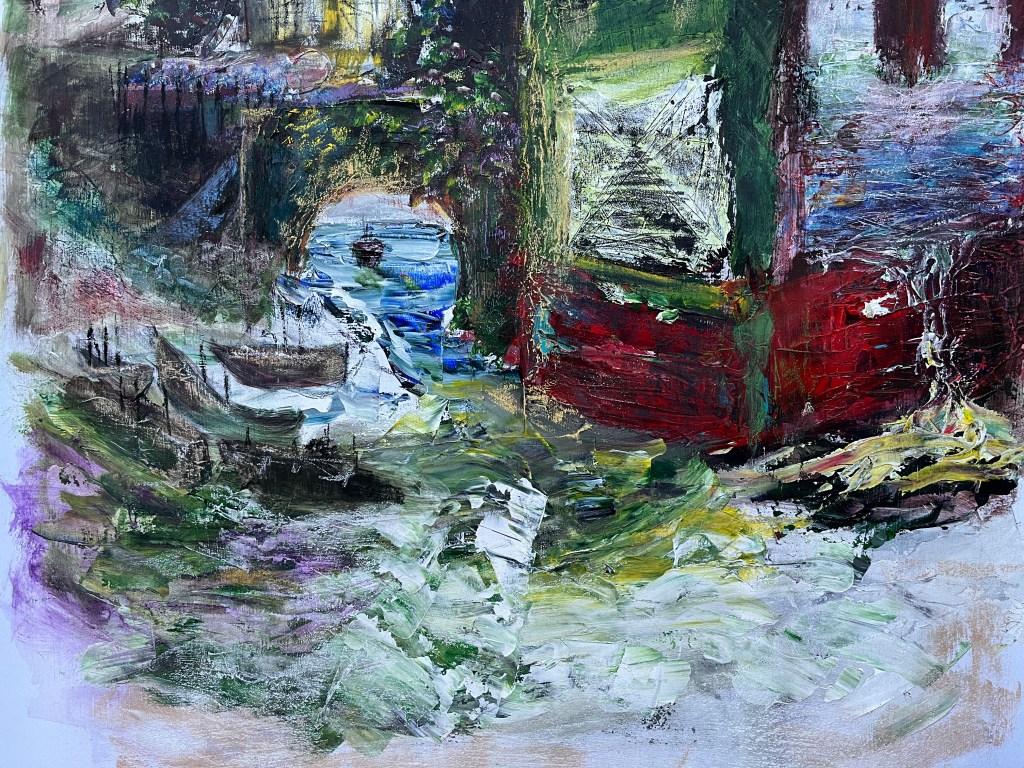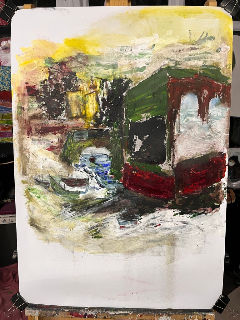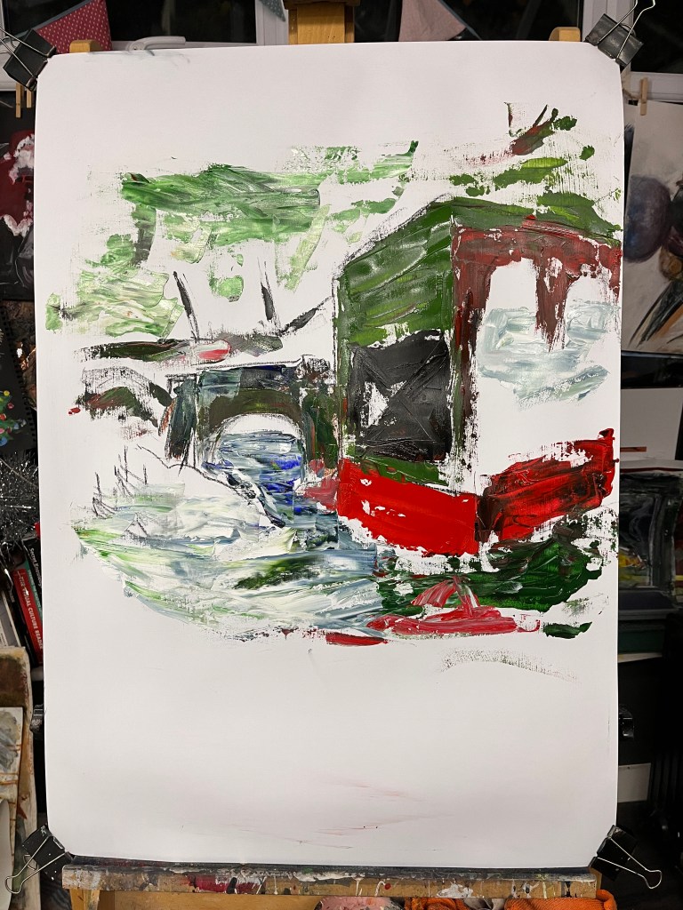 This piece, which isn’t finished yet, epitomises my strategic lack of strategy in that I’ve learned to trust my imagination and as yet limited technique to build something from a raw idea. I have re-read the poem several times and wanted to include the key elements but without turning the painting into an all-you-can-eat poem menu. I began with the bridge in the centre. I’d found a photo of it, its arch now bricked over, a dead end; and the train that would have run on that line. I chose a photo of a coal transporter. Then there was the viaduct, a structure that often arches over valleys, of which there are many in Wales. Another photo reference. The docks are hinted at by the presence of water, some of it tumbling, some halfway to being waves; and the whole is permeated by green and yellow – the sun and the foliage that has replaced the abandoned buildings and toxic industry.