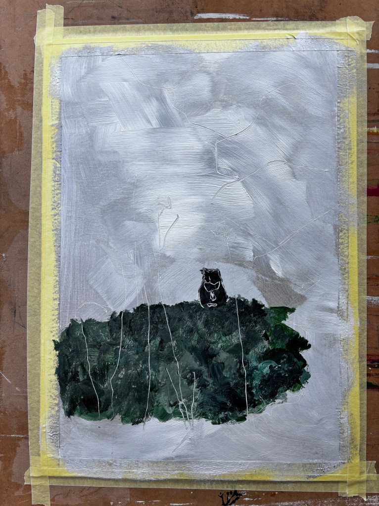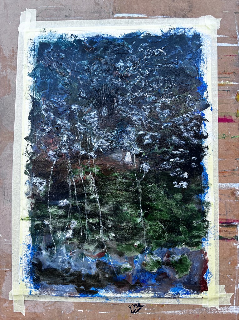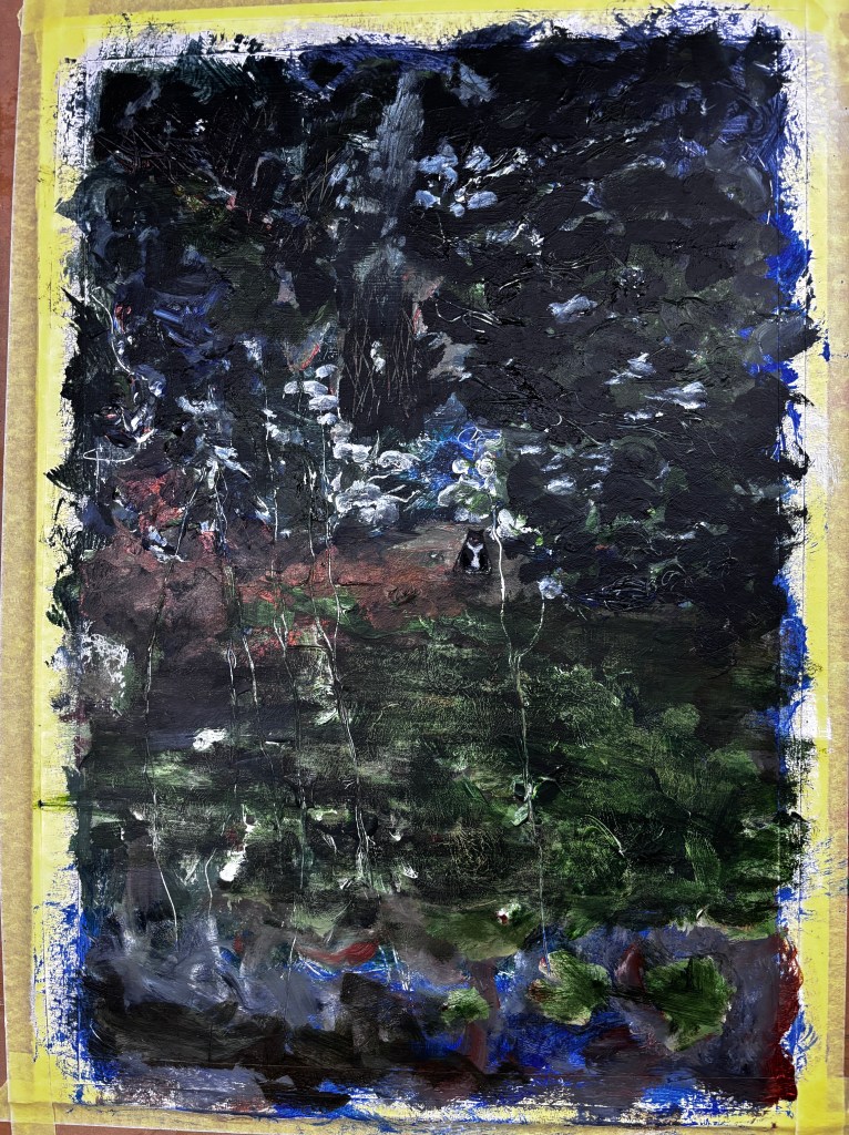 While I was tempted to go for a deep orange or bright pink as the underpainting, I think I may have seen it enough times on Landscape Artist of the Year to consider it a trope. This is a white acrylic gesso primer with silver and white paint scrubbed into it and a mix of Hooker’s green, Viridian green, and Payne’s Grey forming the grass. The white threads are the thin remnants of Golden Rod (solidago) in the foreground, drawn into the paint with a stylus. It’s a little darker than I think I want at the moment, but I’ll know more when I start on the foliage. The size is A3 card and for once I’ve felt driven to give it a border by applying masking tape. At this point I’m willing someone to stop me at the crucial moment.