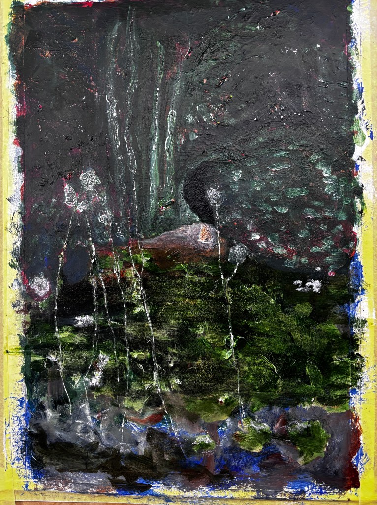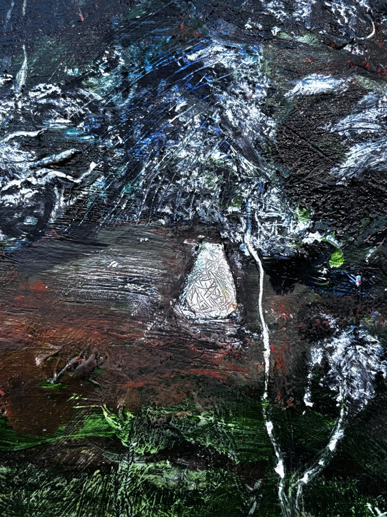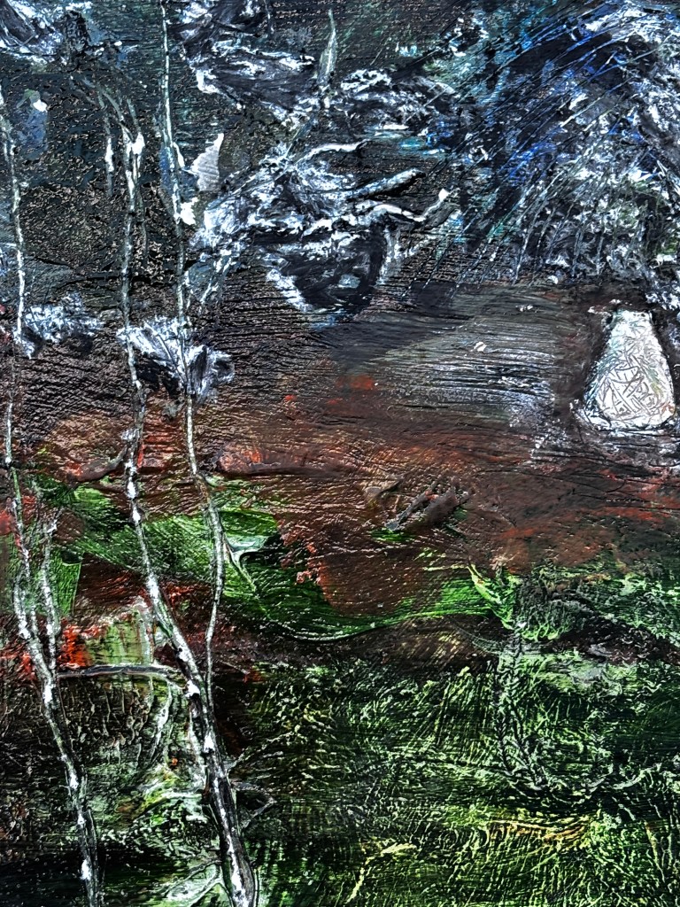 What I think I can see is that there is a tunnel and it curves to the right but there isn’t enough change of tone to illustrate that. I’m quite taken with the patterns, especially in the grass/pond, and also the white foliage (last summer’s Golden Rod) which I scratched into the paint with a stylus. These are foreground elements and these need to take their place in that capacity while still being fragile. Then I need to make better sense of the scramble of elements towards the top; at the moment some of them look more like a giant spider than a mash-up of overlapping branches and twigs curving into a central space! Tomorrow and tomorrow and tomorrow, to-borrow from the Bard. (Macbeth https://www.poetryfoundation.org/poems/56964/speech-tomorrow-and-tomorrow-and-tomorrow)