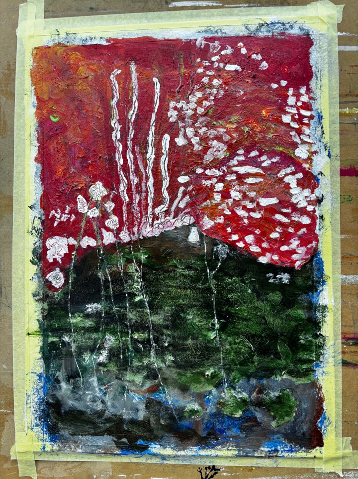Part strawberry, part deadly fungus, this is the new under-painting for the top half of the painting. I quite like it as it is though!