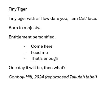 One of my problems with painting cats, especially my own cats, is that I am too close to them and tend to attempt more realism than I want anywhere else in a painting. One solution has been to paint without my close vision glasses because that stops me detailing everything. It’s not perfect though – or rather the attempt to present the cat as perfect is a residual issue. This cat went through several iterations, sizes, and shapes until I had a more spontaneous representation of, not the cat in the photo but the one I find the most difficult to paint, my small brown tabby. Aiming for subtlety and something more cat qua cat than clear representation, this took quite some time and definitely no glasses.