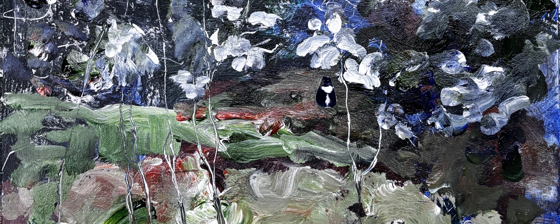 What I think I can see is that there is a tunnel and it curves to the right but there isn’t enough change of tone to illustrate that. I’m quite taken with the patterns, especially in the grass/pond, and also the white foliage (last summer’s Golden Rod) which I scratched into the paint with a stylus. These are foreground elements and these need to take their place in that capacity while still being fragile. Then I need to make better sense of the scramble of elements towards the top; at the moment some of them look more like a giant spider than a mash-up of overlapping branches and twigs curving into a central space! Tomorrow and tomorrow and tomorrow, to-borrow from the Bard. (Macbeth https://www.poetryfoundation.org/poems/56964/speech-tomorrow-and-tomorrow-and-tomorrow)