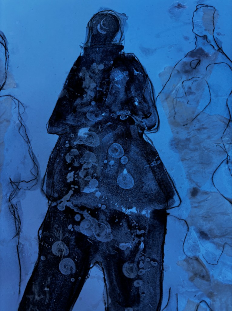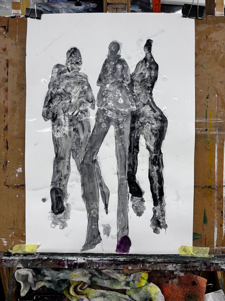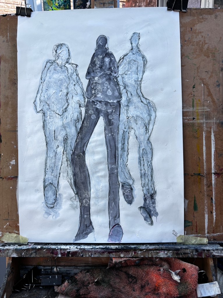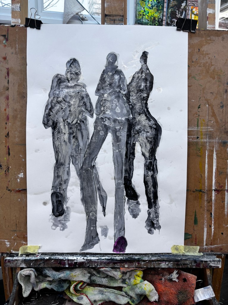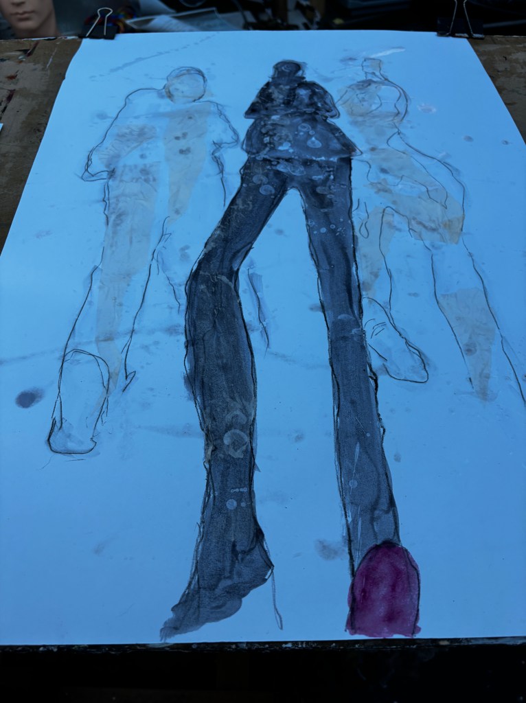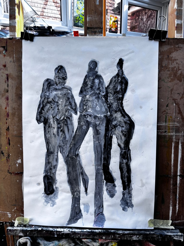 4th April. I’ve discovered I can fool my phone into disregarding its spectral adjustments by swooping it up and snapping before it’s had time to implement them. Unfortunately, that doesn’t help with focus or framing! Below is a series of photographic ‘stealth raids’ on the painting, aimed at finding the best of the bunch to take forward. Significantly, I had at this point, applied paint to the two other figures and as usual, I’m regretting doing that, so I’m thought-experimenting some inventive solutions to this, given time travel is currently not an option. Whitewashed and re-drawn with watercolour pencil as before but they don’t work as before because of the textures added by the paint and tissue paper applications and probably because the spontaneity isn’t there.