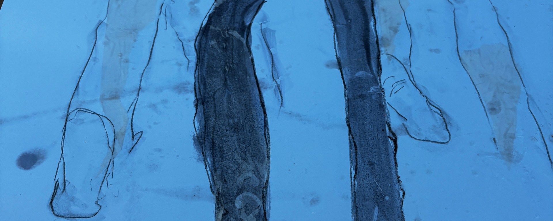 4th April. I’ve discovered I can fool my phone into disregarding its spectral adjustments by swooping it up and snapping before it’s had time to implement them. Unfortunately, that doesn’t help with focus or framing! Below is a series of photographic ‘stealth raids’ on the painting, aimed at finding the best of the bunch to take forward. Significantly, I had at this point, applied paint to the two other figures and as usual, I’m regretting doing that, so I’m thought-experimenting some inventive solutions to this, given time travel is currently not an option. Whitewashed and re-drawn with watercolour pencil as before but they don’t work as before because of the textures added by the paint and tissue paper applications and probably because the spontaneity isn’t there.
