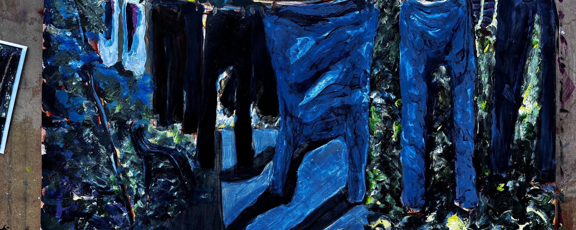 I’ve very rarely, if ever, tackled fabrics in my paintings so how better to break that duck than by tackling many fabrics wafting about on a washing line? It was an interesting challenge as reflected by the numbers of interim images, not all of which I’ve posted. In avoiding photographic replication, I relied very much on the style I’ve been developing with landscapes which involves overloaded brushes (I often collect two or three colours at a time) applied in a swirling motion to represent movement. Much of the patio was in shadow at the time but with bright sunlight coming through the leafless vine above so there were deep contrasts to contend with. I liked the drama of that and rather indulged myself in it.