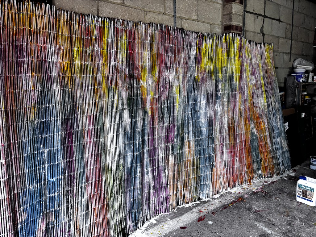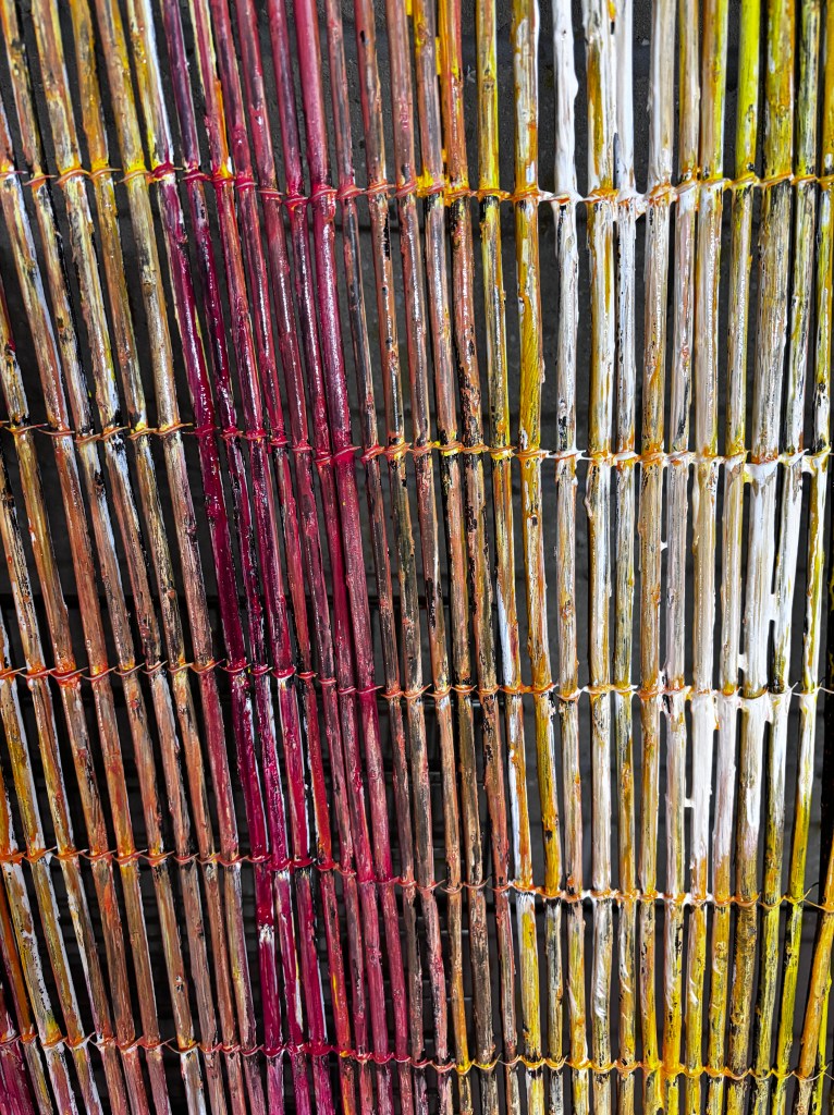 To summarise, this is the middle phase where I’ve used ordinary acrylics in patches on a coat of dry, brilliant white, household paint. Neatness was never an aim, the intent was to make a colourful screen that would take on some of the visual flutter of foliage by being imprecise and almost wave-like. It also suits my painting style whereby revealing and hiding patches of colour has become a tool for adding texture in layers. The behaviour of bamboo strapped together in a large bundle means the surface is not level and there are gaps between each piece.